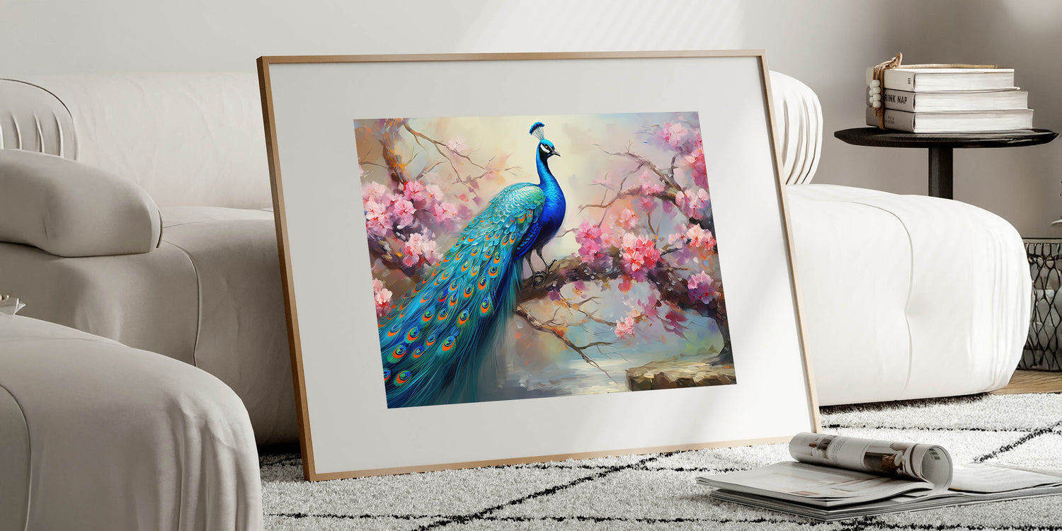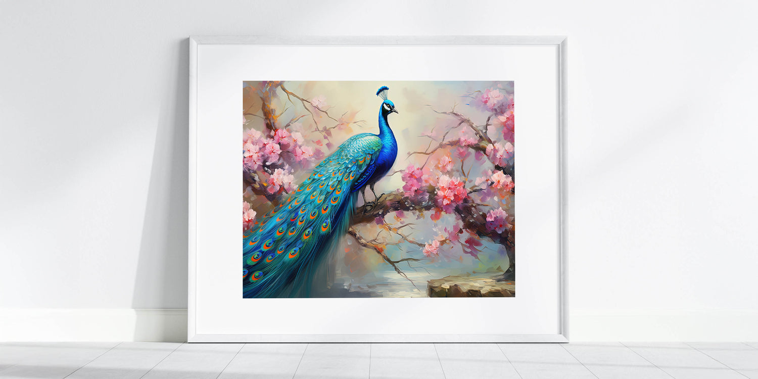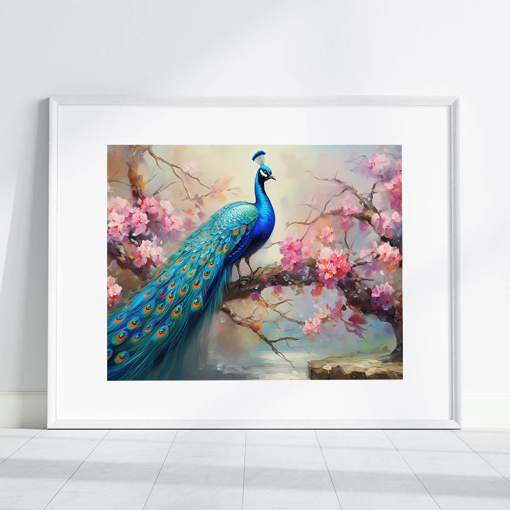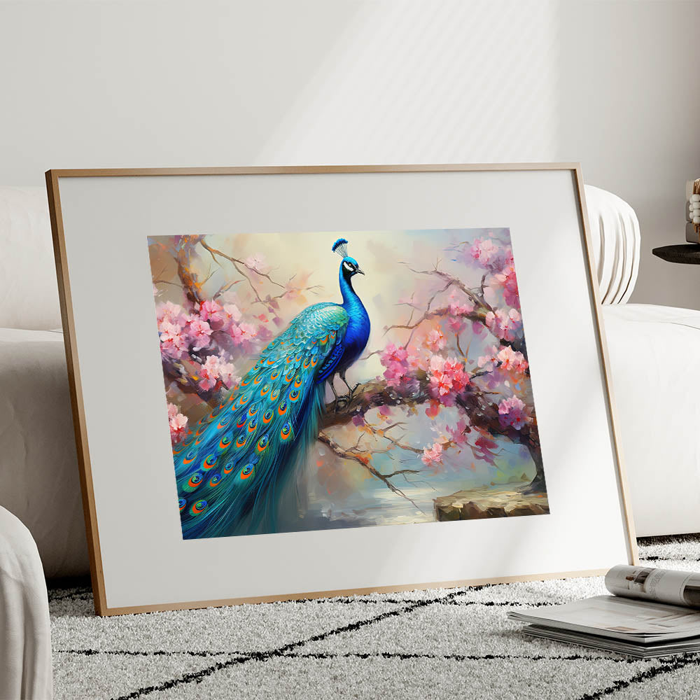 Add a touch of vibrant beauty to your home with this Peacock in Bloom Wall Art. This stunning piece features a graceful peacock perched amidst blossoming cherry trees, with its iridescent feathers in shades of blue and green contrasting beautifully against the soft pink blossoms. The artwork captures the essence of spring, bringing a sense of renewal and joy to any space. Available in various formats, including stretched canvas, framed canvas, acrylic glass, and rolled prints, this piece offers versatile options to complement any decor style.
