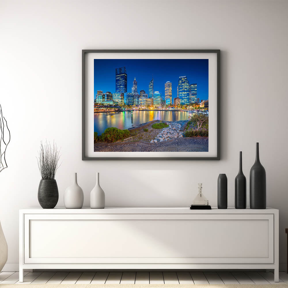 Illuminate your space with the dazzling lights of Perth’s skyline in this stunning Perth Cityscape Print. Capturing the vibrant energy of the city at night, the reflections of the illuminated buildings dance across the water, creating a breathtaking scene. This Perth Wall Art is perfect for those who love urban landscapes and want to bring the beauty of city life into their home or office.