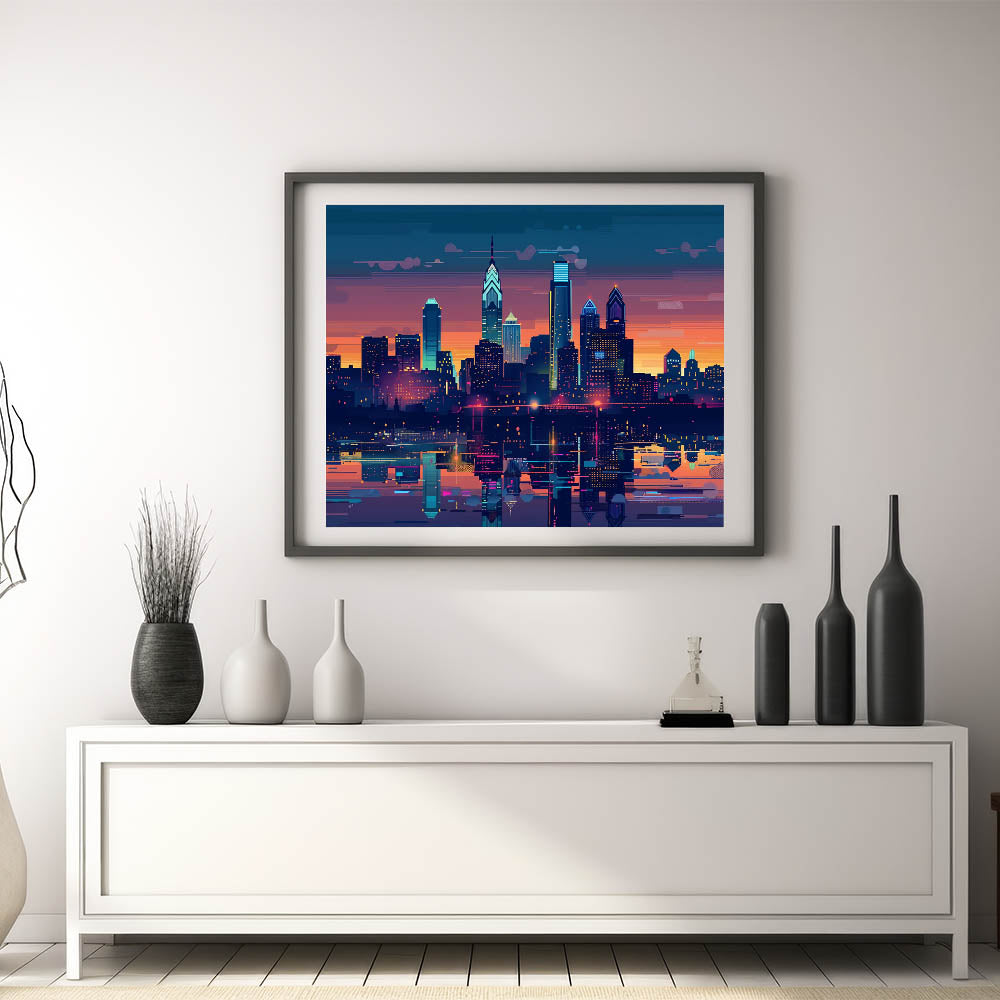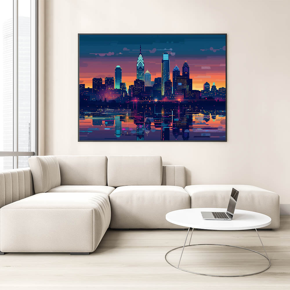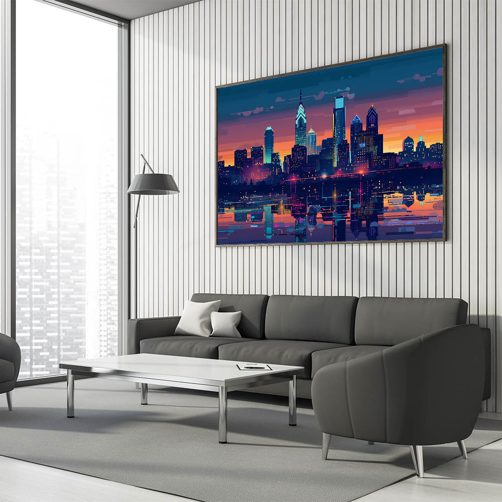 This Philadelphia skyline art is more than just a decorative piece; it’s a statement of modernity and urban energy. Perfect for homes, offices, or contemporary galleries, this artwork will transform any space into a dynamic reflection of Philadelphia's vibrant character. Order now and let this neon-infused cityscape brighten your environment.