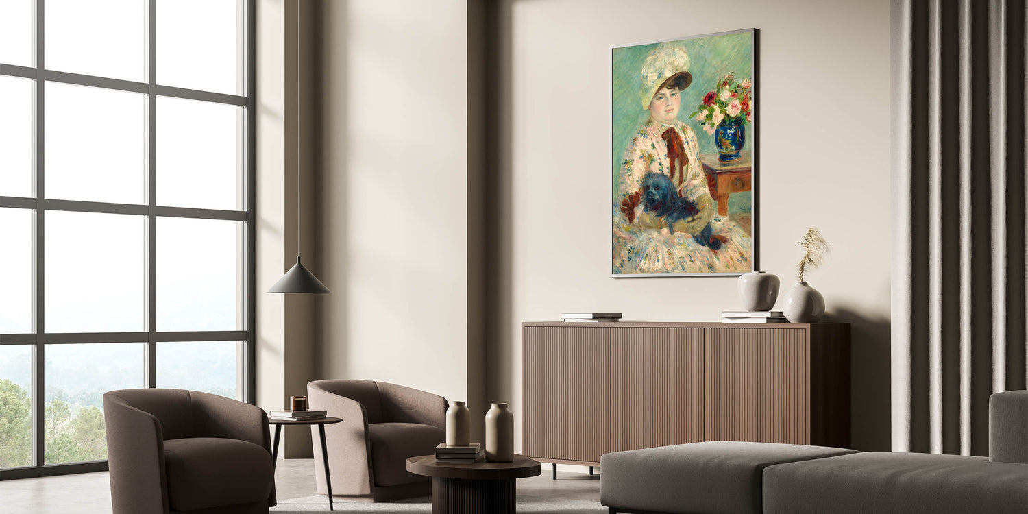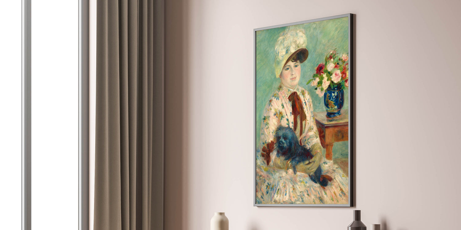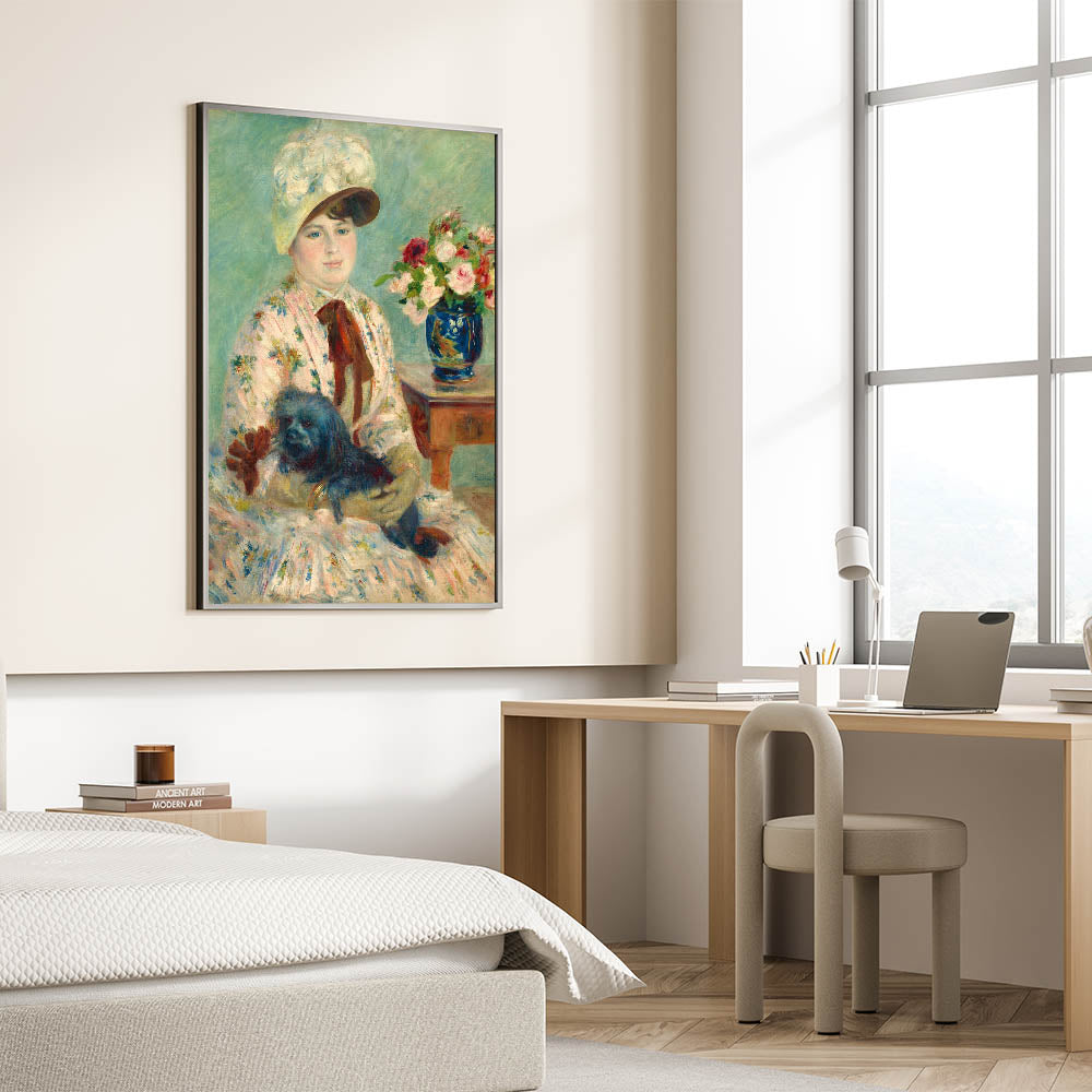 Celebrate the timeless beauty of Pierre-Auguste Renoir's art with this delightful portrait featuring a woman with her dog, surrounded by vibrant floral arrangements. Renoir, one of the most celebrated Impressionist painters, is known for his mastery of light and color. This piece reflects his signature soft brushstrokes and the use of vibrant hues, adding an elegant touch to any room. The serenity of the scene, combined with Renoir's vibrant brushwork, makes this print a captivating focal point in any space.