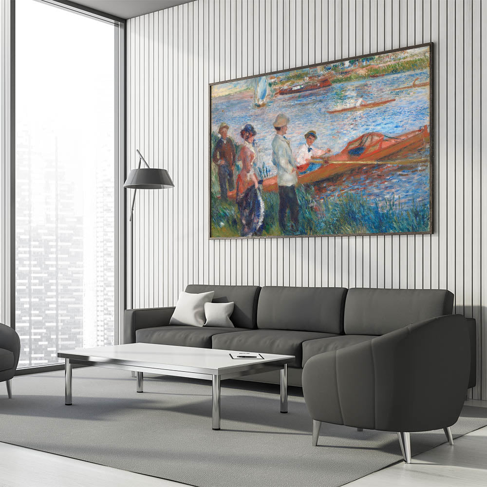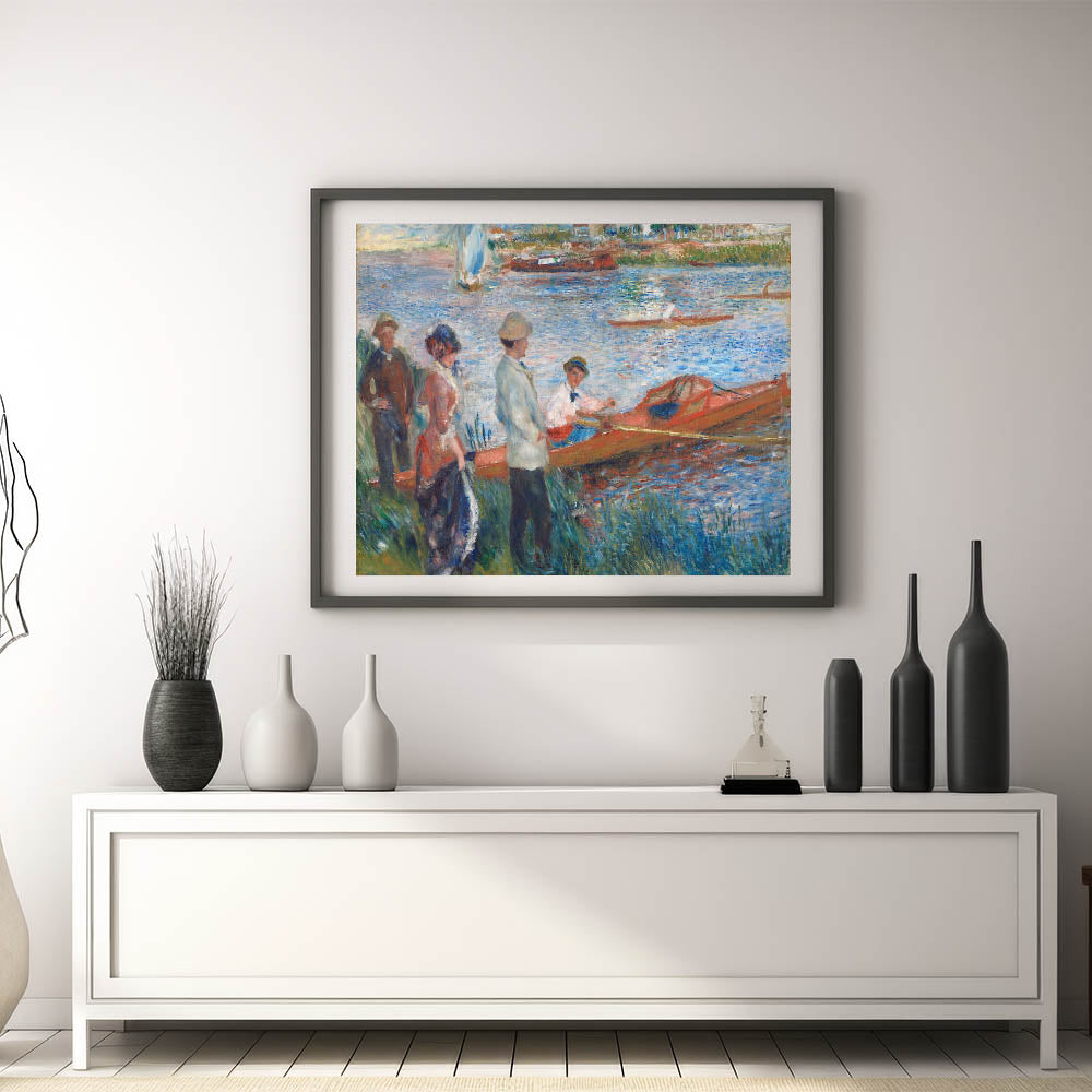 Capture the essence of French Impressionism with Pierre-Auguste Renoir’s magnificent painting of rowers by the riverbank. This scene reflects Renoir's masterful ability to bring life and movement to a tranquil setting through his vibrant brushstrokes and use of natural light. The shimmering reflections on the water and the lively interaction between the figures highlight Renoir’s talent for depicting outdoor scenes with captivating landscapes. This art print is perfect for anyone who appreciates the timeless elegance of Renoir's works and the beauty of Impressionist landscapes.