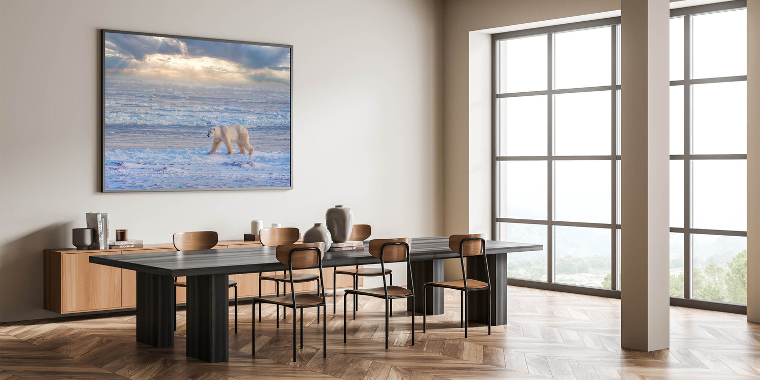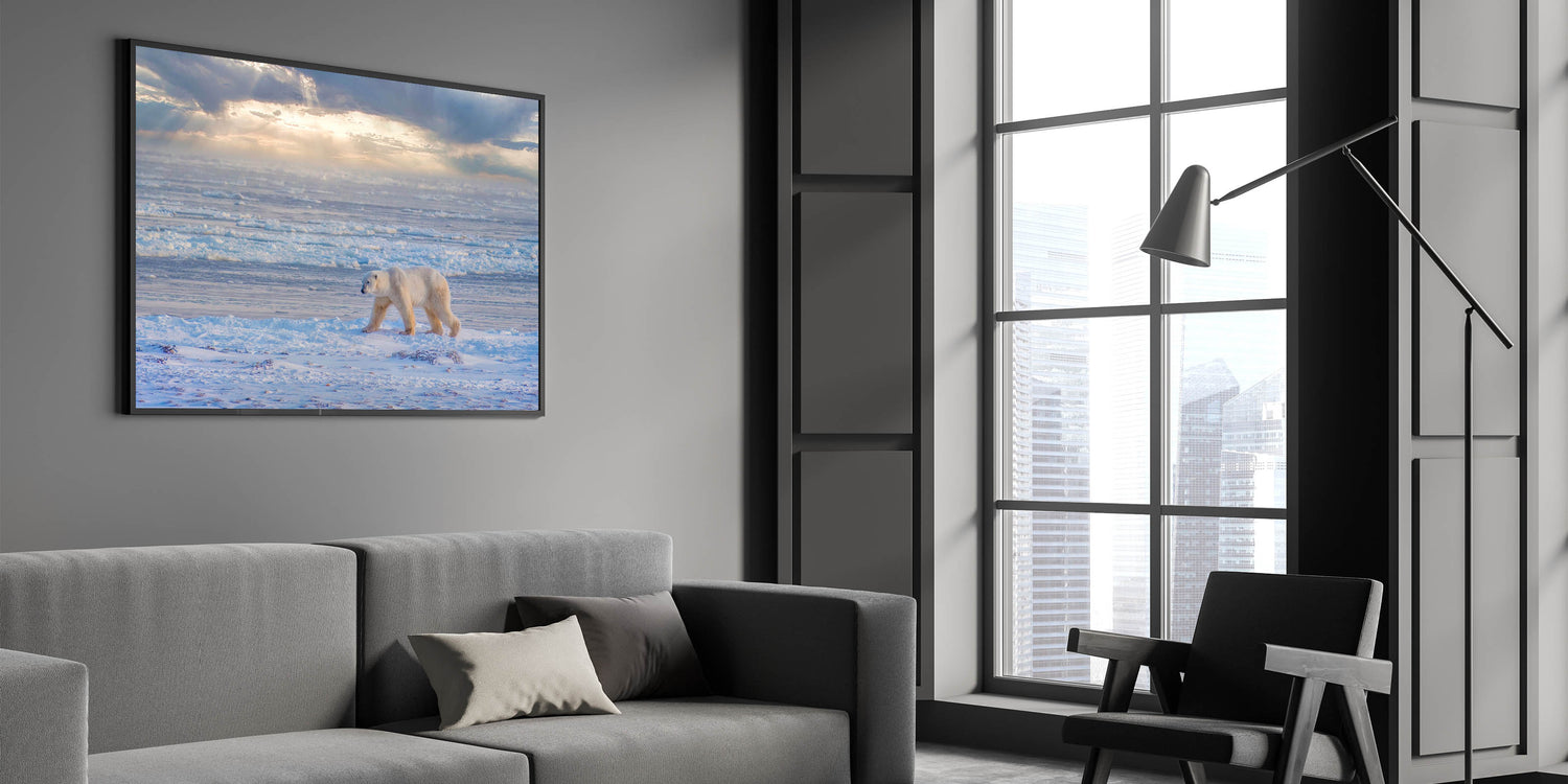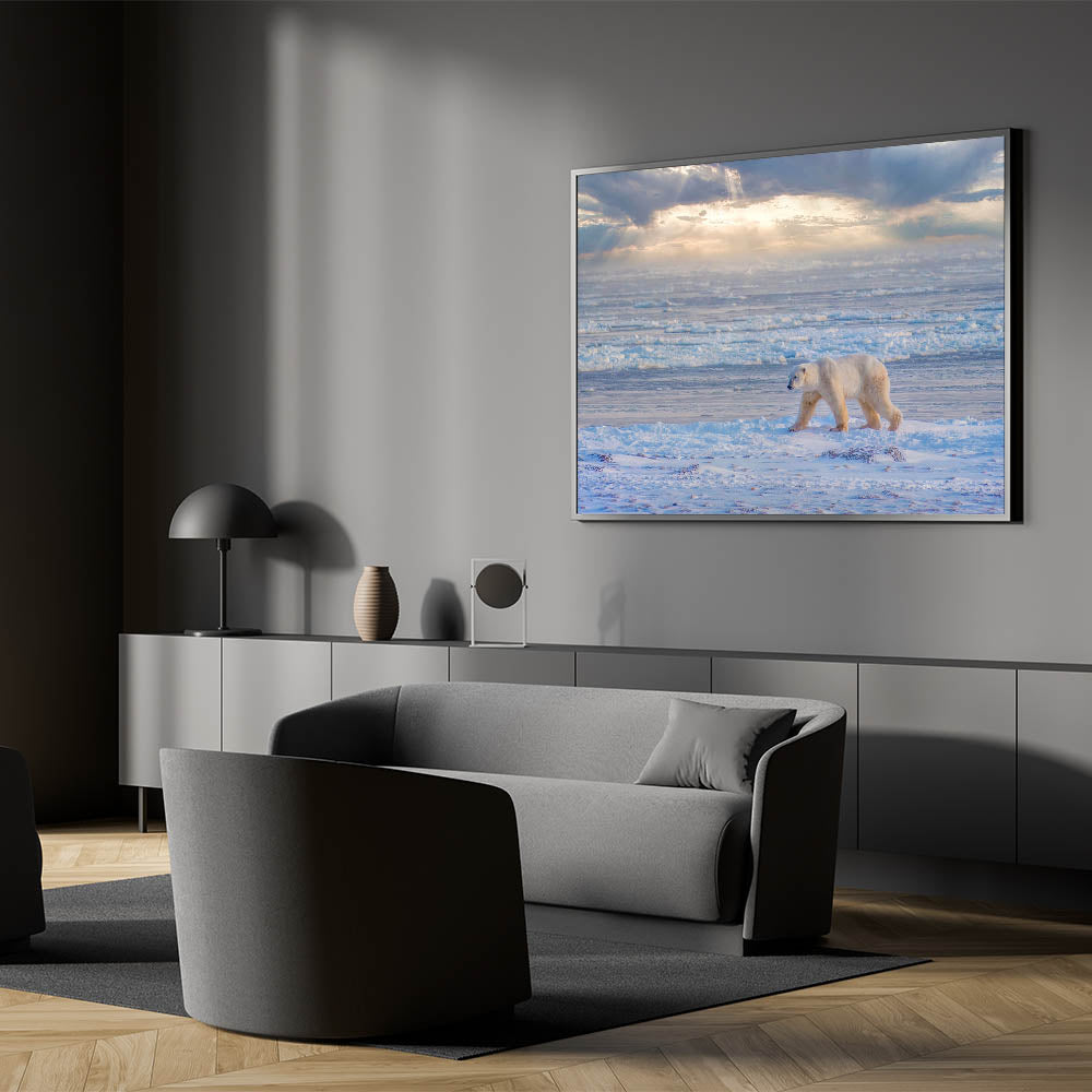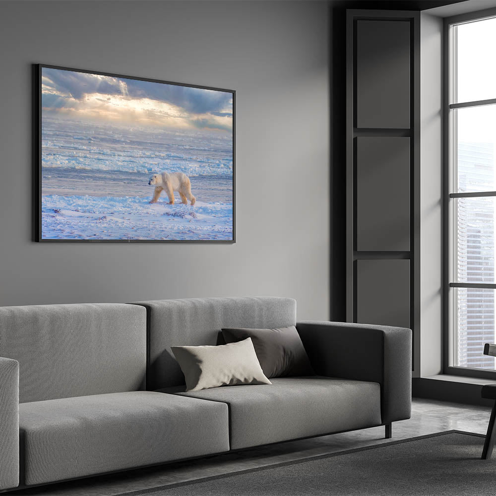 - High-quality print of a polar bear walking across Manitoba’s icy arctic landscape