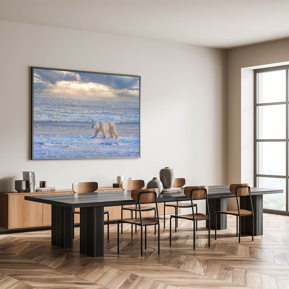 Capture the majestic beauty of the Arctic with this stunning wall art featuring a lone polar bear walking across the frozen landscape of Manitoba. The bear, set against a backdrop of icy seas and soft light breaking through the clouds, embodies the wild and untamed beauty of nature in its purest form. The calm yet powerful presence of the polar bear in this wintry scene will inspire admiration for the Arctic's serenity and strength.
