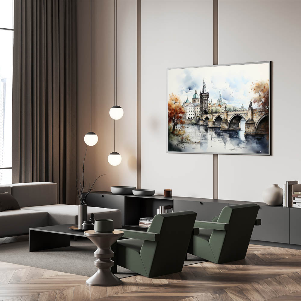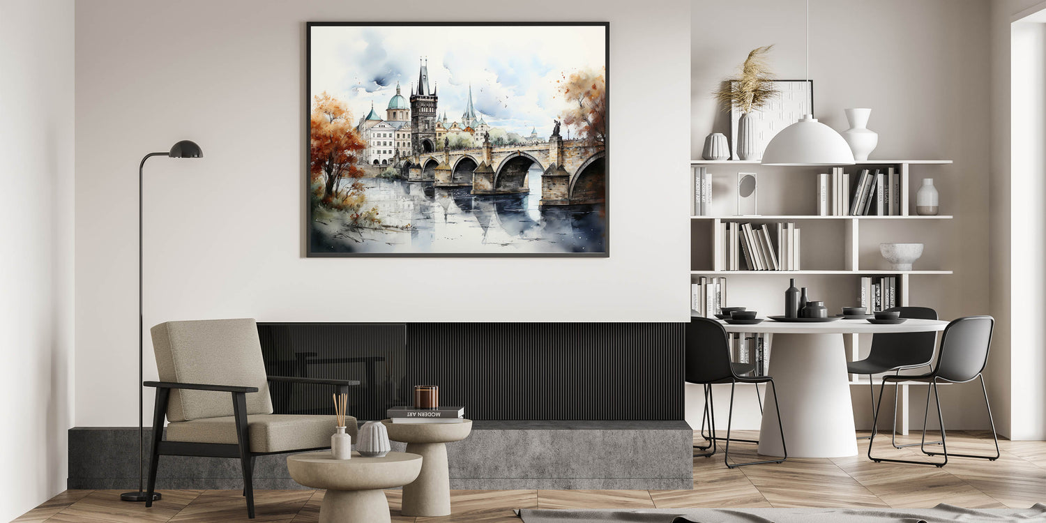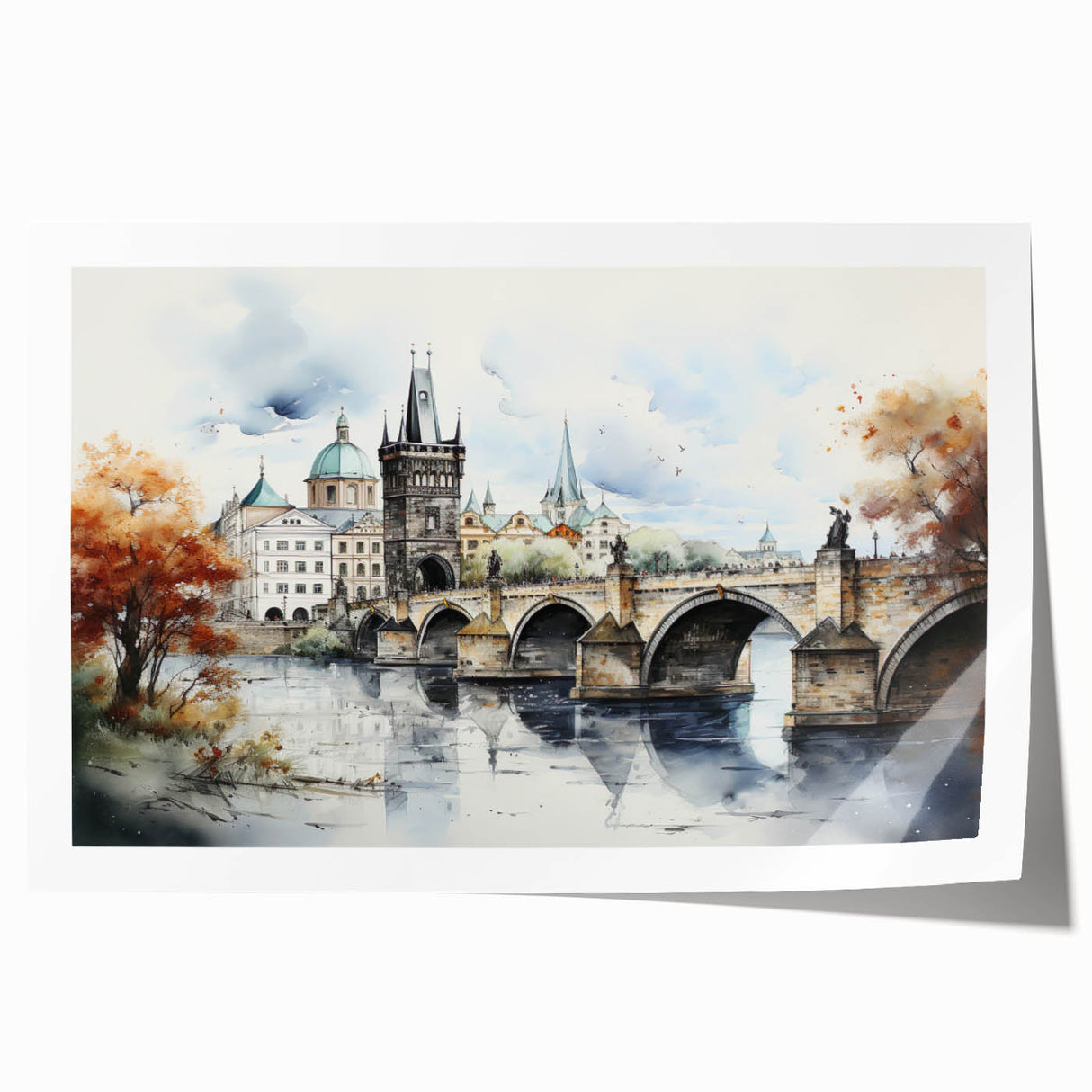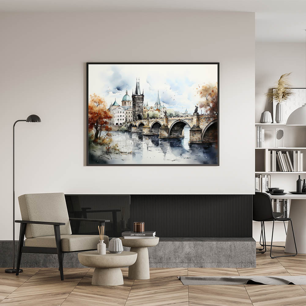 Embrace the artistic essence of Prague with our "Prague Landmark Art," depicting the Charles Bridge and surrounding architecture in a stunning autumn watercolor style. This artwork brings to life the historic charm and romantic ambiance of Prague through soft brush strokes and vibrant fall colors.