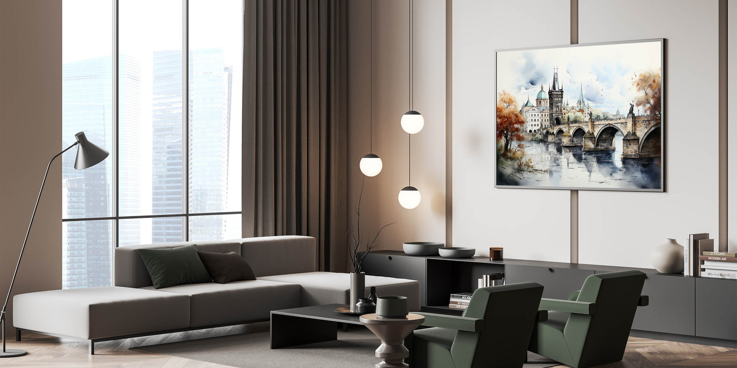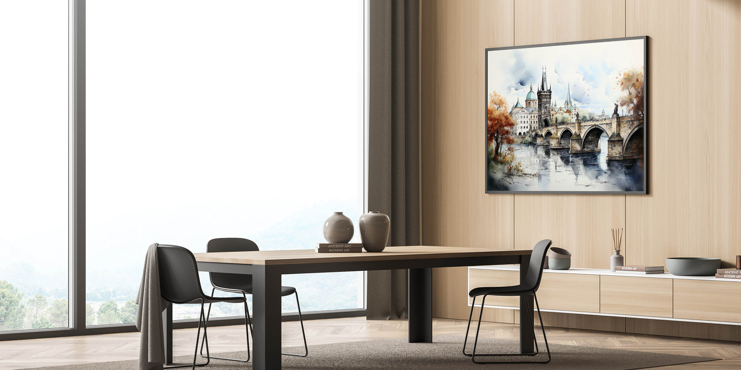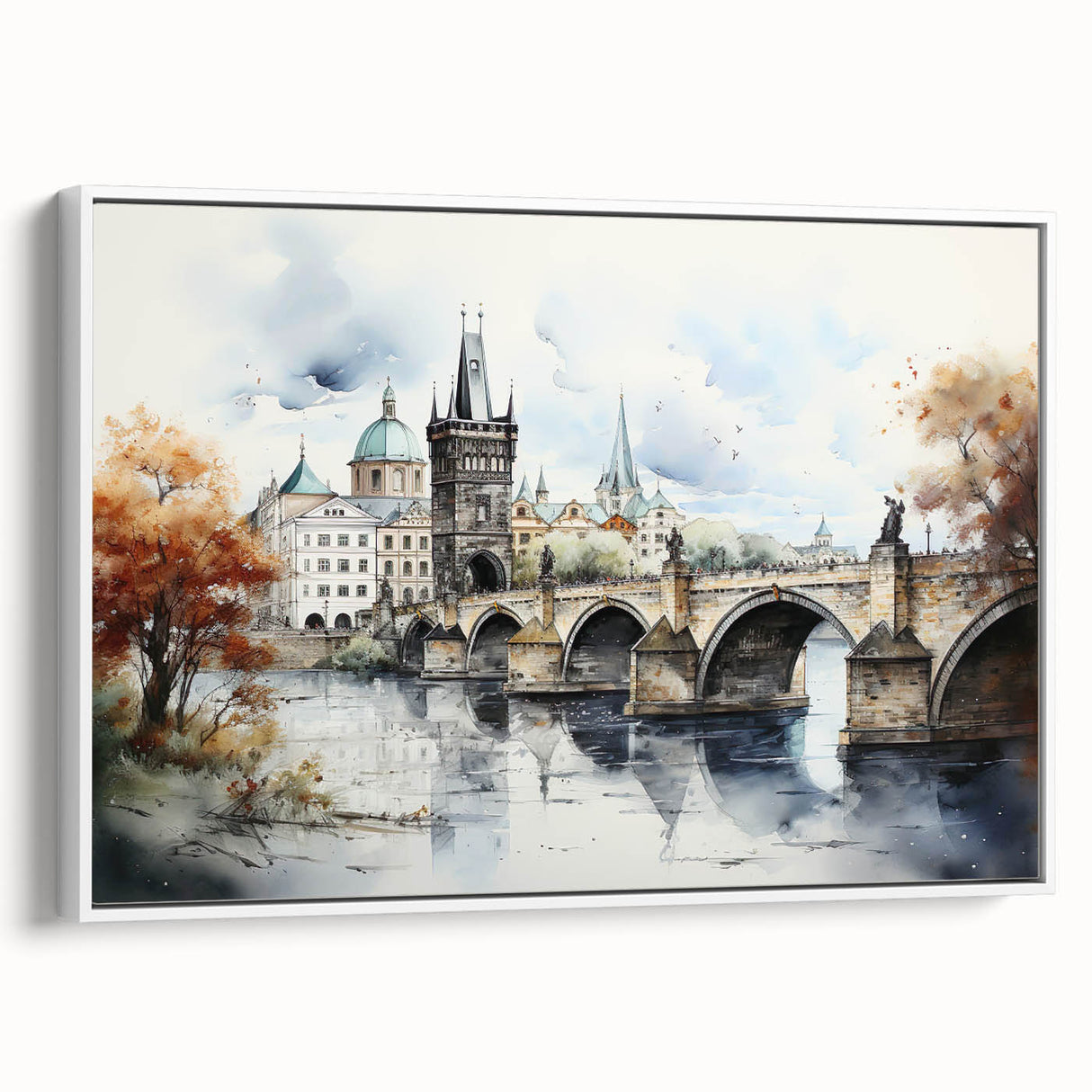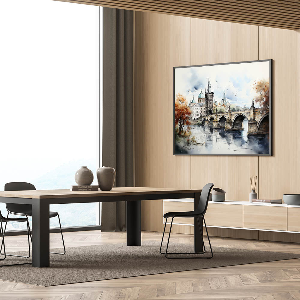 Embrace the artistic essence of Prague with our "Prague Landmark Art," depicting the Charles Bridge and surrounding architecture in a stunning autumn watercolor style. This artwork brings to life the historic charm and romantic ambiance of Prague through soft brush strokes and vibrant fall colors.