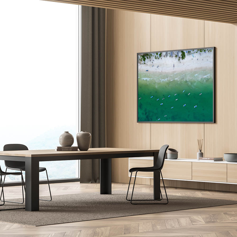 Capture the tranquil beauty of Mexico’s Quintana Roo with this stunning aerial view wall art. Featuring a scenic stretch of sandy beach lined with boats floating gently in the calm green waters, this artwork brings a sense of serenity and coastal charm to any room. The peaceful waves rolling onto the shore and the vibrant colors of the boats provide a unique perspective of Mexico’s coastal paradise.