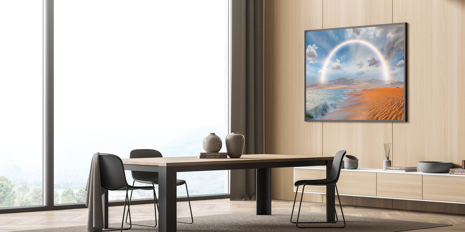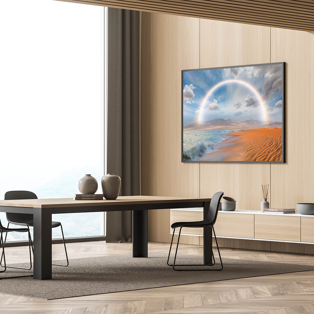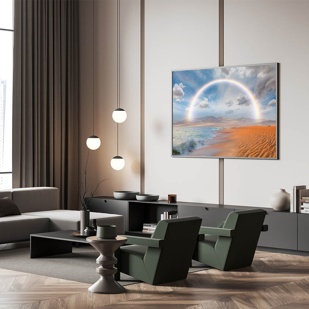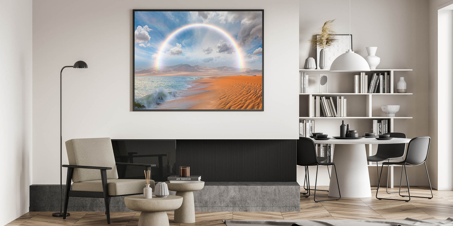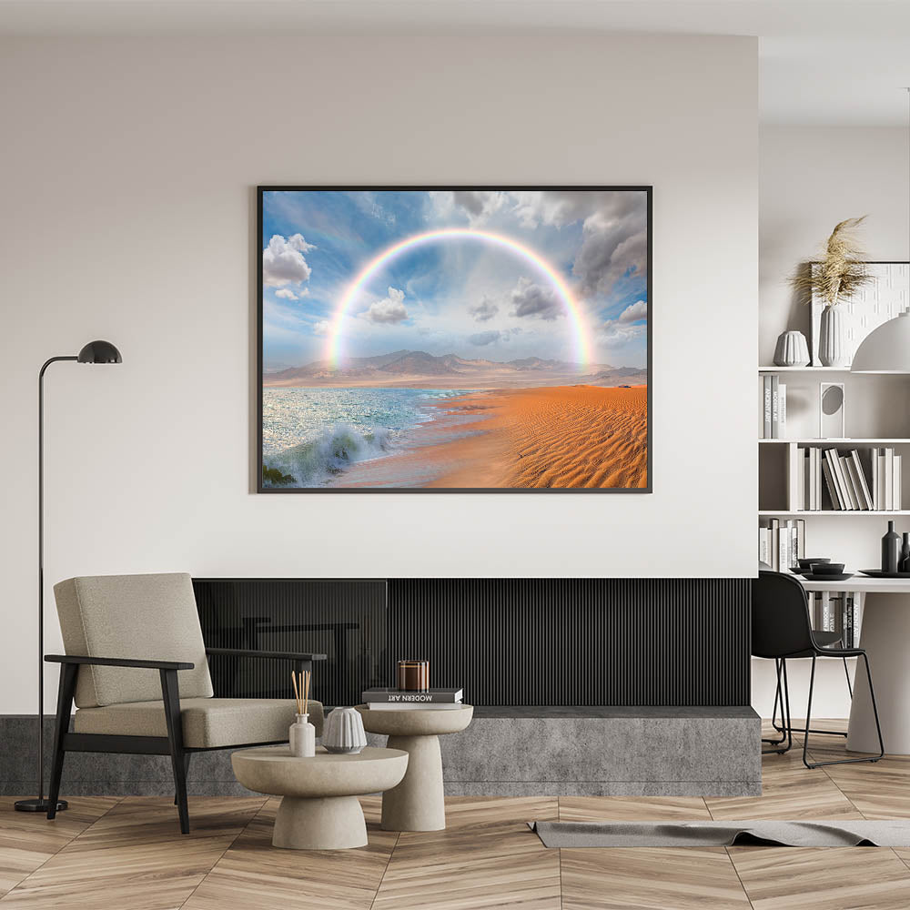 Experience the breathtaking beauty of Namibia with this unique wall art featuring a radiant rainbow stretching over the desert and ocean. This stunning combination of natural elements captures the serene meeting of sand, sea, and sky, bringing an ethereal and magical atmosphere into your space. The soft hues of the rainbow against the rich desert sand and ocean waves make this artwork an eye-catching piece, perfect for any room in need of a peaceful yet striking focal point.
