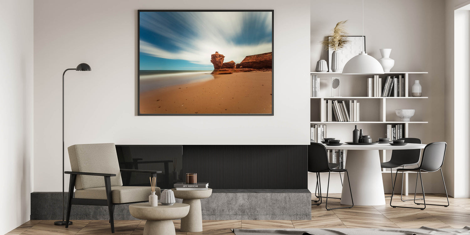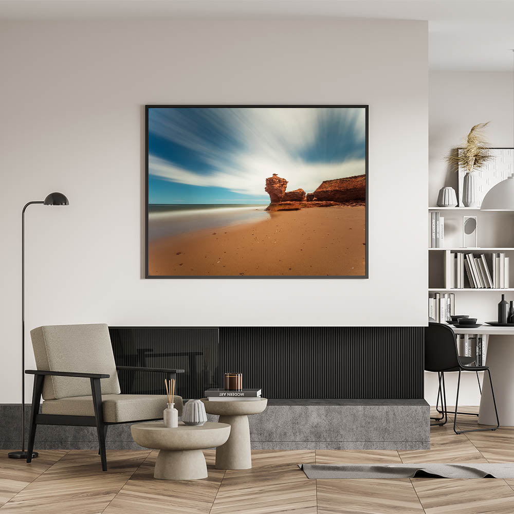This Canada landscape art piece features the famous red rocks of PEI, sculpted over centuries by the Atlantic waters. Whether you're looking to enhance your home with a unique art print or gift someone a special piece of Canada’s natural heritage, this beautiful wall art is the perfect choice. Available in formats such as stretched canvas or framed acrylic, this artwork brings coastal tranquility into your space.