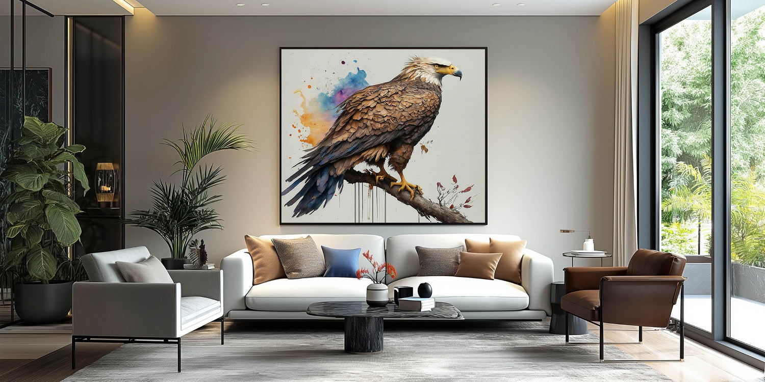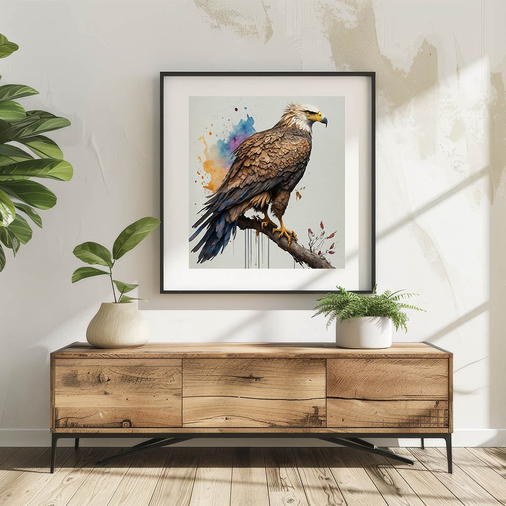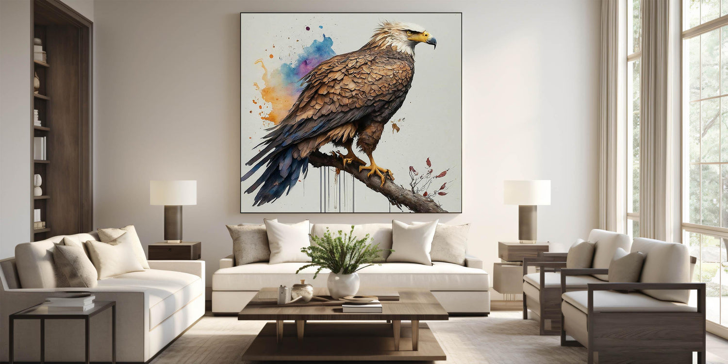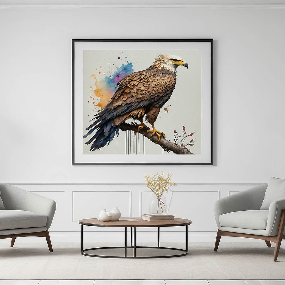 Elevate your interior decor with this stunning portrayal of a majestic eagle from our Birds of Prey collection. This exquisite artwork captures the eagle in a proud, commanding stance, perched gracefully on a branch. The detailed textures of the feathers and the eagle's focused gaze bring a sense of realism and power to the piece, while the vibrant background splashes of orange, blue, and purple add a modern, artistic flair.