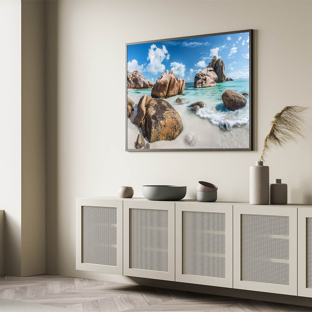 Bring the rugged beauty of a secluded beach into your home with our Rocky Beach Paradise Wall Art. This stunning piece captures the serene contrast between massive, weathered boulders and the crystal-clear turquoise waters that gently lap against the shore. The unique composition and natural elements make this artwork a perfect addition to any room, infusing your space with a sense of tranquility and timeless beauty.