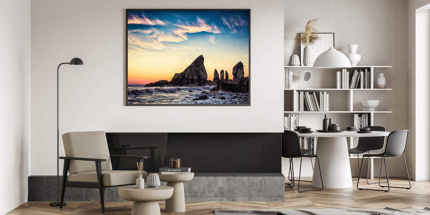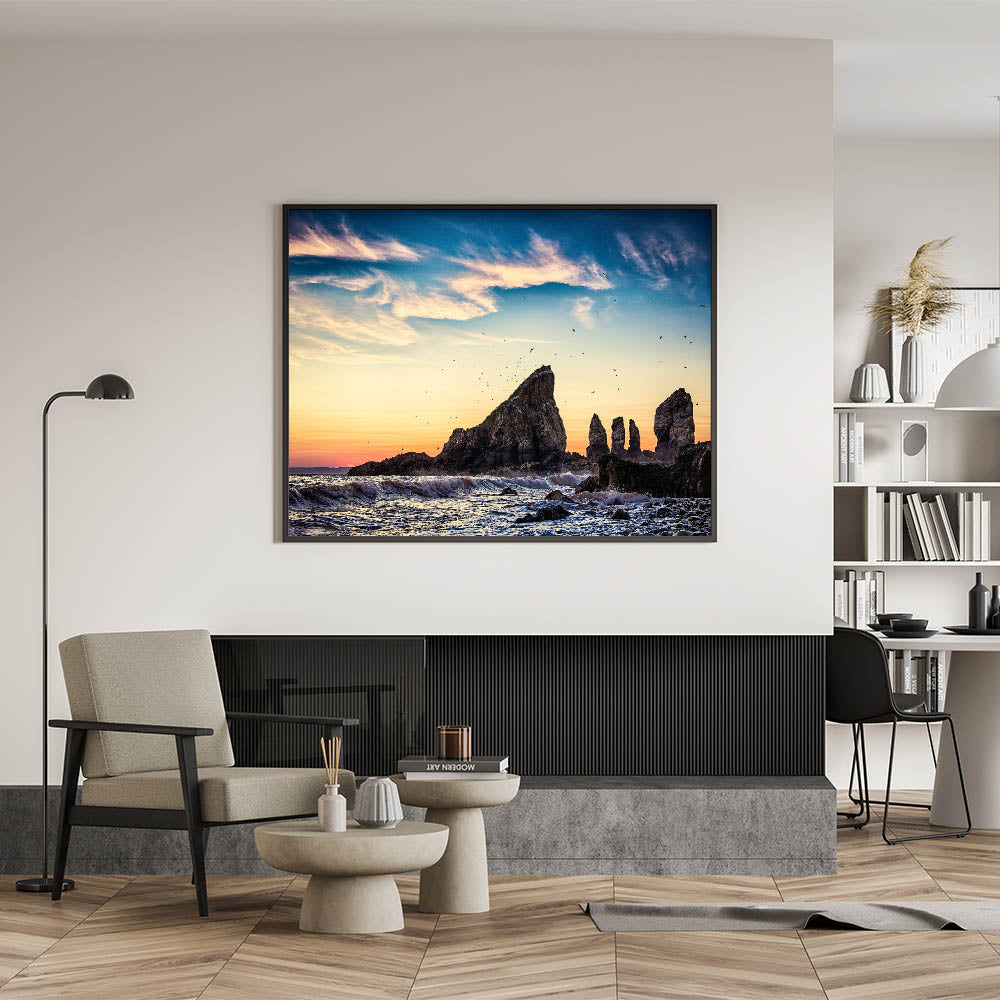 Immerse yourself in the raw beauty of Nova Scotia’s rugged coastline with this captivating wall art. The towering rocky formations stand against the backdrop of a golden sunset, with waves crashing against the shore and seabirds soaring in the sky. This piece captures the untamed charm of the Atlantic coast, making it a perfect addition to any room that seeks to celebrate nature's grandeur and serenity. The soft hues of the sky transition from golden yellows to calming blues, creating a breathtaking visual that evokes a sense of peace and wonder.