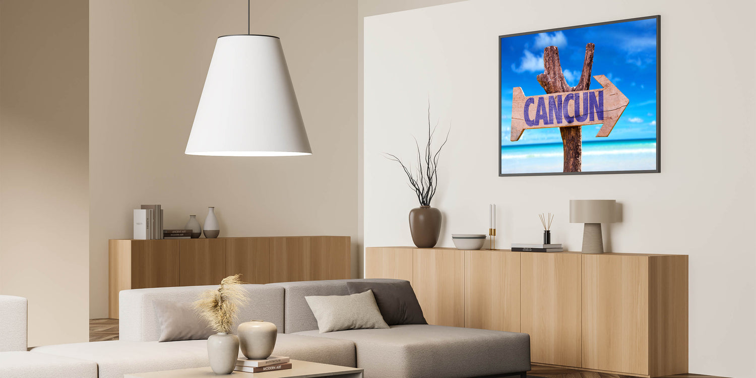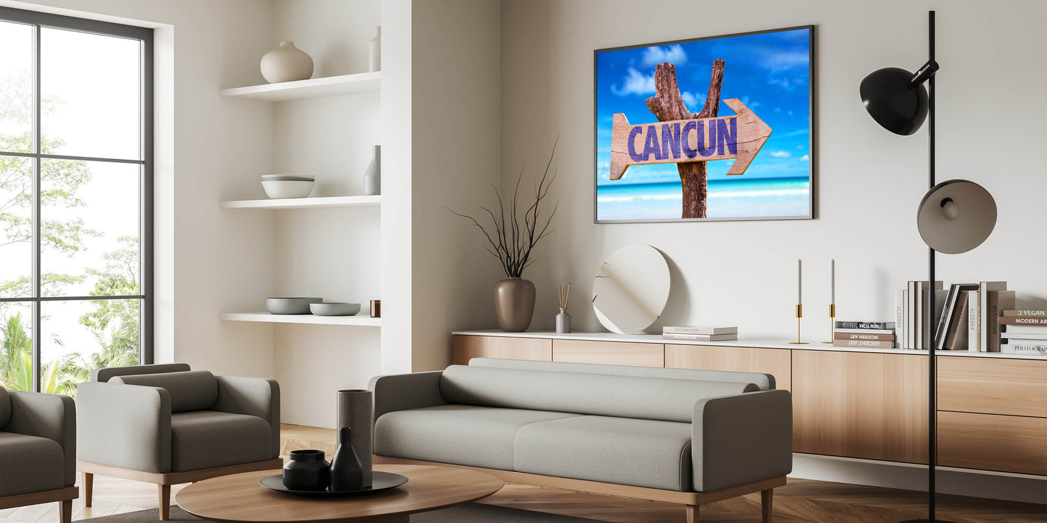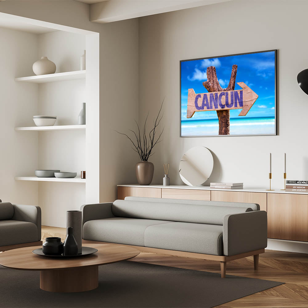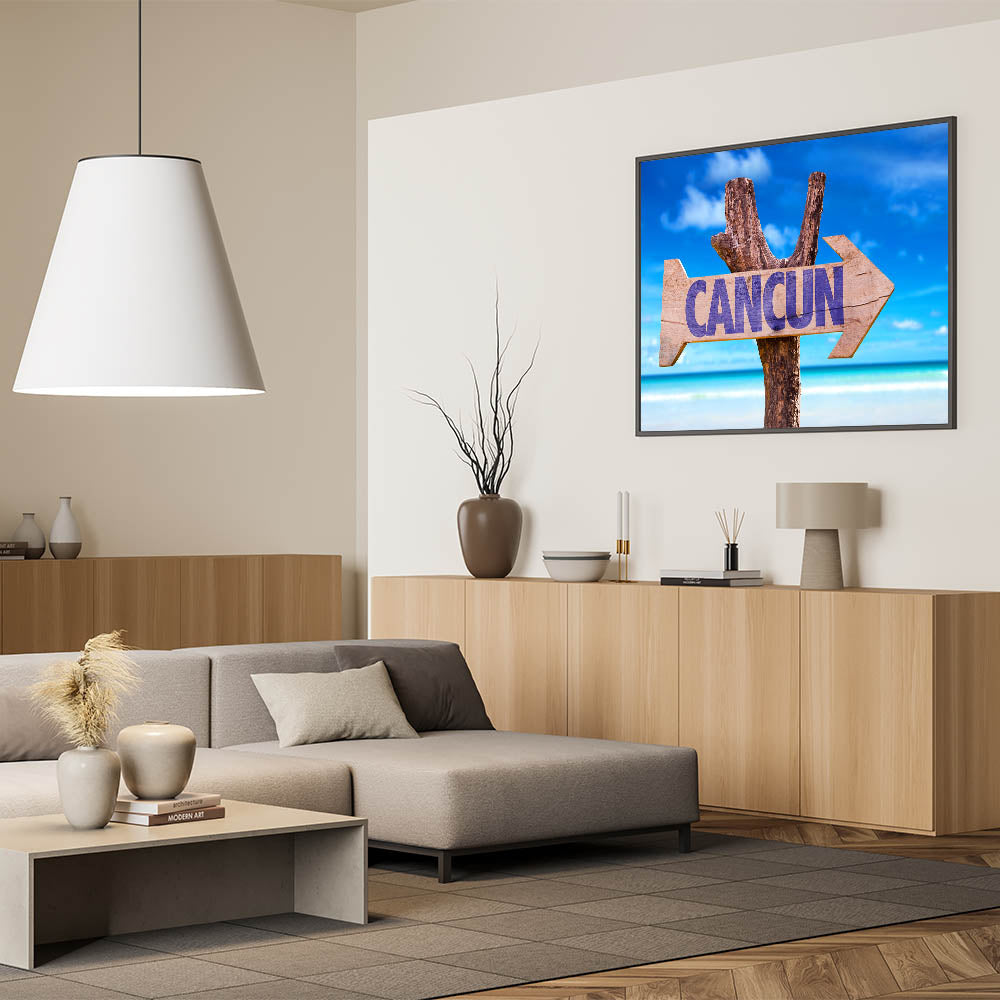 - High-quality Cancun beach prints available in multiple formats, including Stretched Canvas, Framed Canvas, and Acrylic Glass.