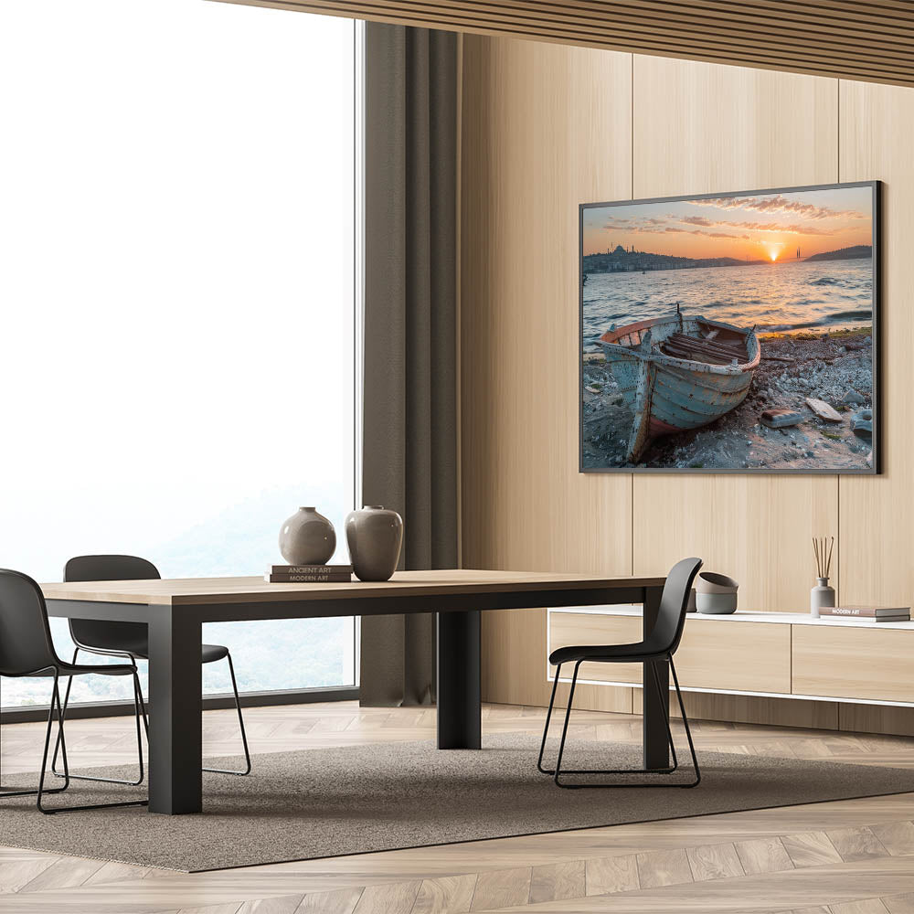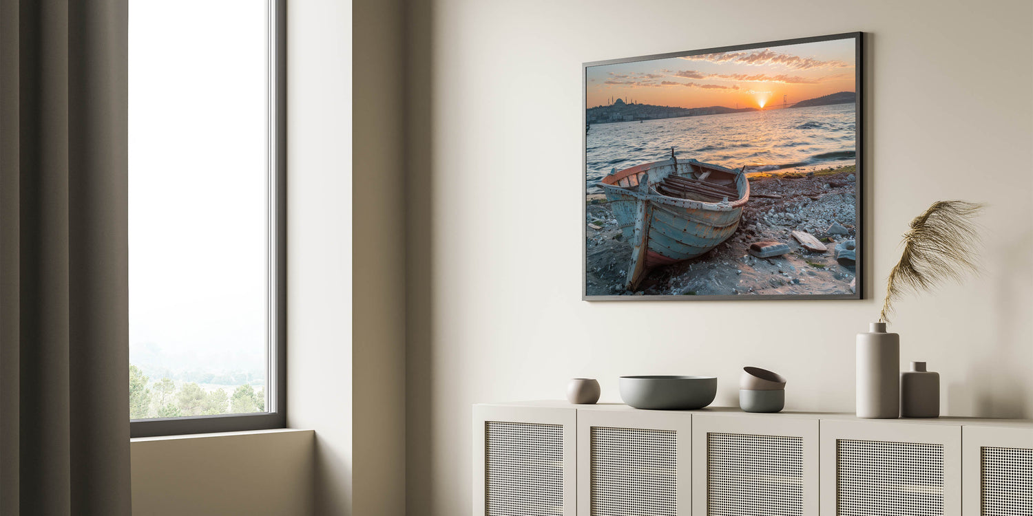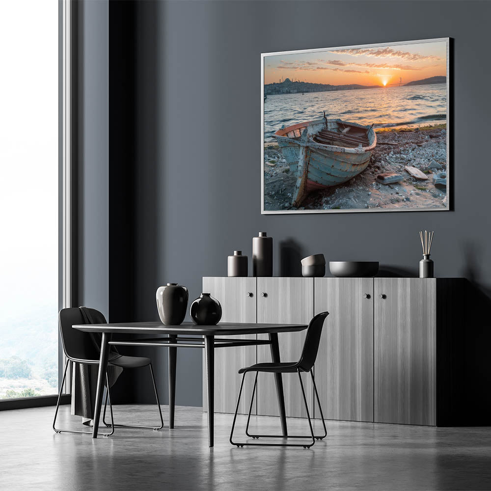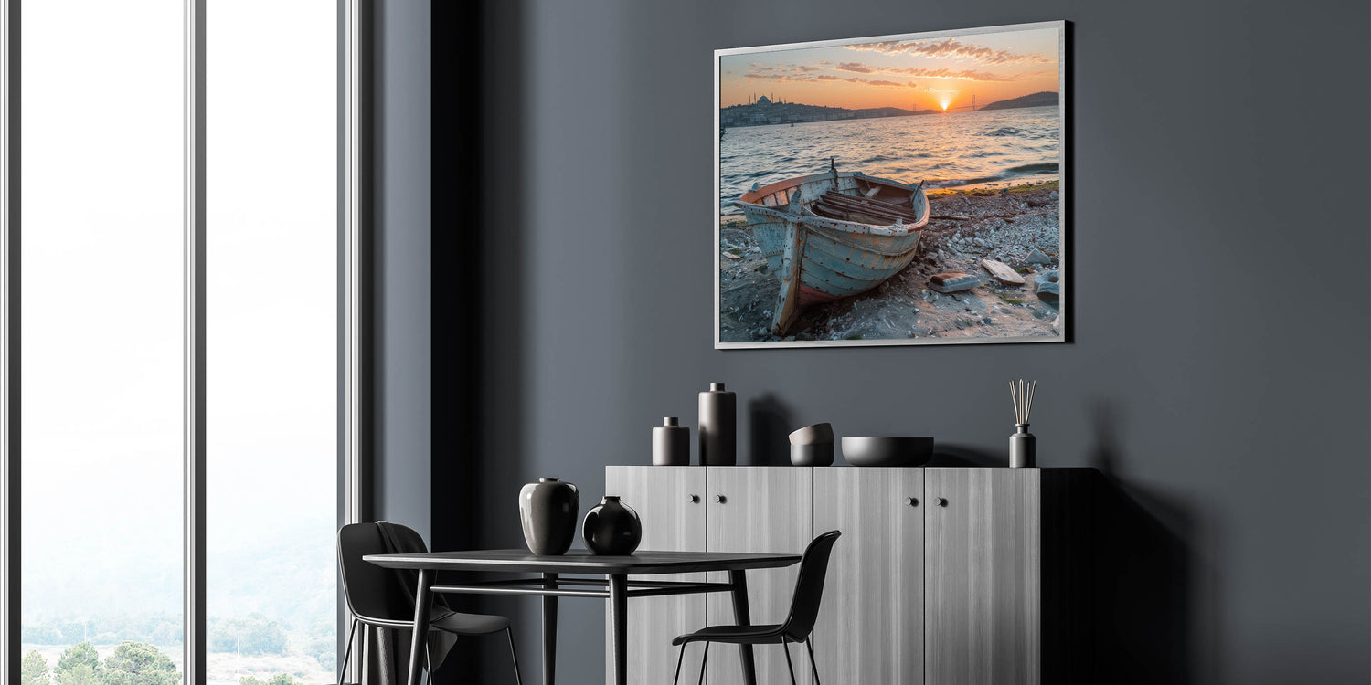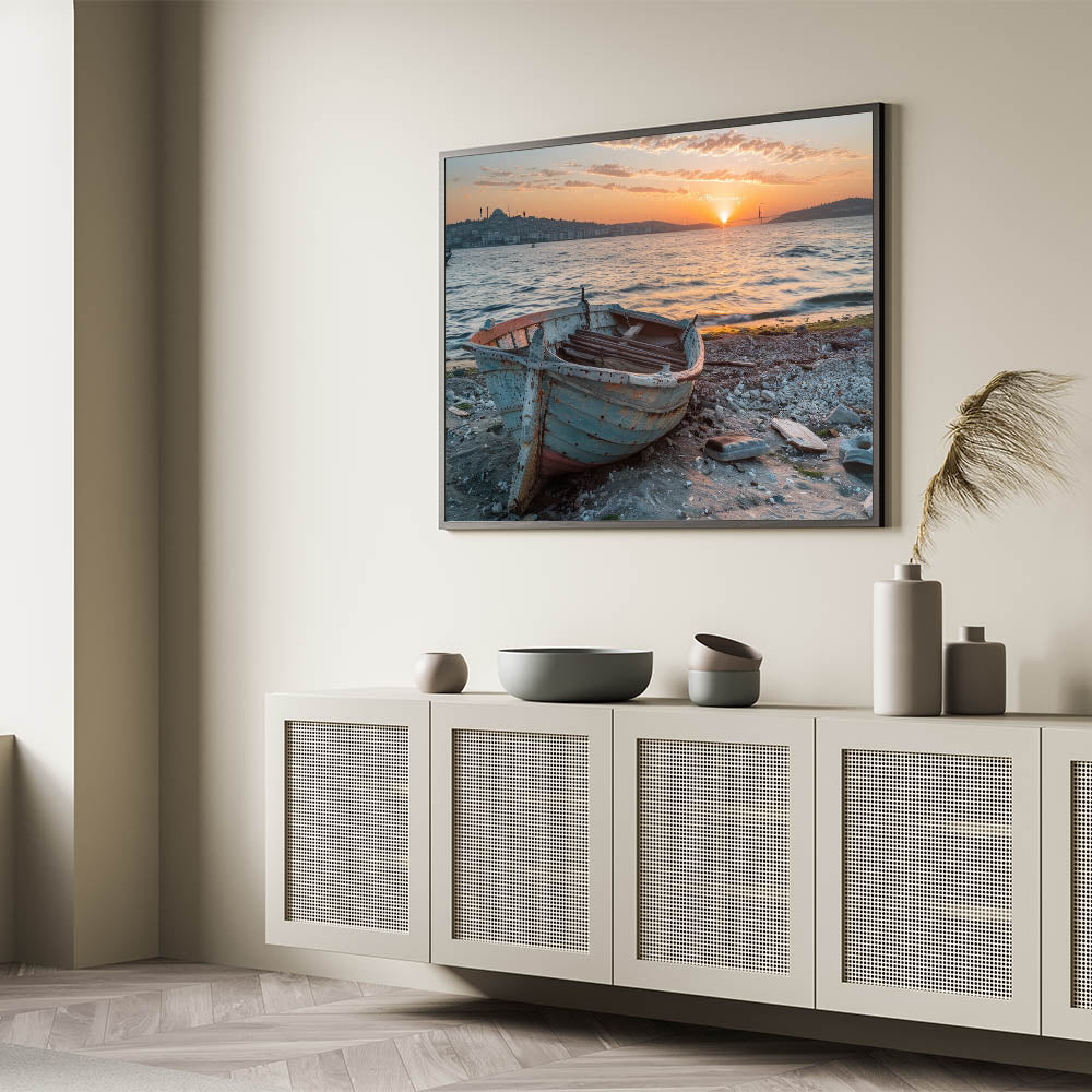 Capture the essence of a coastal journey with this stunning rowboat wall art. This piece features a weathered rowboat resting on a sandy shore, with the backdrop of rolling hills and a vast, tranquil ocean. The rustic texture of the boat, combined with the serene blue sky and distant mountains, evokes a sense of adventure and nostalgia. Perfect for those who love the sea or nautical-themed decor, this handcrafted boat art is available in various high-quality materials, including Stretched Canvas, Framed Canvas, Acrylic Glass, Framed Acrylic Glass, Framed Print, Rolled Canvas, and Rolled Print.