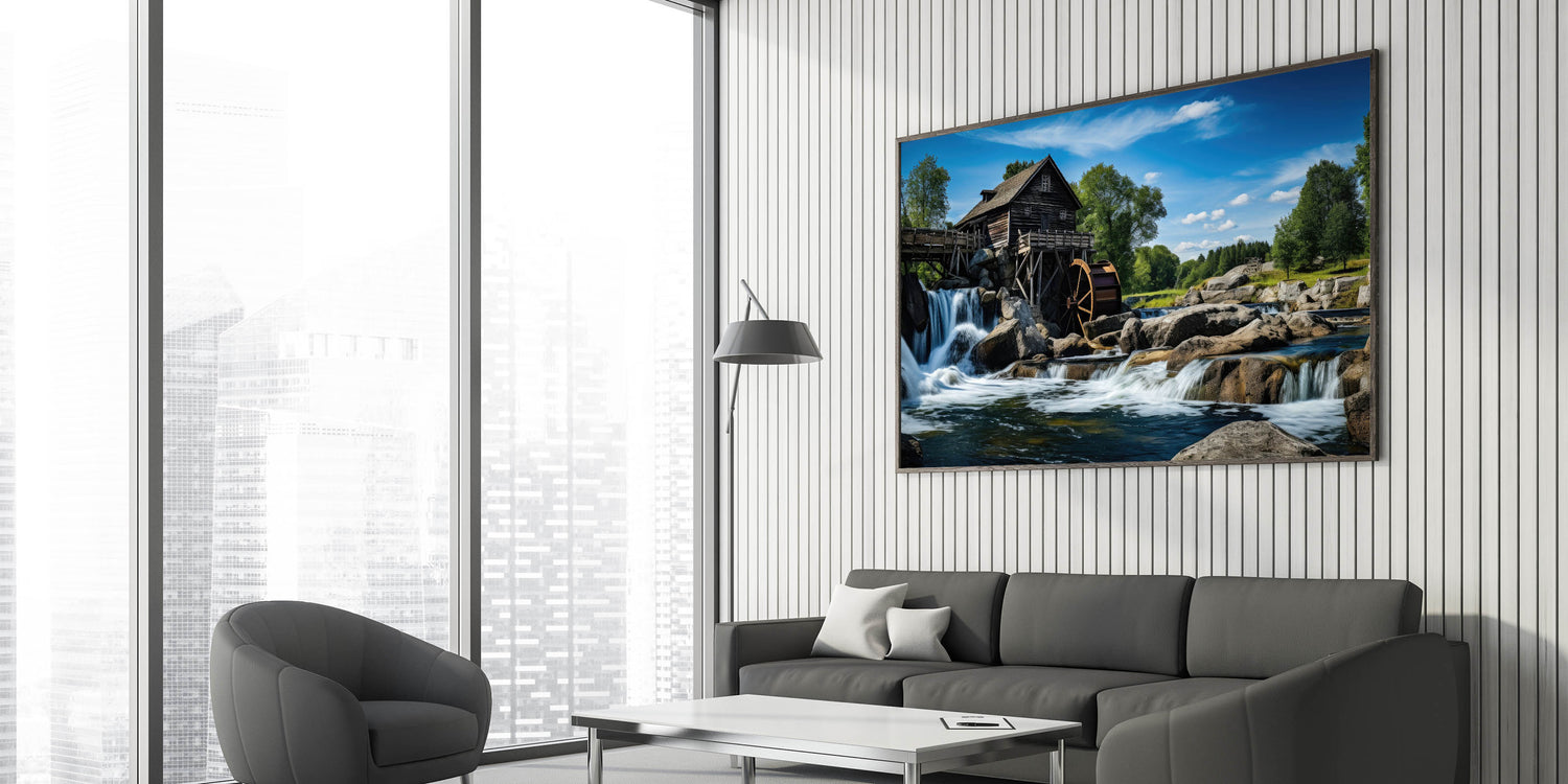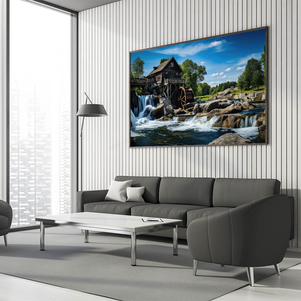 Elevate your space with the majestic beauty of this rustic watermill canvas print. The artwork features a stunning watermill perched above a cascading waterfall, set against the backdrop of a clear blue sky and lush greenery. The powerful flow of the water and the rugged rocks surrounding the mill create a dramatic and serene scene, perfect for adding a touch of natural grandeur to any room.