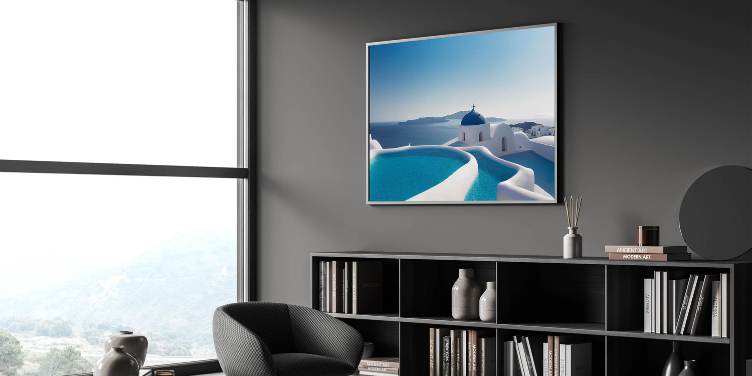 Capture the serene beauty of Santorini with this stunning wall art featuring the iconic whitewashed buildings and deep blue domes set against the sparkling Aegean Sea. This tranquil piece highlights the picturesque views of one of Greece's most famous islands, making it the perfect addition to any space seeking a touch of Mediterranean charm.