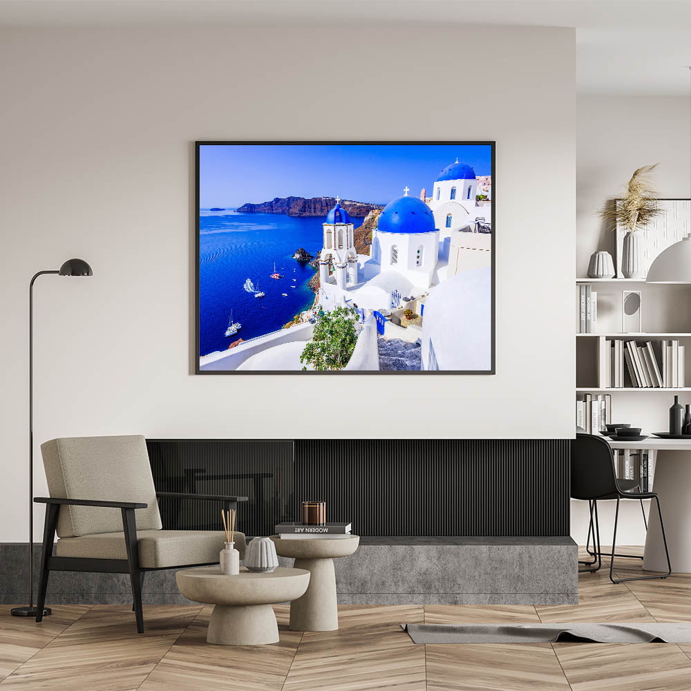 Bring the vibrant beauty of Santorini into your home with this stunning Santorini wall art. Featuring the island’s famous blue domes, whitewashed buildings, and the sparkling waters of the Aegean Sea, this Greece landscape art captures the essence of the Greek islands. The deep blues of the sea and sky contrast beautifully with the crisp white architecture, making this piece perfect for adding a touch of Greek island decor to any space.