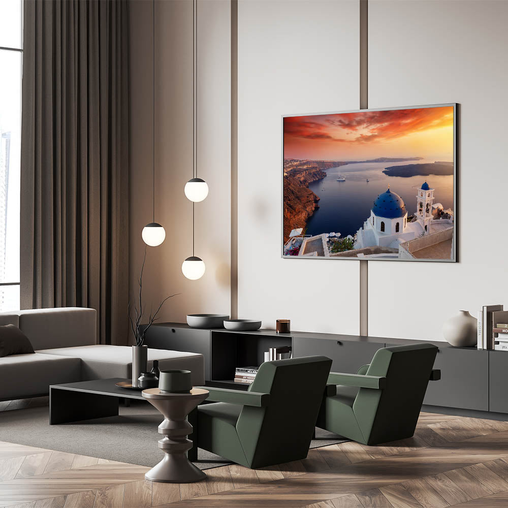 Immerse yourself in the breathtaking beauty of a Santorini sunset with this stunning Santorini wall art. The fiery hues of the sky perfectly complement the calm waters of the Aegean Sea, creating a dramatic contrast with the island’s iconic blue-domed church. This Greece landscape art captures the serene essence of Santorini scenery, making it the perfect addition to any room seeking a tranquil yet vibrant atmosphere.