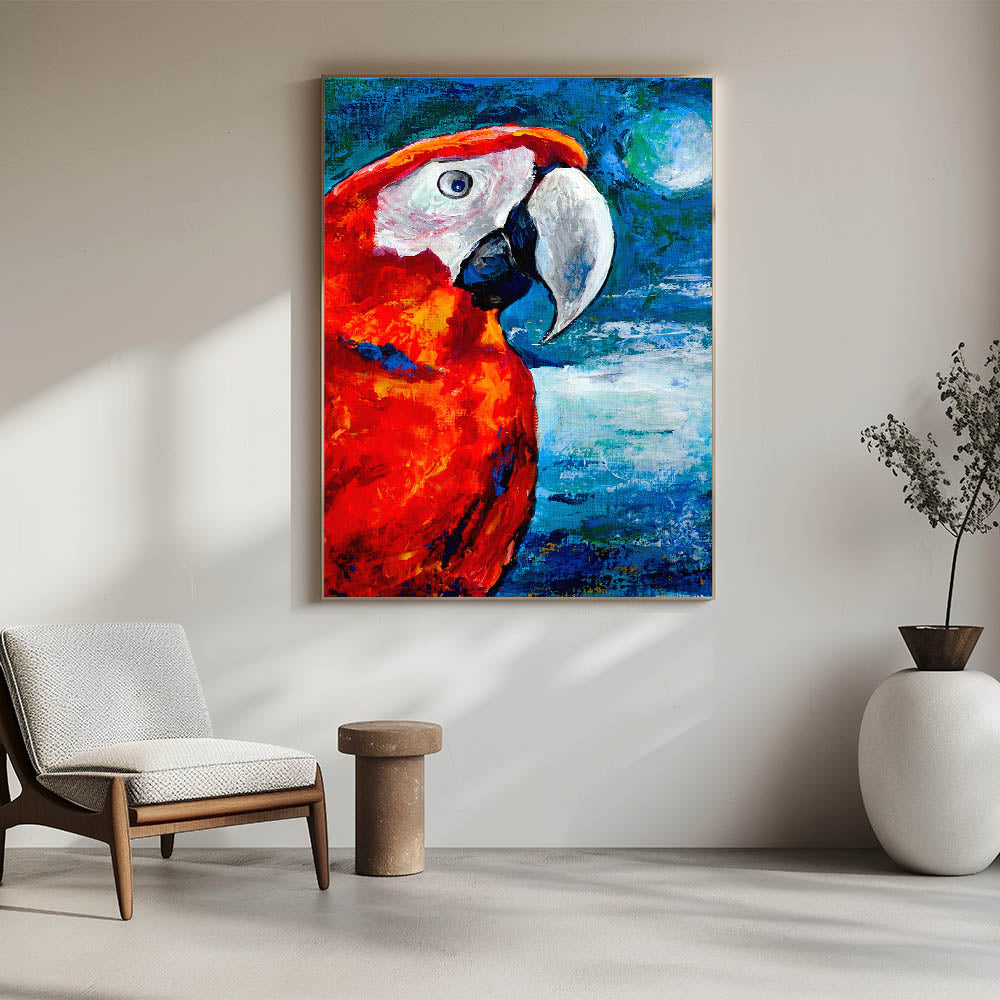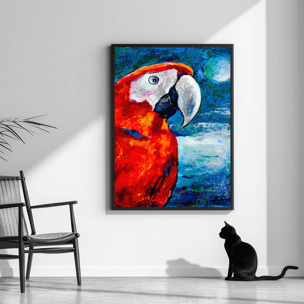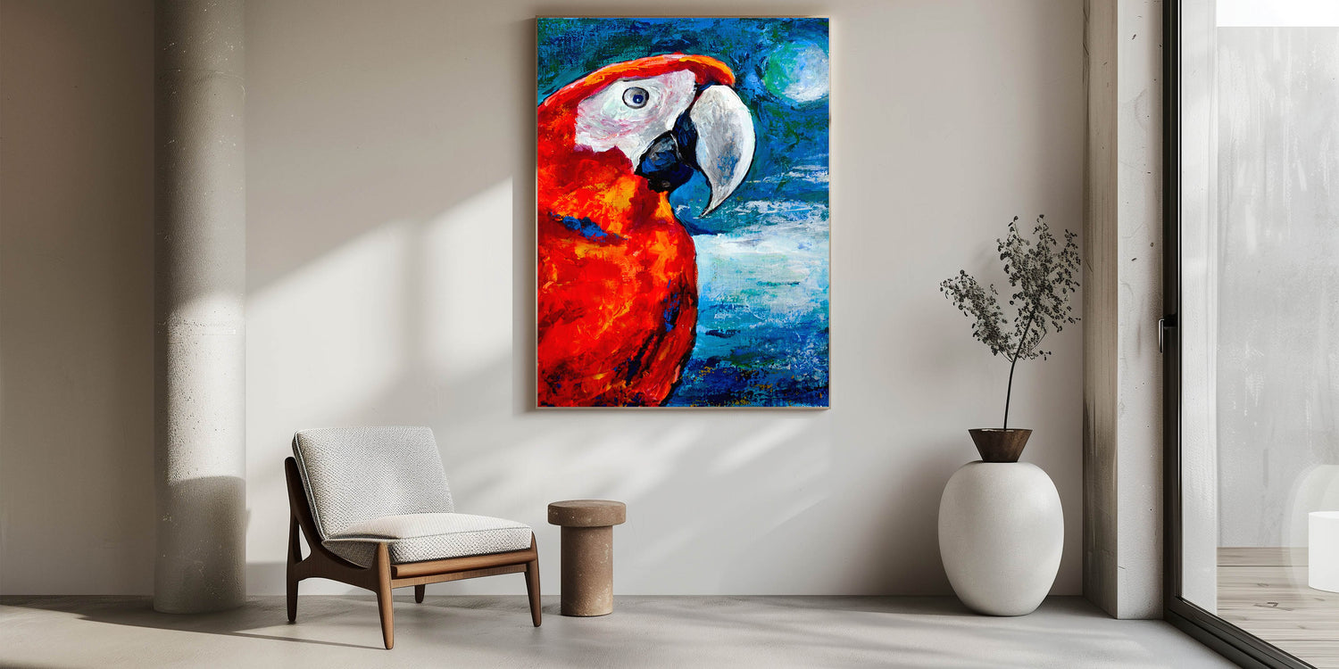 Enhance your living space with the intense vibrancy of this Scarlet Parrot Wall Art. This captivating artwork features a parrot in stunning shades of red and orange, set against a vivid blue background. The bold color palette brings a dynamic and lively energy to any room, making it perfect for those who appreciate striking and unique decor pieces.