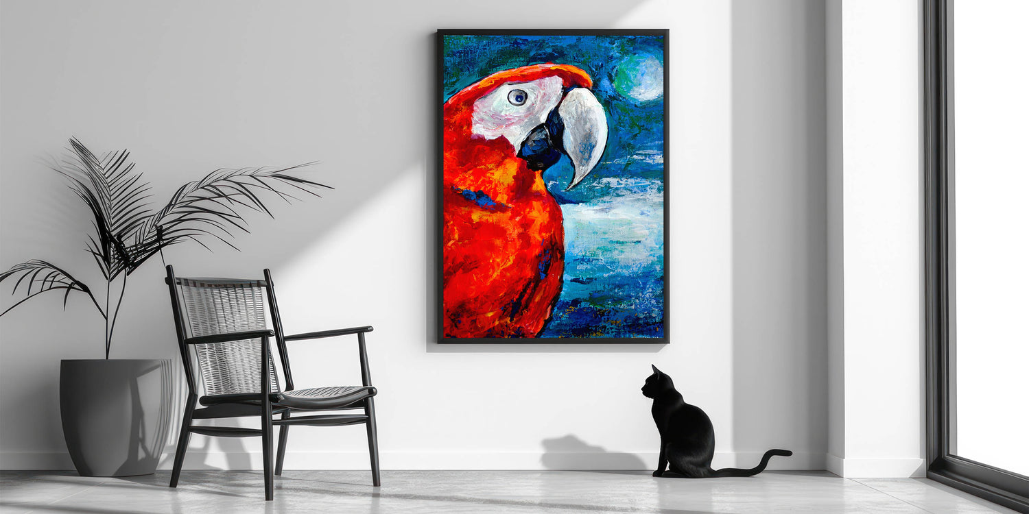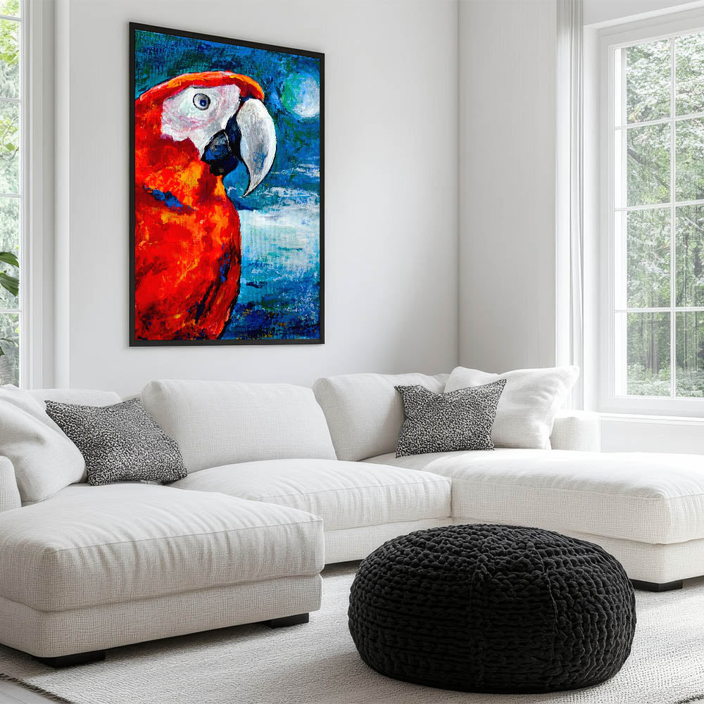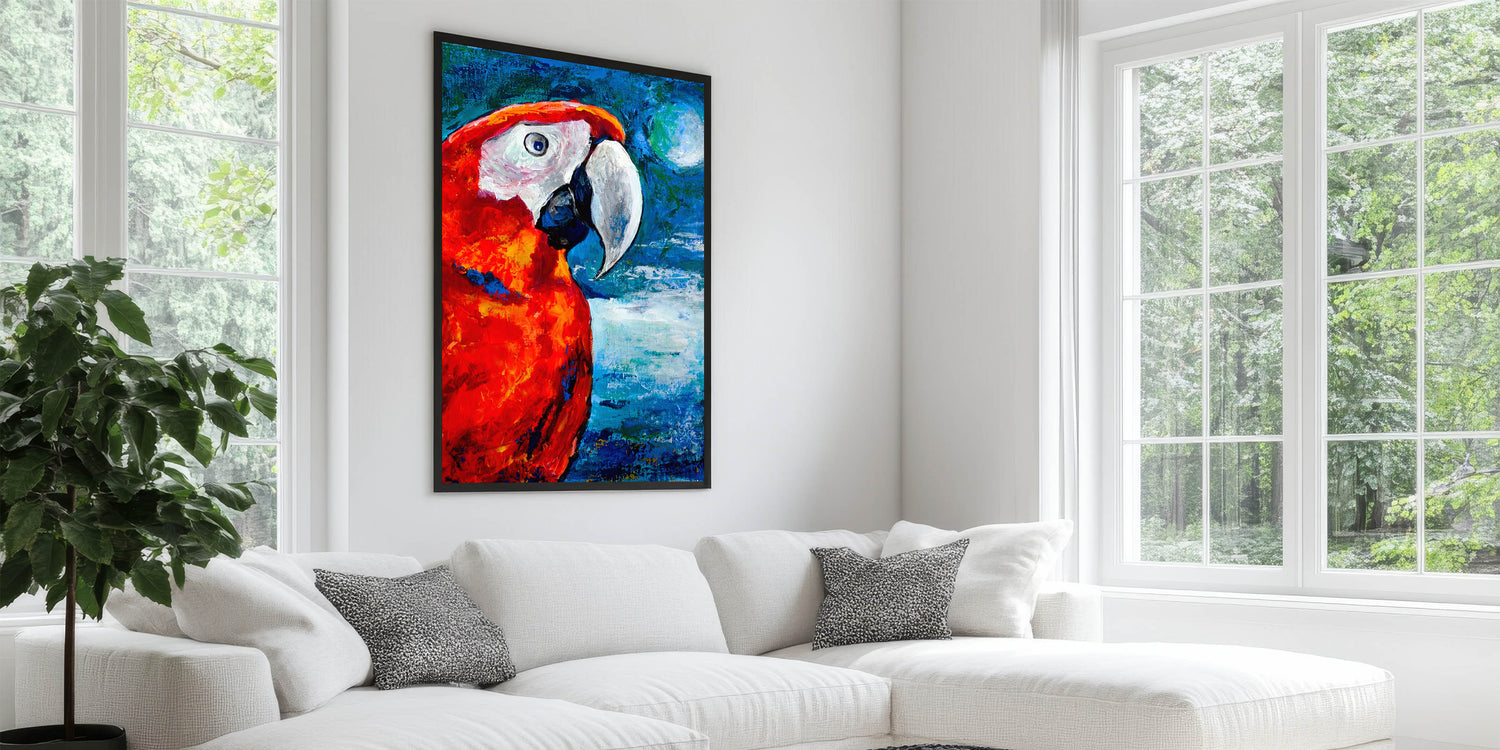 Enhance your living space with the intense vibrancy of this Scarlet Parrot Wall Art. This captivating artwork features a parrot in stunning shades of red and orange, set against a vivid blue background. The bold color palette brings a dynamic and lively energy to any room, making it perfect for those who appreciate striking and unique decor pieces.