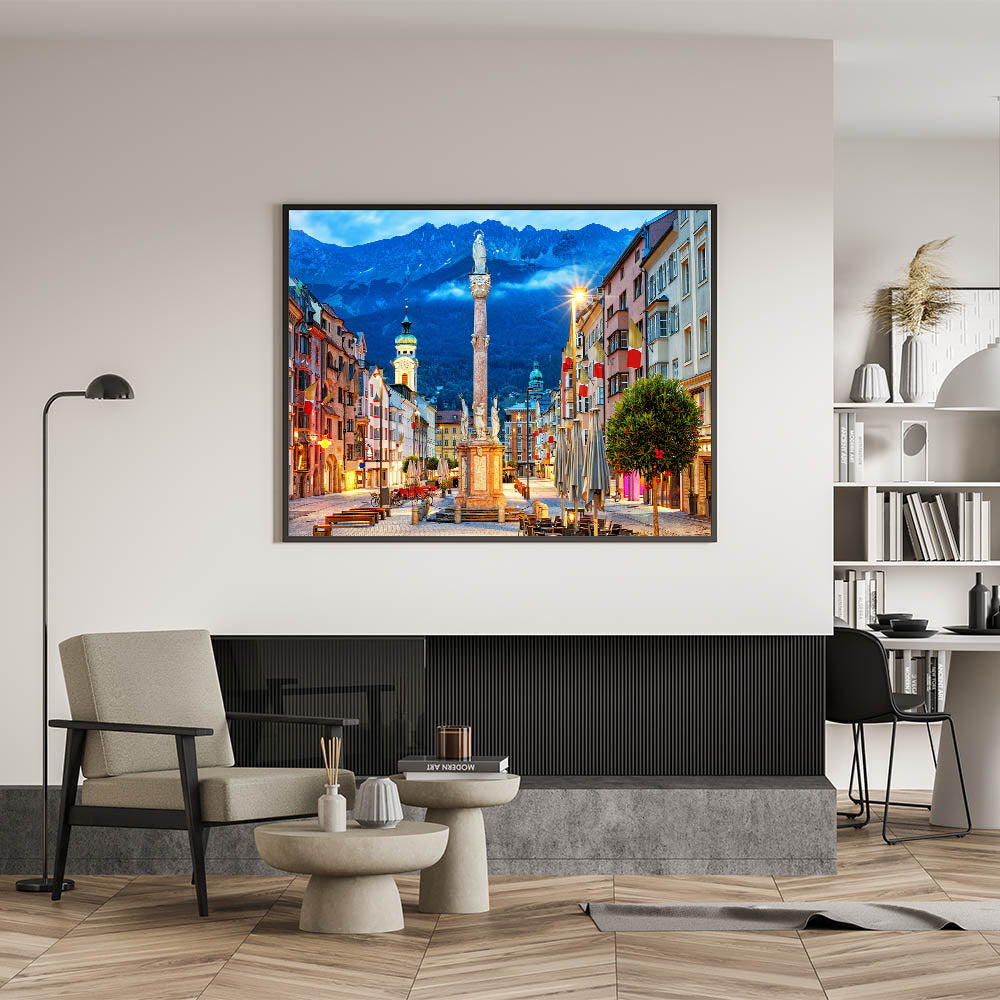 Bring the charm of Innsbruck into your home with this striking Scenic Austria print, capturing the beauty of the city center against the stunning backdrop of the Austrian Alps. The artwork features the famous St. Anne's Column, a prominent landmark, surrounded by colorful buildings and historic architecture. The majestic mountains towering in the background create a beautiful contrast with the vibrant city scene, making this piece a perfect addition to any room.