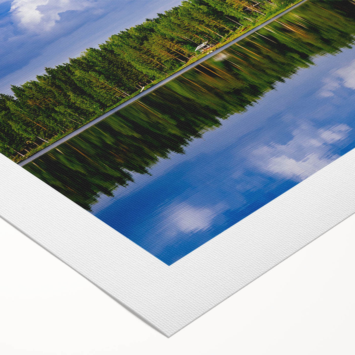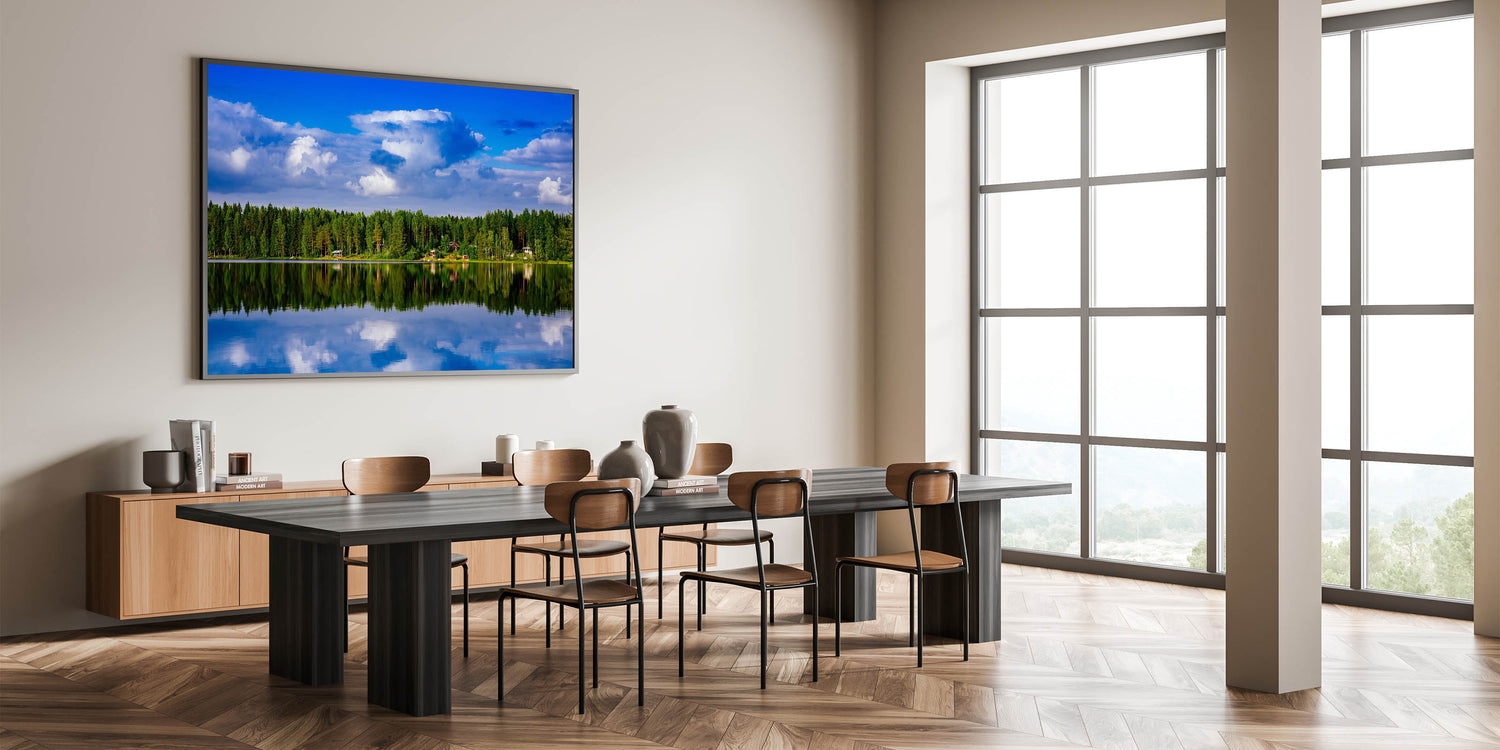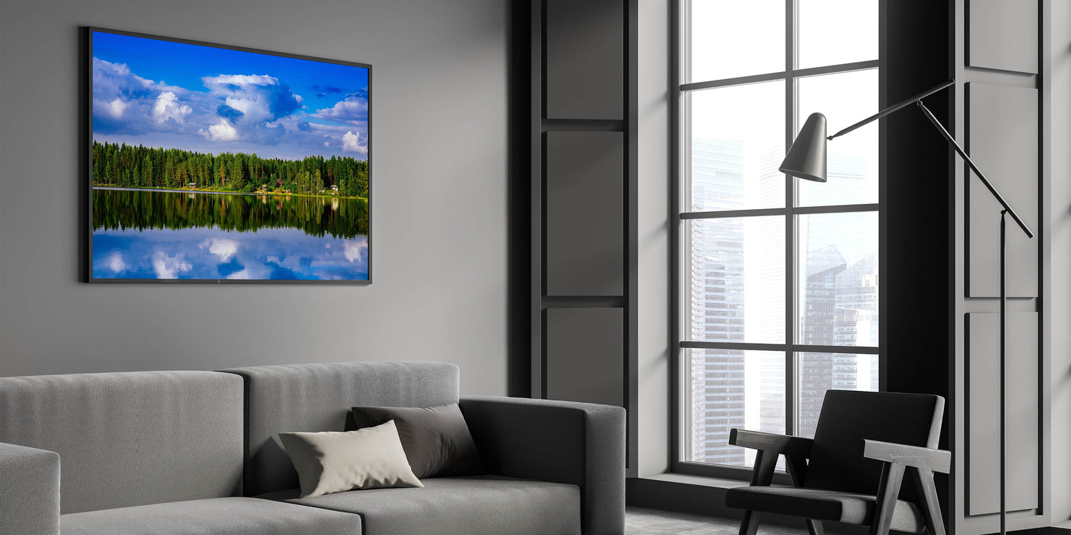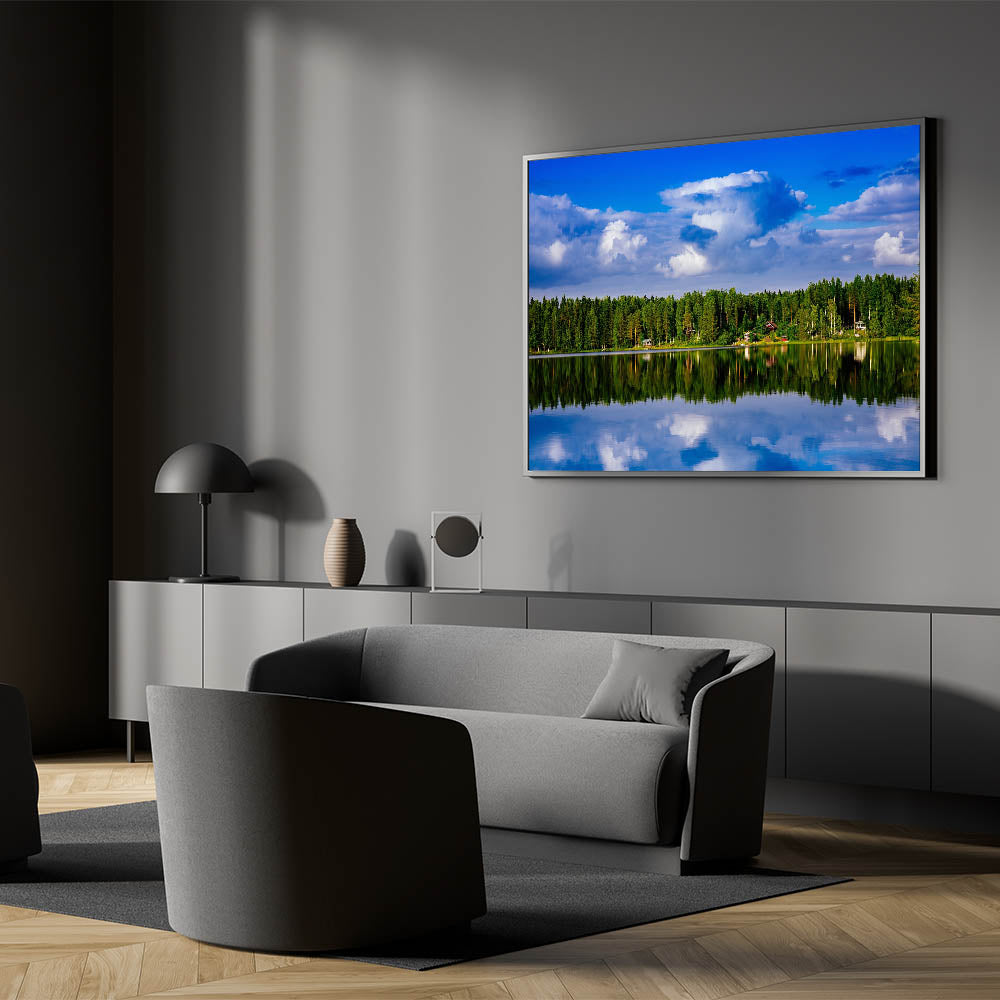Bring the beauty of Finland’s untouched natural landscapes into your home or office with this serene piece of art. The reflection of the sky and trees on the water makes this artwork a calming and meditative addition to any decor.