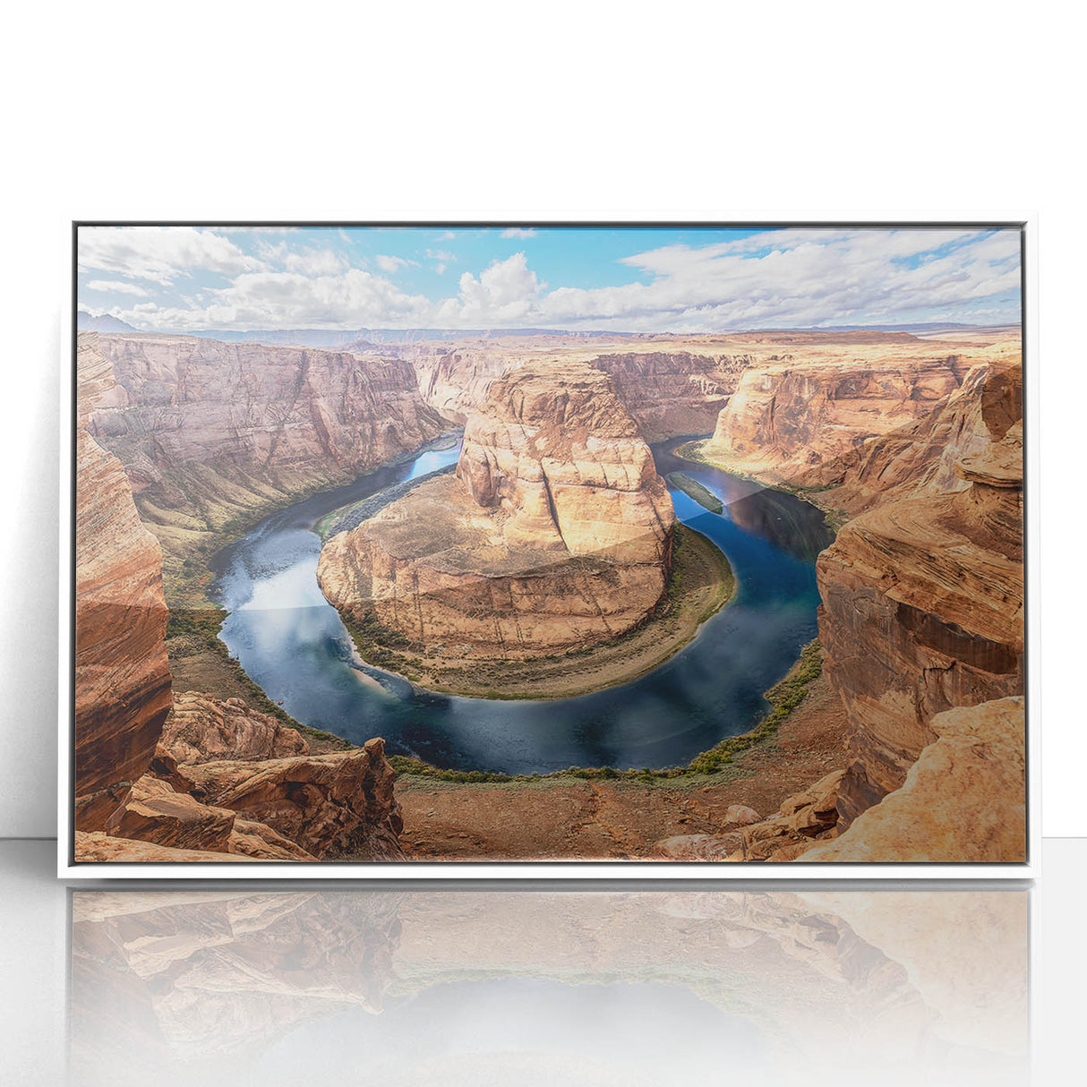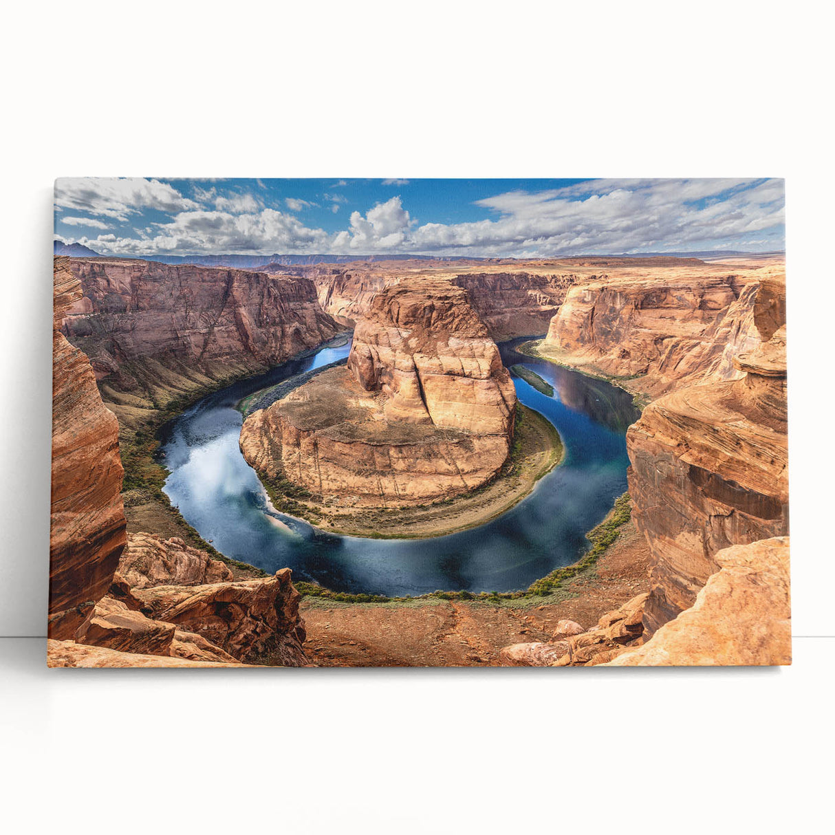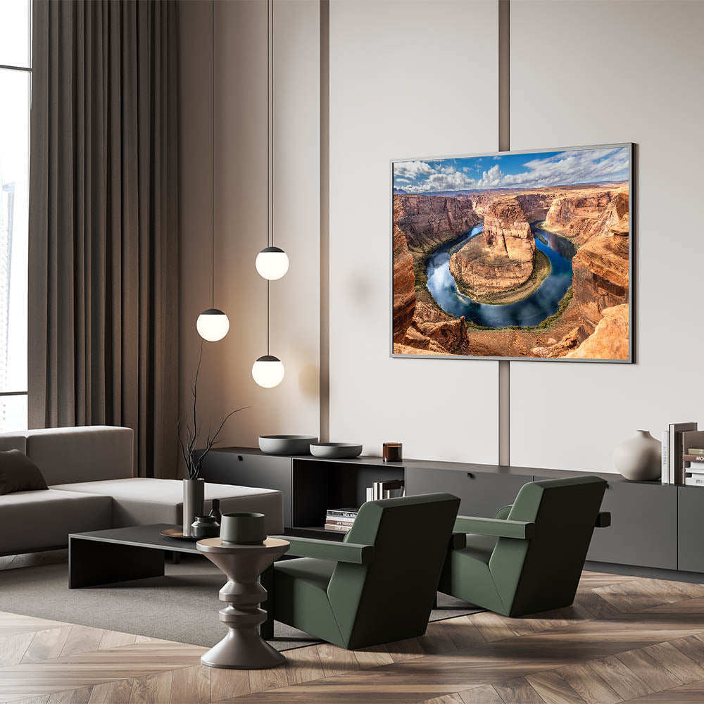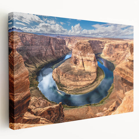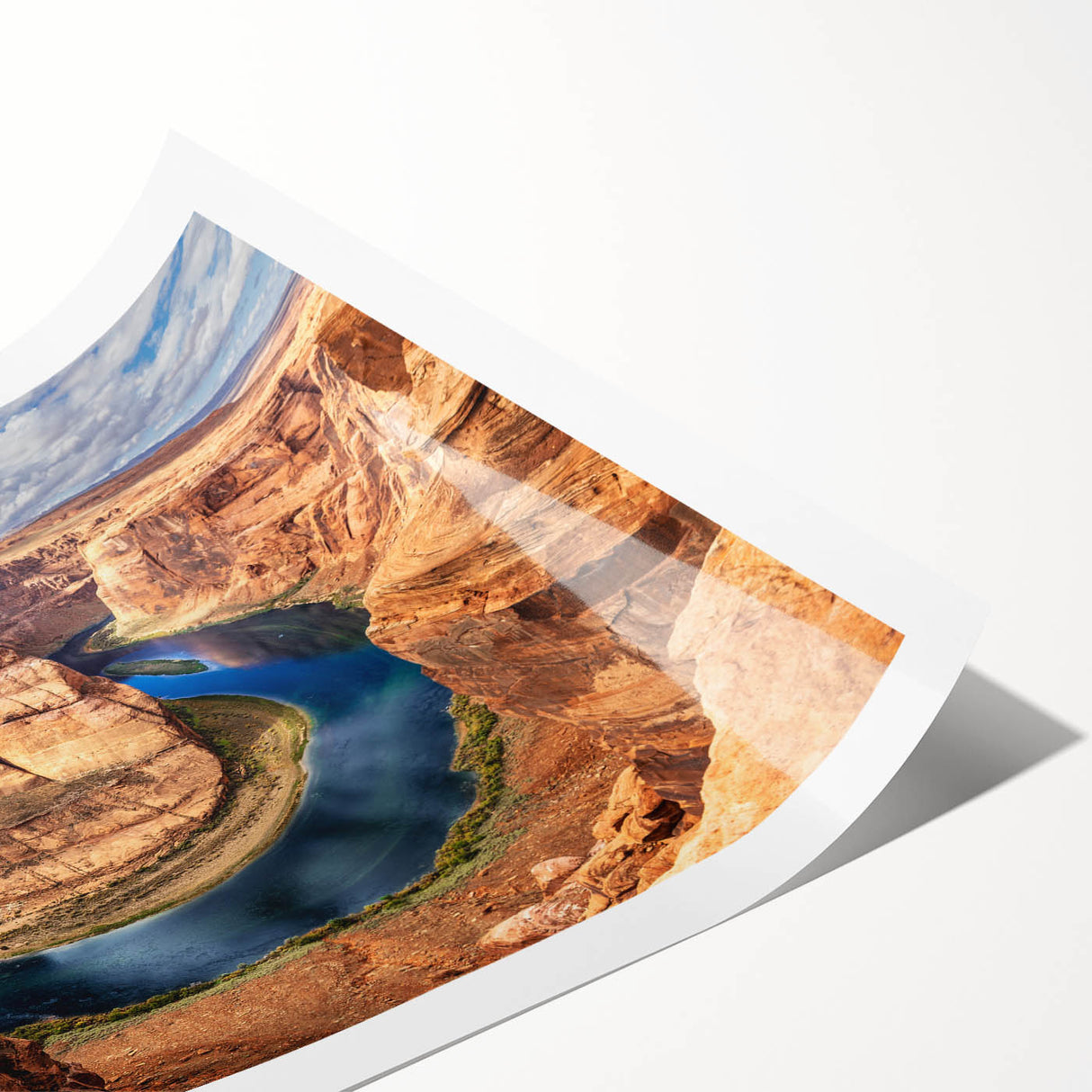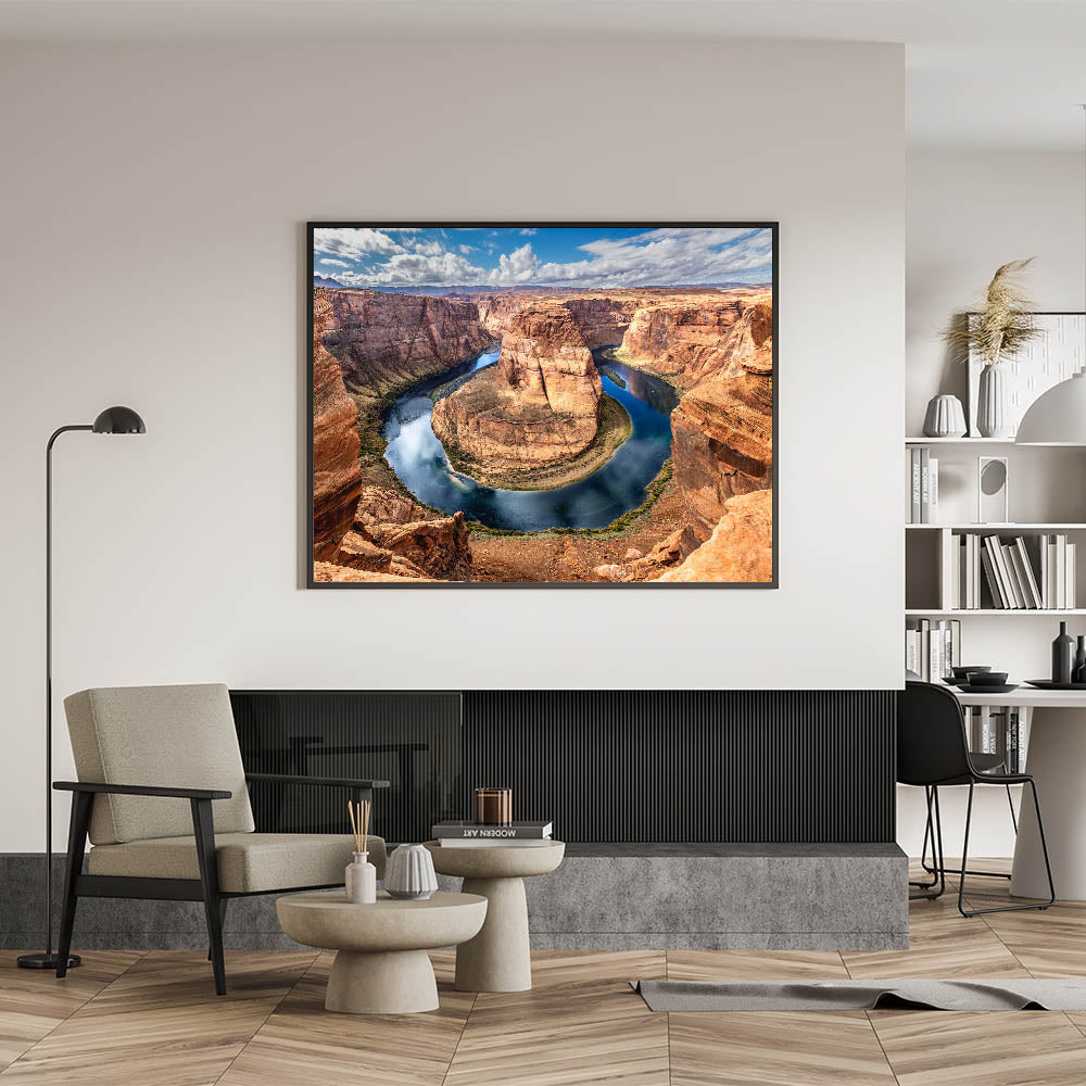 Transform your space with this awe-inspiring view of Glen Canyon, showcasing the dramatic curves of the Colorado River and the majestic Arizona desert landscape. This striking artwork captures the natural beauty of the Southwest with its towering canyon walls, vibrant sky, and rich earth tones. The blue of the river contrasts beautifully with the rugged, terracotta-hued rock formations, creating a breathtaking scene that adds depth and warmth to any room.