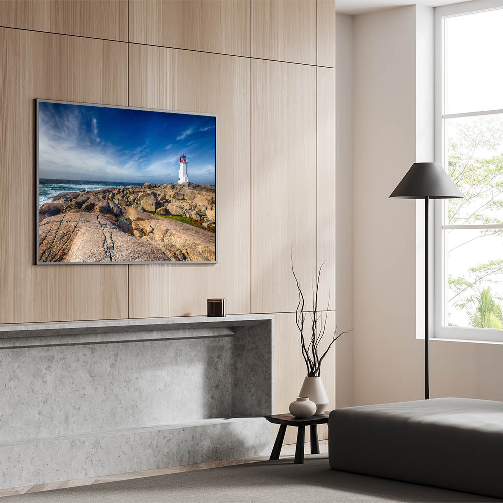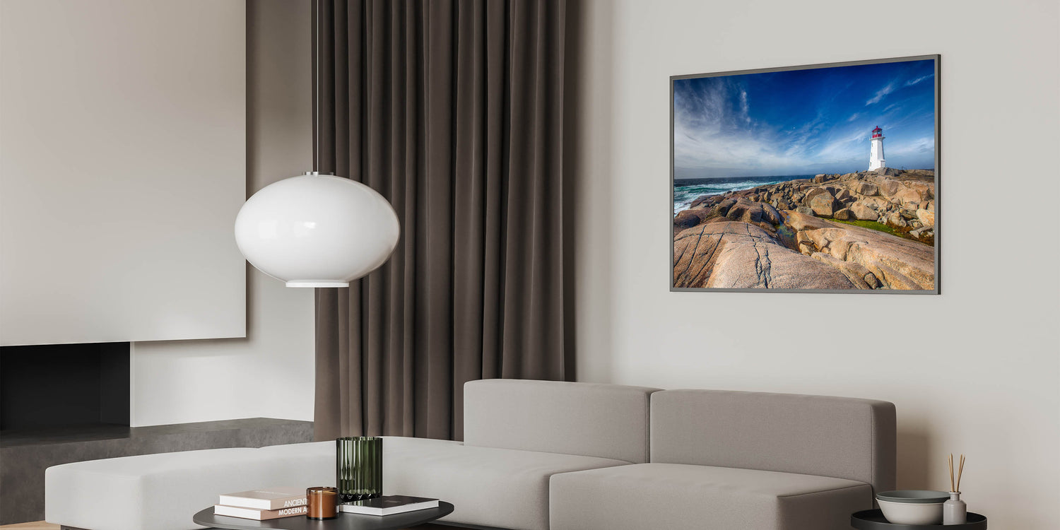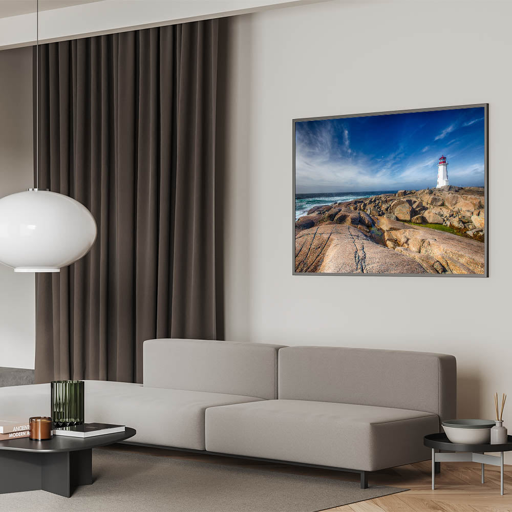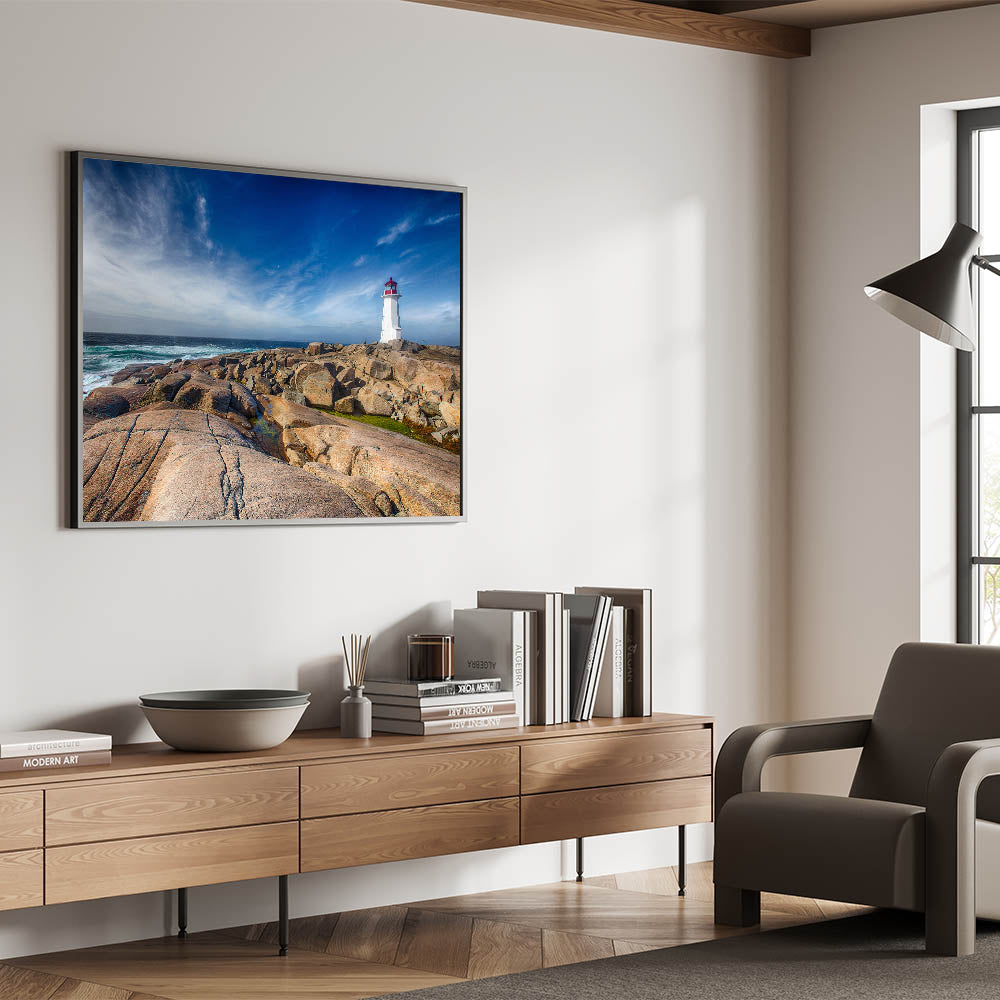 Bring the rugged beauty of Nova Scotia’s coastline into your home with this breathtaking wall art of a lighthouse surrounded by rocky shores and deep blue skies. This piece perfectly captures the essence of the Maritime province’s natural landscape, making it a perfect addition to any coastal or nature-inspired decor. The crisp white lighthouse stands proudly against the dynamic ocean waves and the vibrant blues of the sky, creating a dramatic yet serene scene.