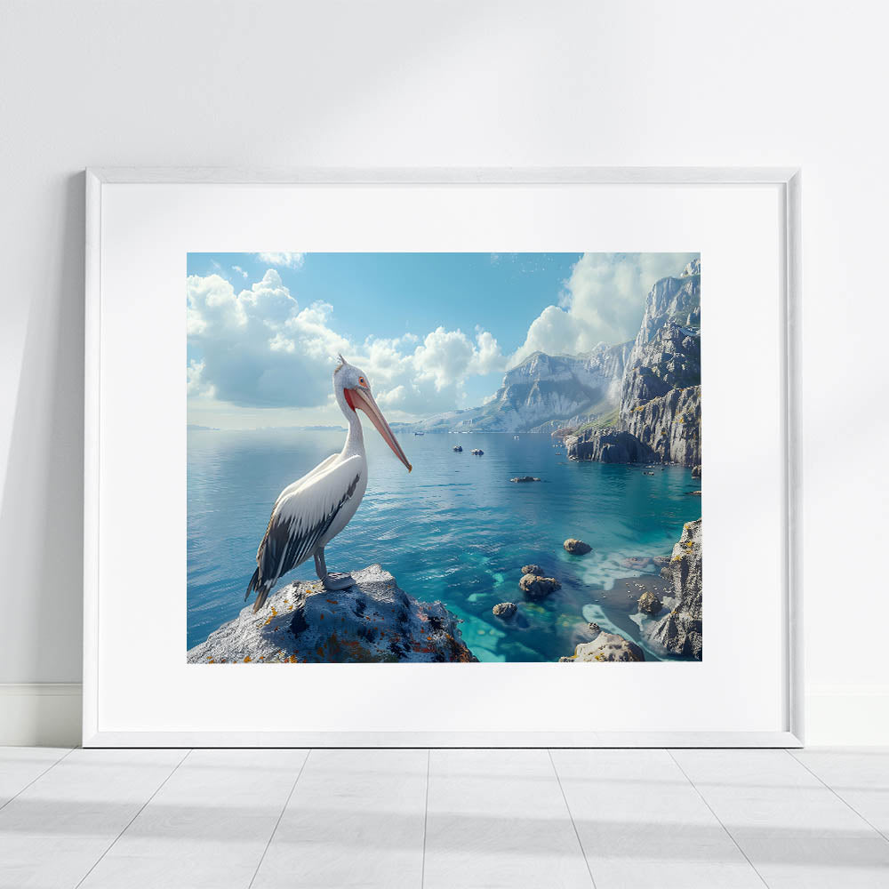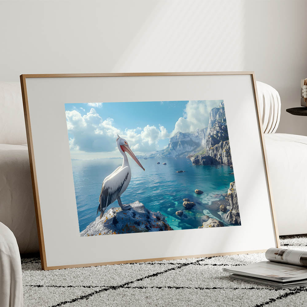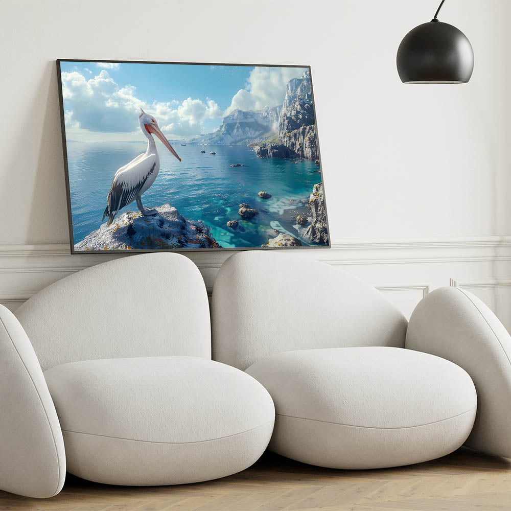 Transform your home with the tranquil beauty of this Scenic Pelican Wall Art. This breathtaking piece captures a pelican perched gracefully on a rocky cliff overlooking a stunning coastal landscape. The vibrant blues of the ocean and the sky, contrasted with the rugged cliffs, create a serene and captivating scene. Perfect for any space that values the calming influence of nature, this artwork is ideal for a living room, office, or bedroom.