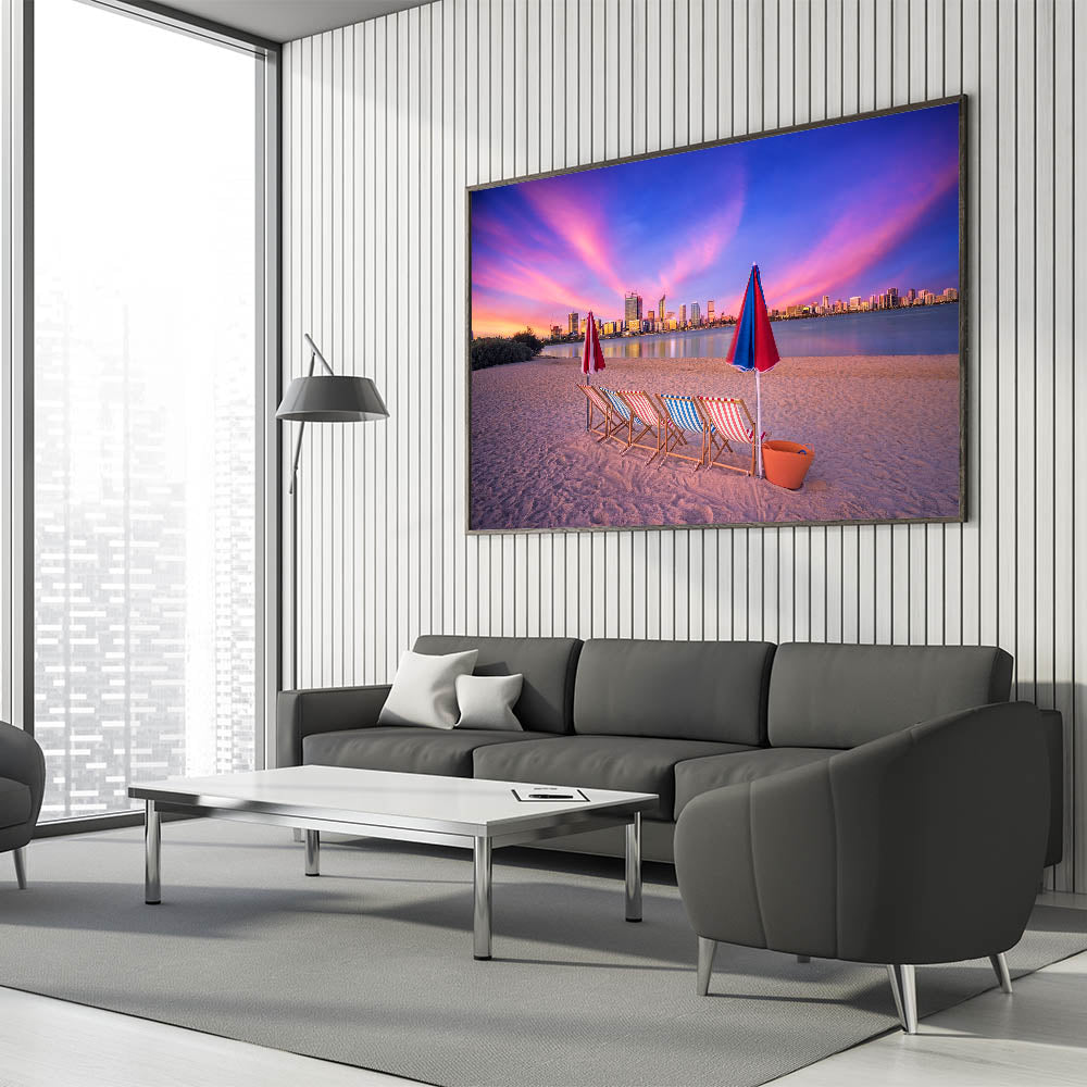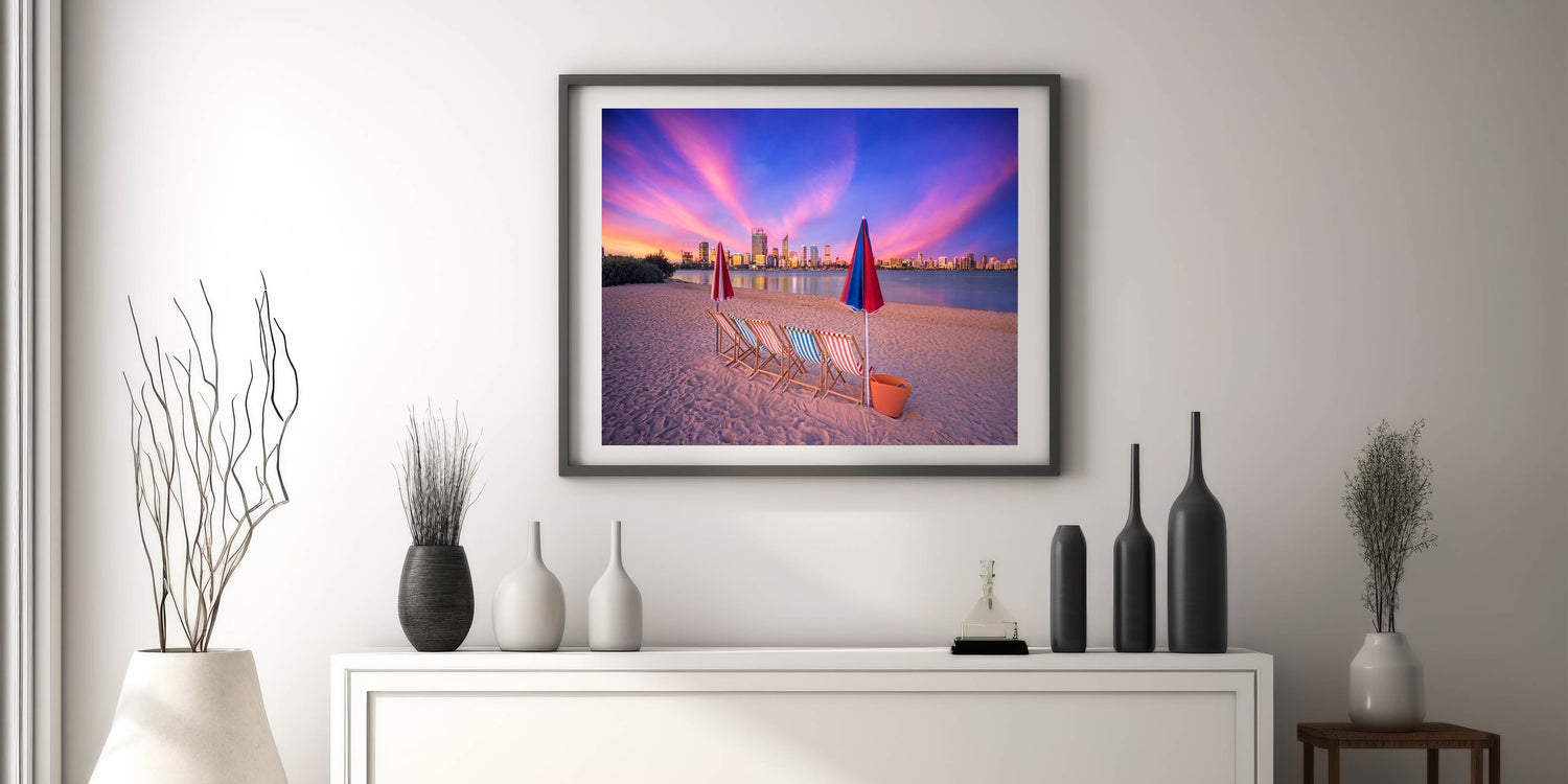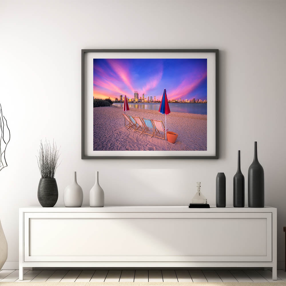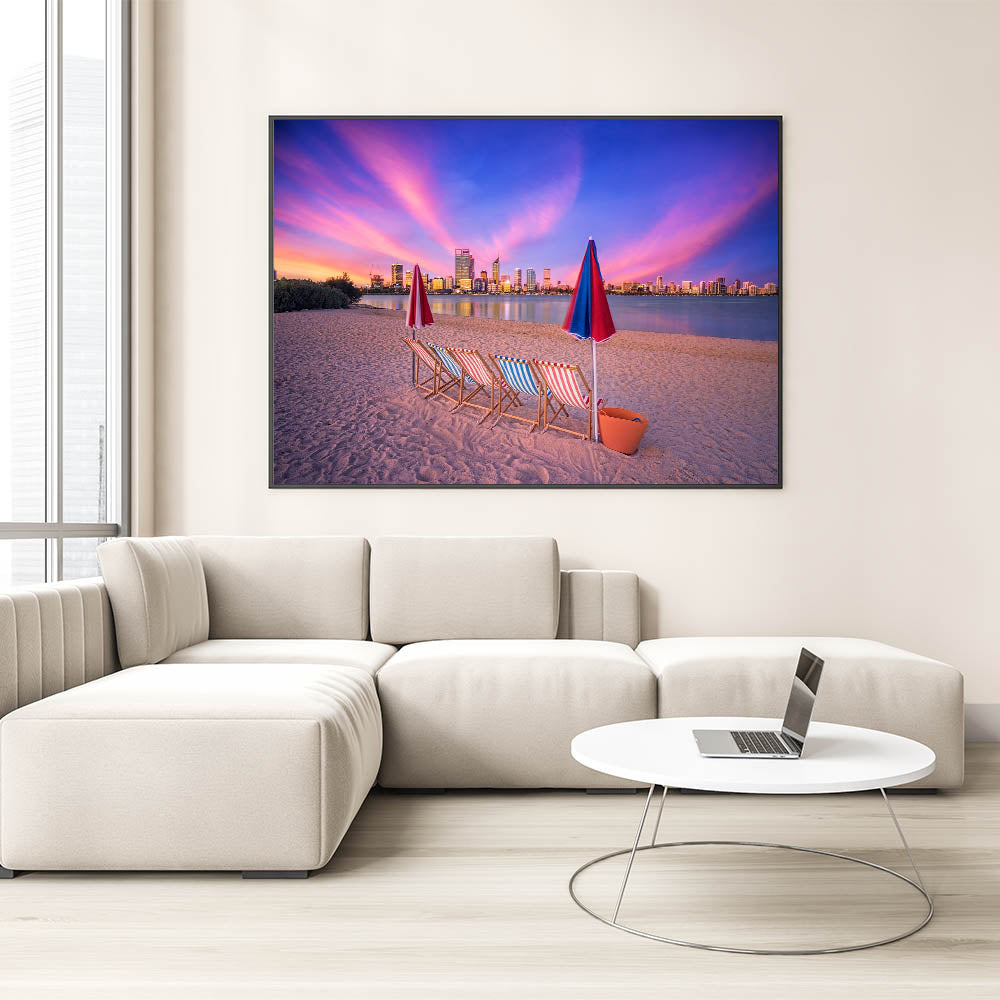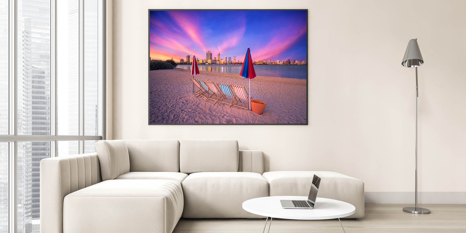 Add a touch of vibrant elegance to your home with this stunning Scenic Perth Artwork, featuring a gorgeous sunset over Perth’s skyline and sandy beach. The playful arrangement of beach umbrellas and chairs leads your eyes to the beautifully illuminated cityscape, reflecting the rich colors of the setting sun. This Perth Cityscape Print combines both urban energy and natural serenity, making it a standout piece for any room.