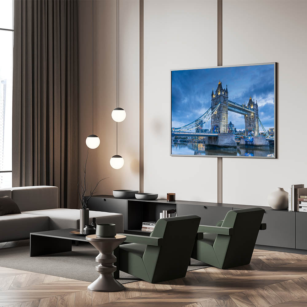 Transform your living space with this breathtaking wall art of the iconic Tower Bridge in London. Captured in stunning detail, this elegant bridge photography print showcases the timeless beauty of one of the world's most recognizable landmarks. The image perfectly captures the architectural brilliance of the bridge against a serene sky, making it an ideal centerpiece for any room.