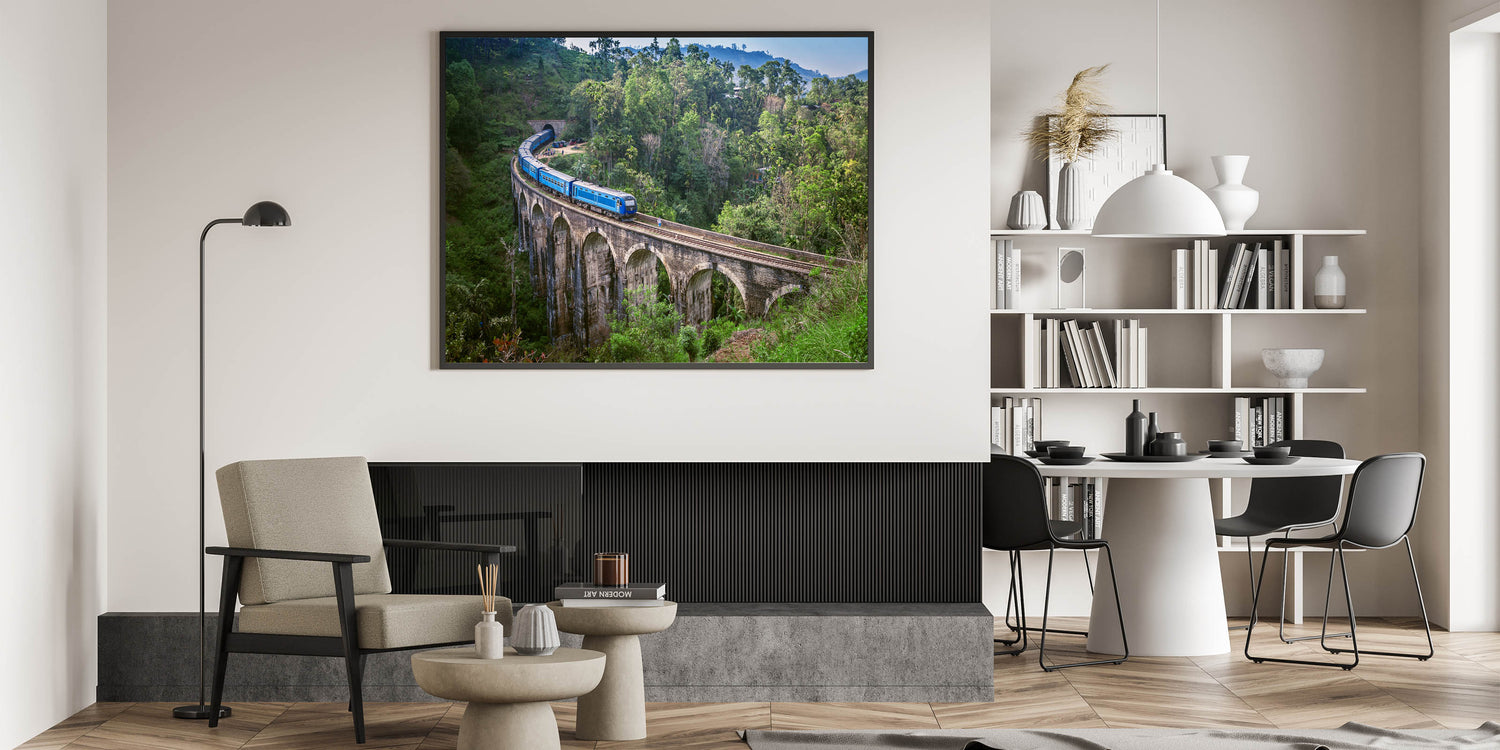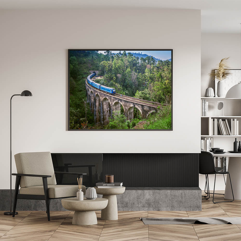 Immerse yourself in the beauty of nature with this breathtaking wall art featuring a train crossing a historic bridge amidst a lush, green landscape. This stunning canvas print captures the harmonious blend of engineering and nature, as a sleek blue train glides over the ancient arches of the bridge, surrounded by dense forest and distant mountains. Perfect for nature lovers and train enthusiasts alike, this piece adds a touch of tranquility and adventure to any room.