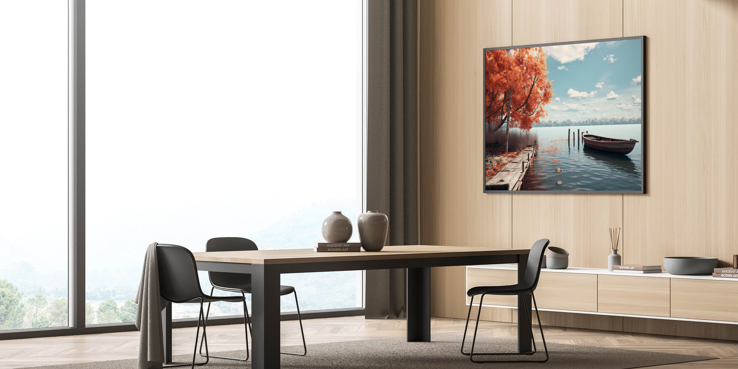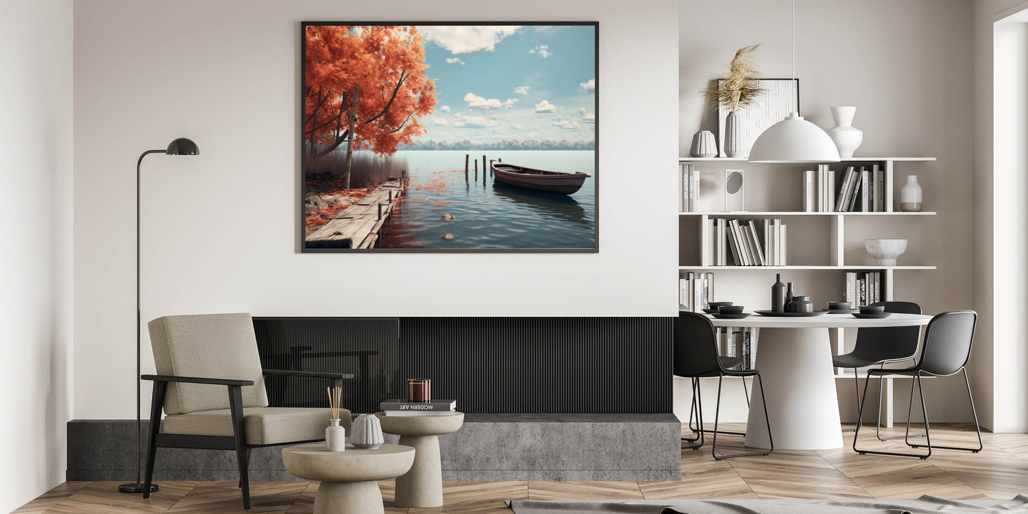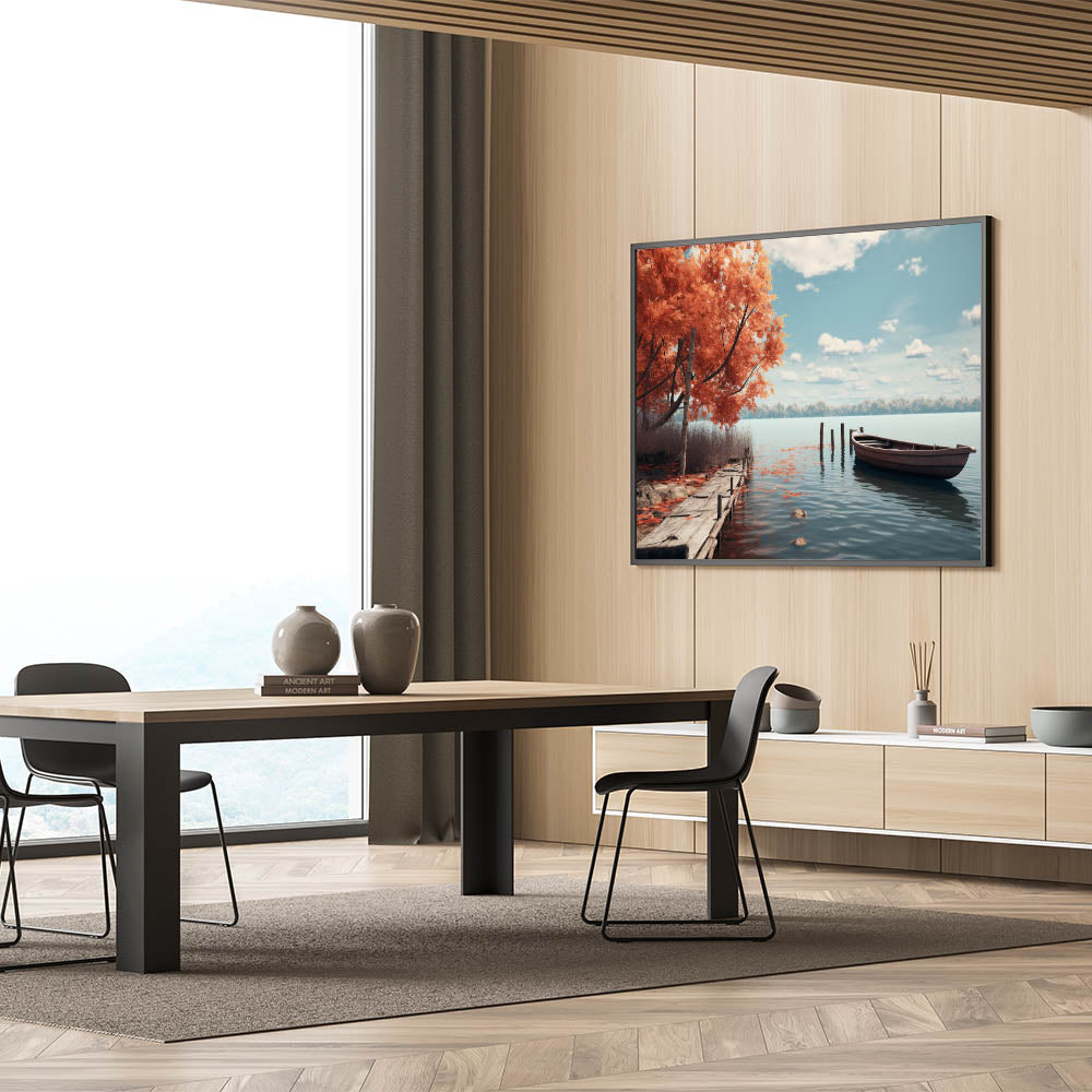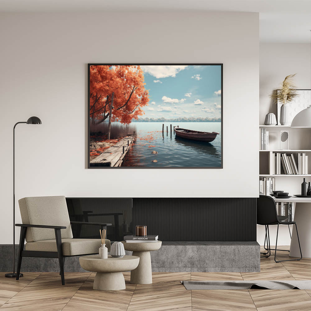 This rowboat wall art is perfect for anyone looking to bring the calming and reflective nature of autumn into their living space. Its rich colors and serene imagery make it a focal point in any room, evoking a sense of peace and connection to nature.