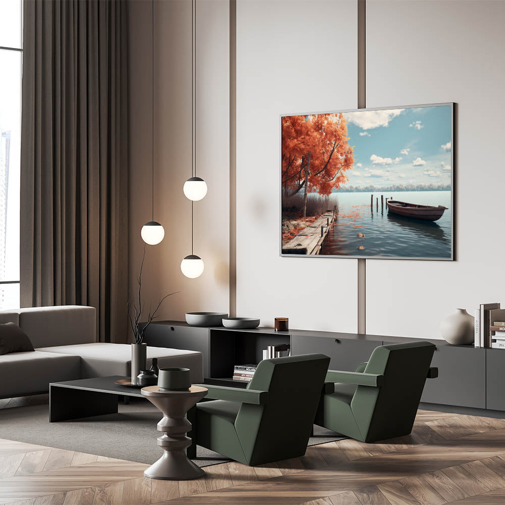 Serene Autumn Lake Rowboat Wall Art - Rustic Nature Decor