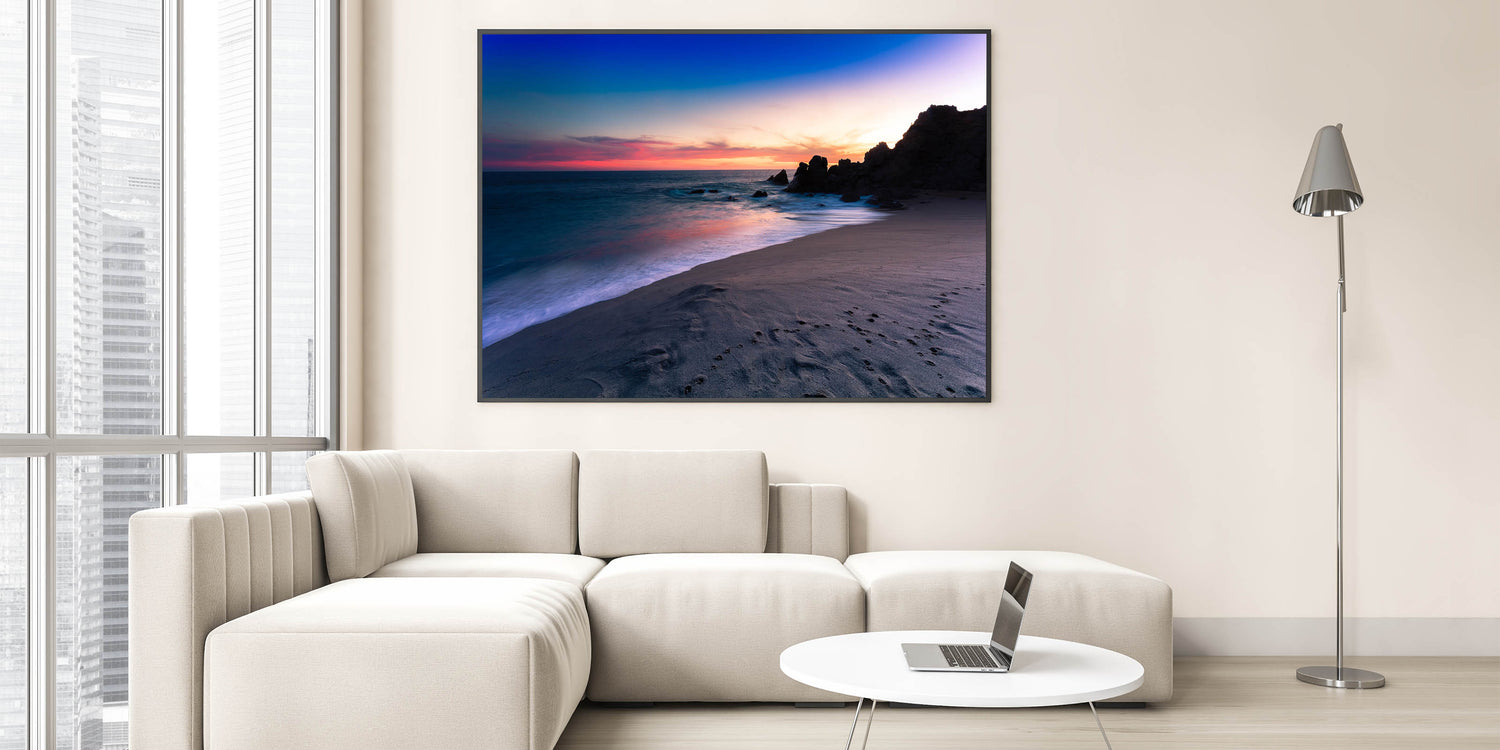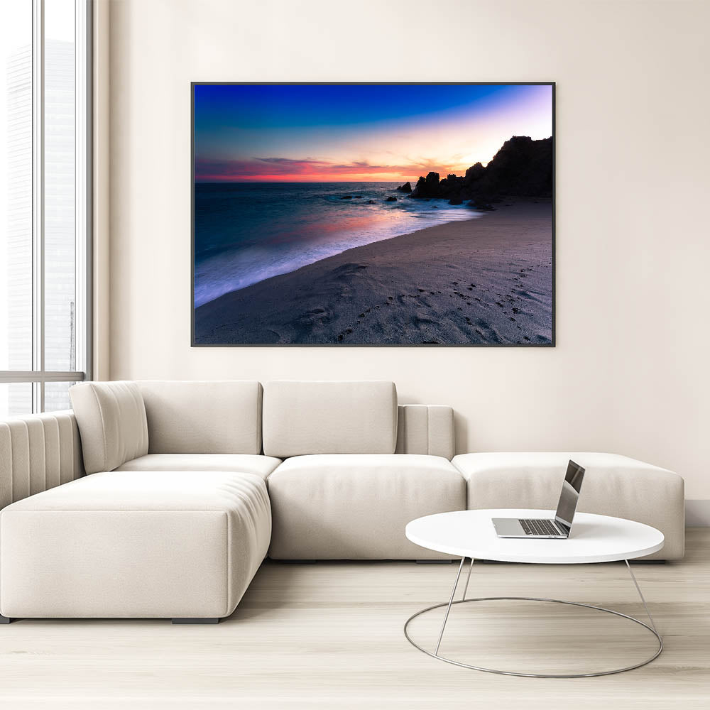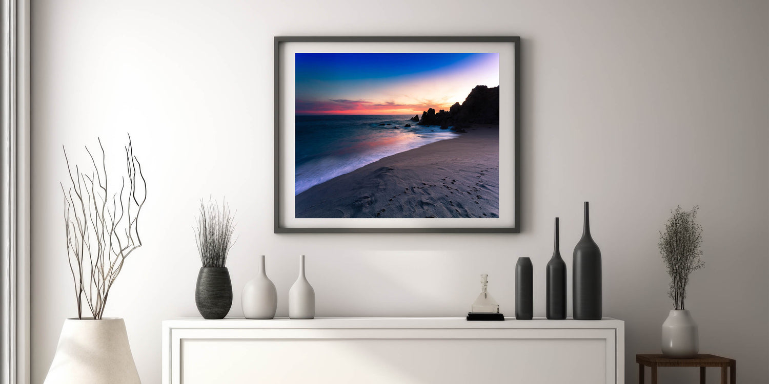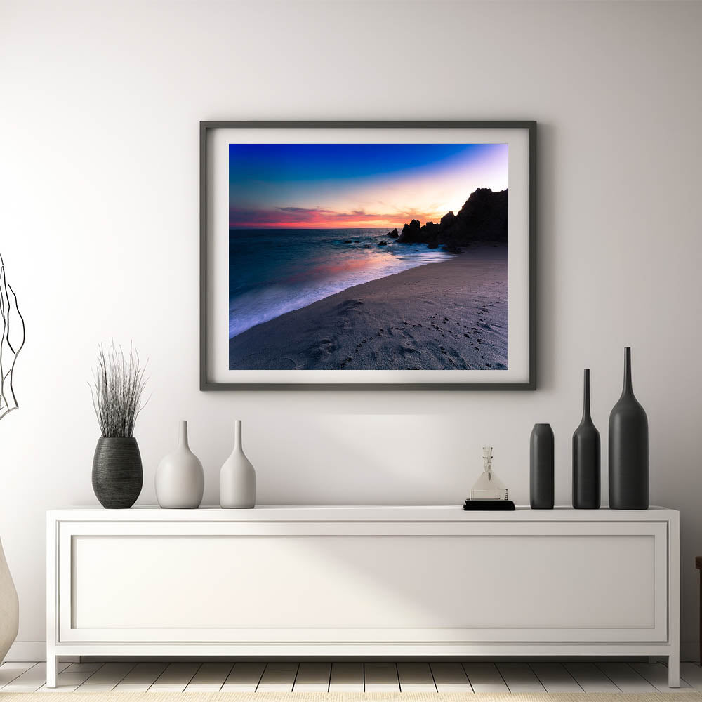 Immerse yourself in the peaceful beauty of Cabo San Lucas with this serene beach sunset wall art. The soft hues of pink, purple, and blue reflect off the ocean, while the calm waves gently touch the dark sandy shore. This tranquil scene captures the peacefulness of a quiet sunset by the sea, making it a perfect piece for those who appreciate calm, coastal landscapes.