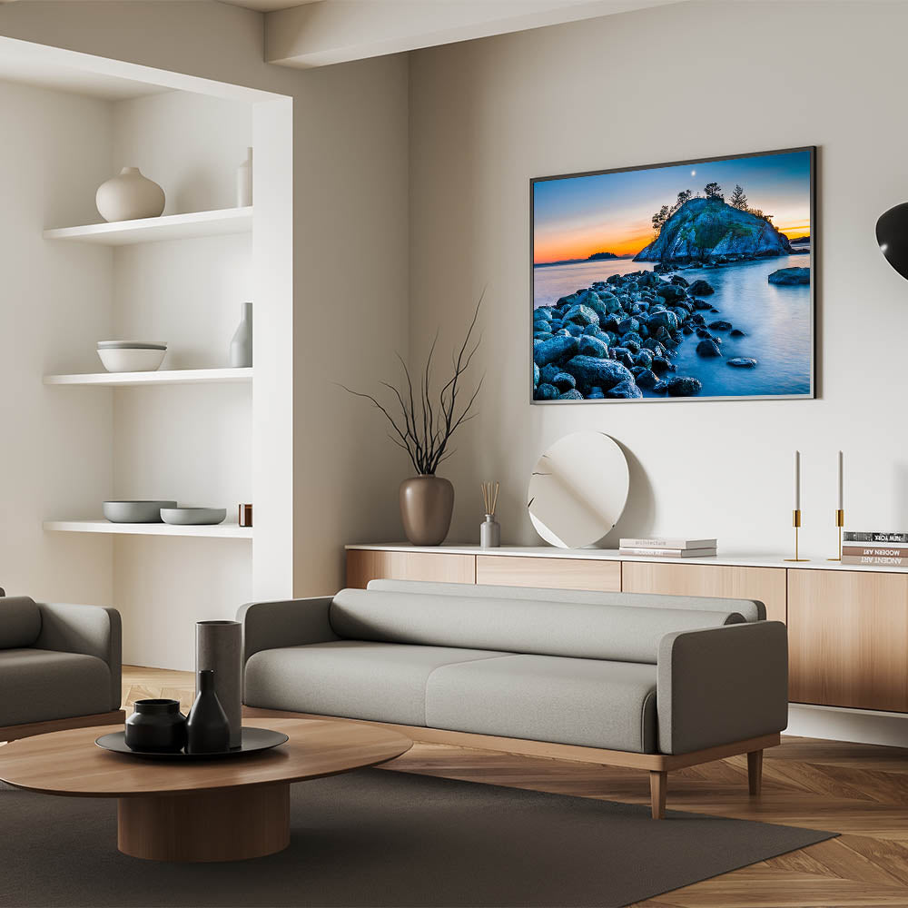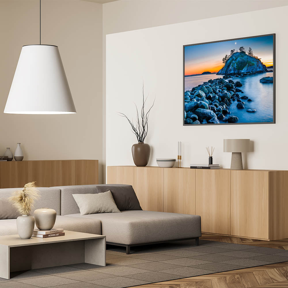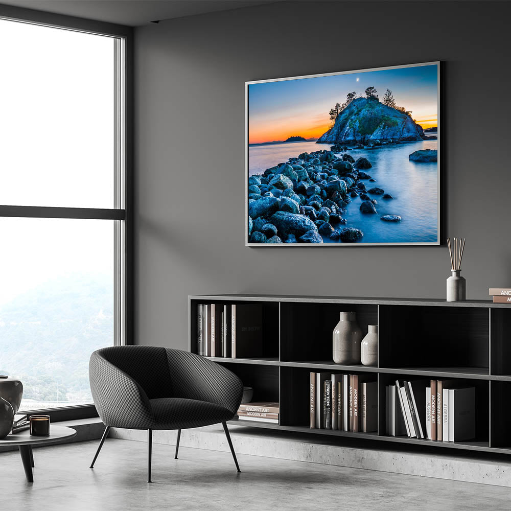 Experience the serene beauty of British Columbia’s coastline with this captivating wall art. The soft colors of the sunset illuminate a peaceful island, while the rocky shoreline leads your gaze toward the horizon. The calm waters and crescent moon add to the tranquil atmosphere, making this piece an ideal addition to any space seeking a touch of natural beauty and relaxation.