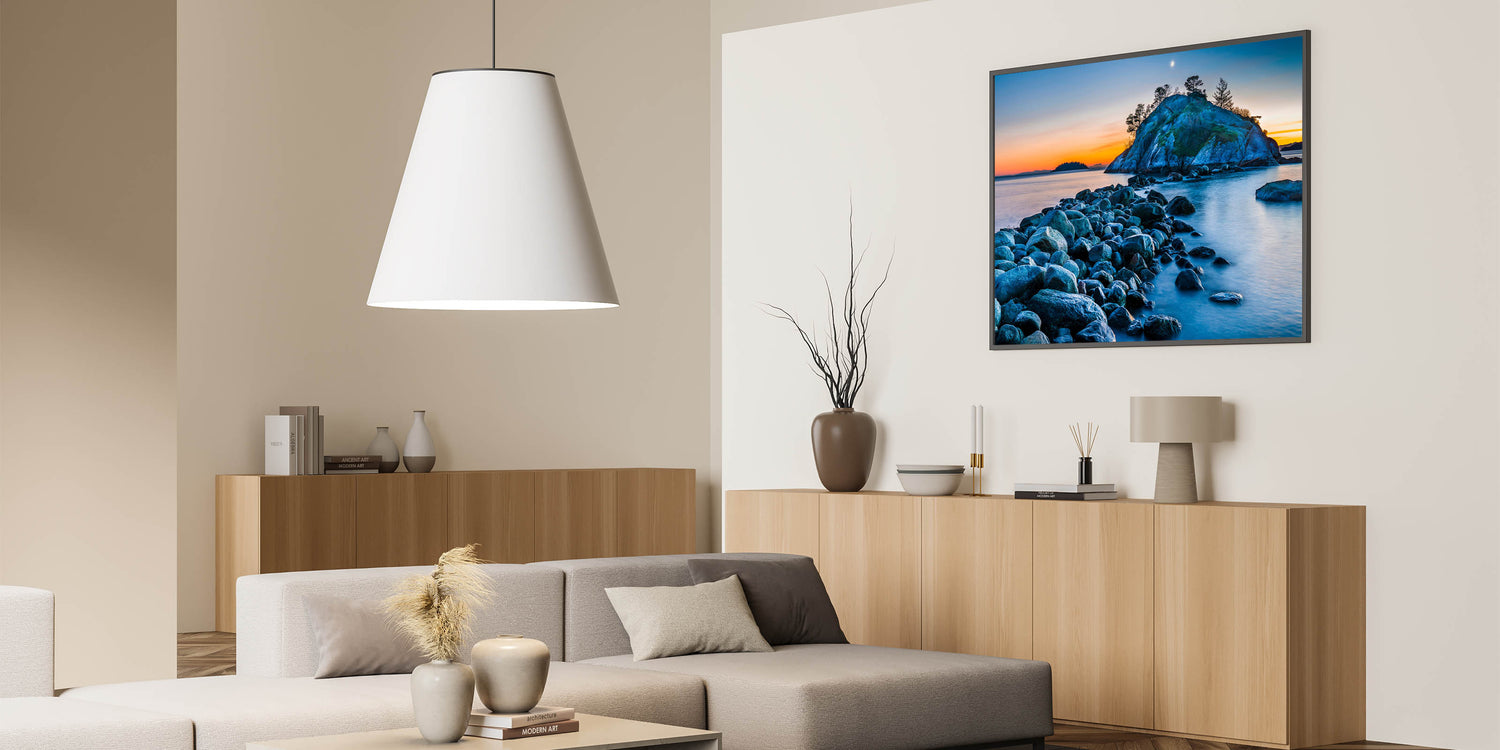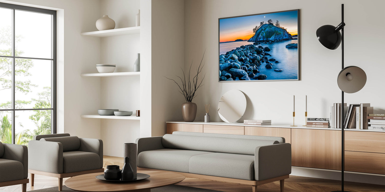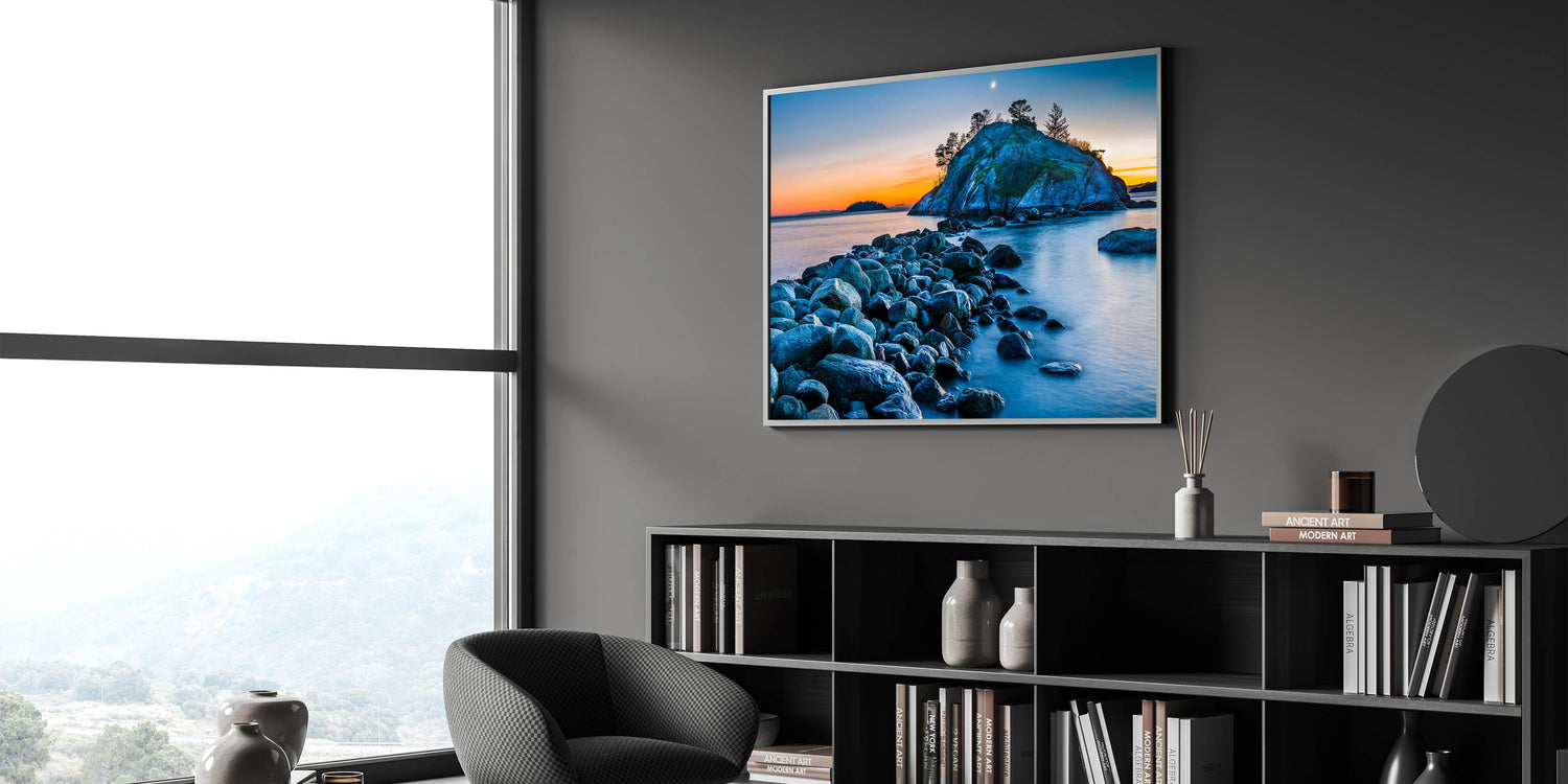 Experience the serene beauty of British Columbia’s coastline with this captivating wall art. The soft colors of the sunset illuminate a peaceful island, while the rocky shoreline leads your gaze toward the horizon. The calm waters and crescent moon add to the tranquil atmosphere, making this piece an ideal addition to any space seeking a touch of natural beauty and relaxation.