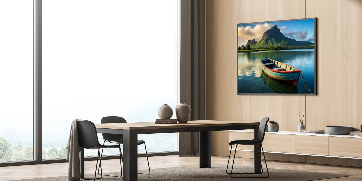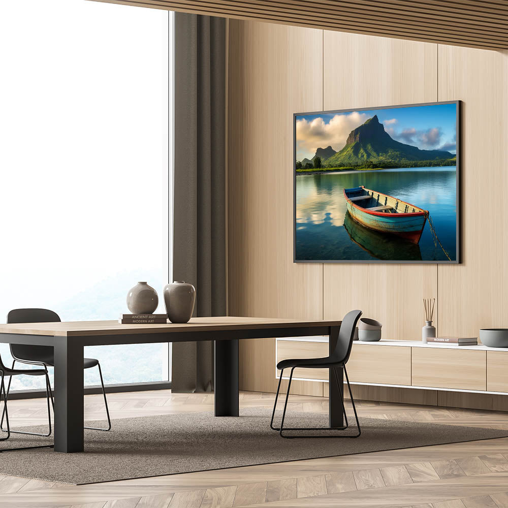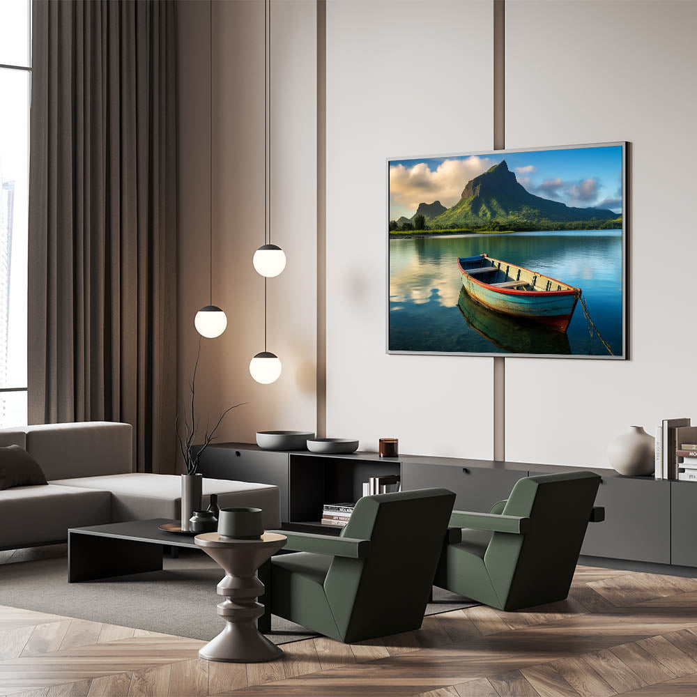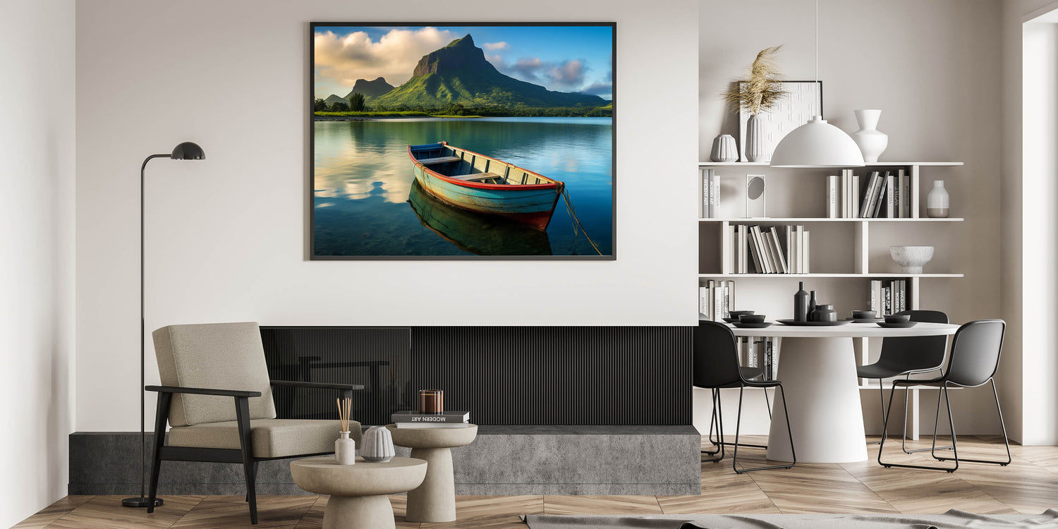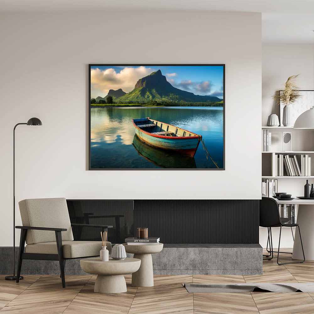 Capture the tranquil beauty of Mauritius with this stunning wall art, featuring a serene scene of a traditional boat resting on calm waters against the backdrop of lush mountains. This artwork perfectly embodies the peaceful ambiance of the island, making it an ideal choice for anyone looking to bring a sense of calm and relaxation into their space.