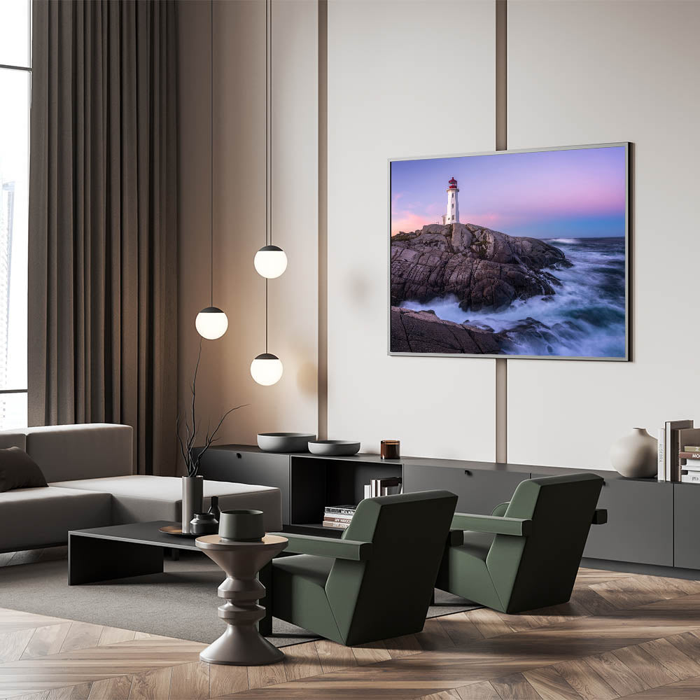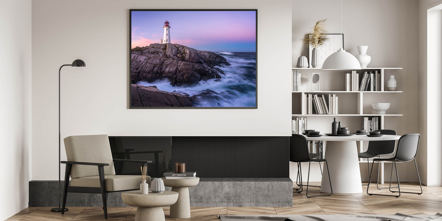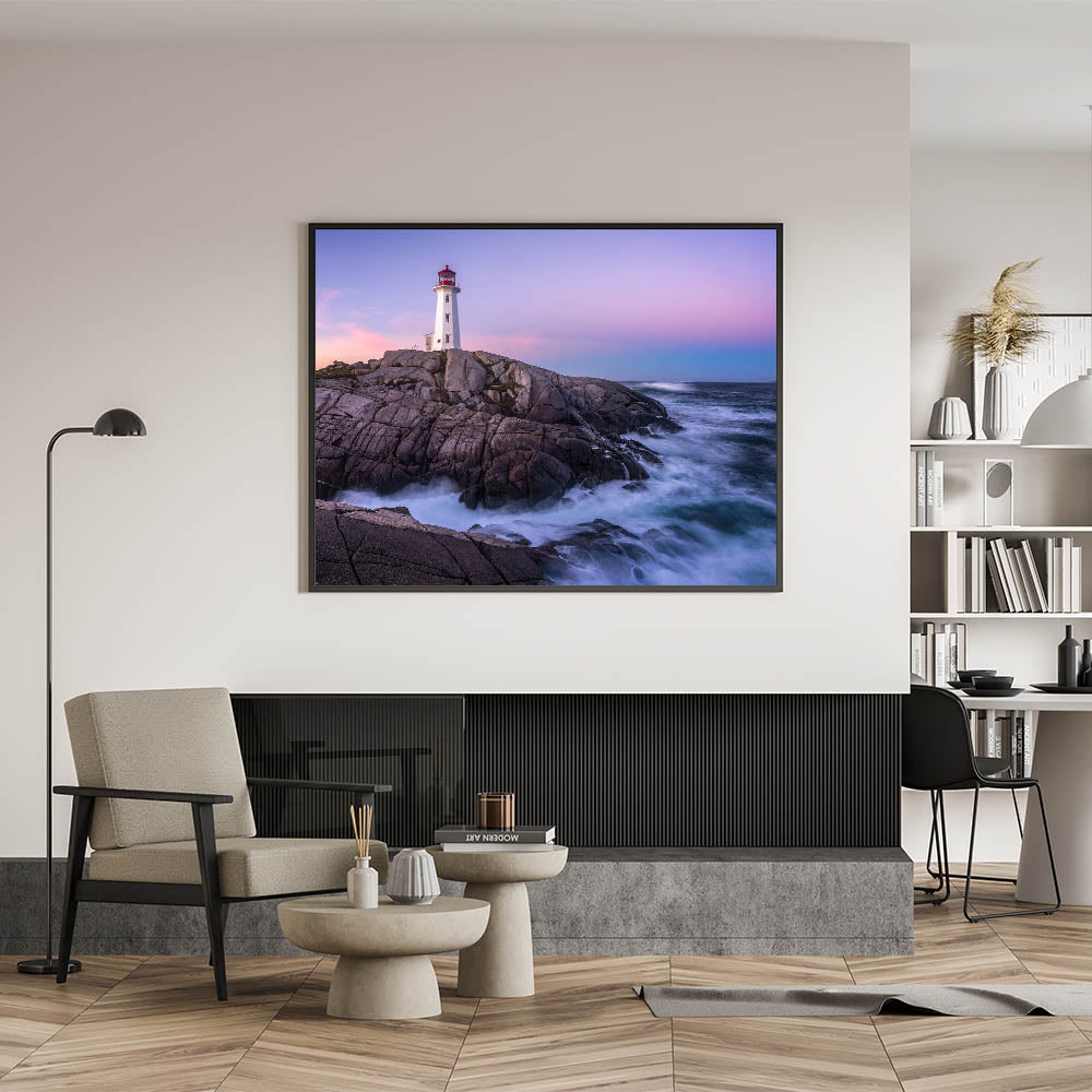 Transport yourself to the rugged beauty of Nova Scotia’s coast with this serene lighthouse wall art. Set against the backdrop of a calm evening sky, the lighthouse stands proudly on the rocky cliffs, watching over the gentle waves crashing below. This piece perfectly captures the tranquility and power of the Atlantic coast, creating a calming yet striking visual that’s perfect for any space. The soft hues of pink and blue in the sky contrast beautifully with the sturdy white lighthouse and the deep blues of the ocean.