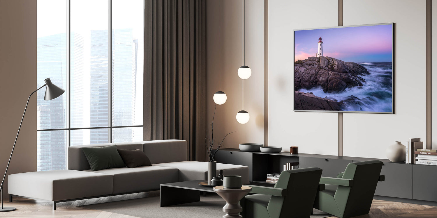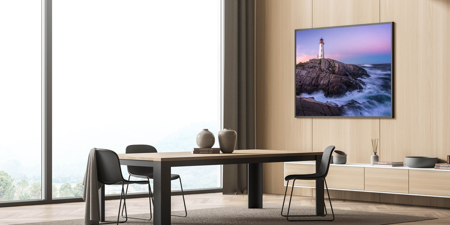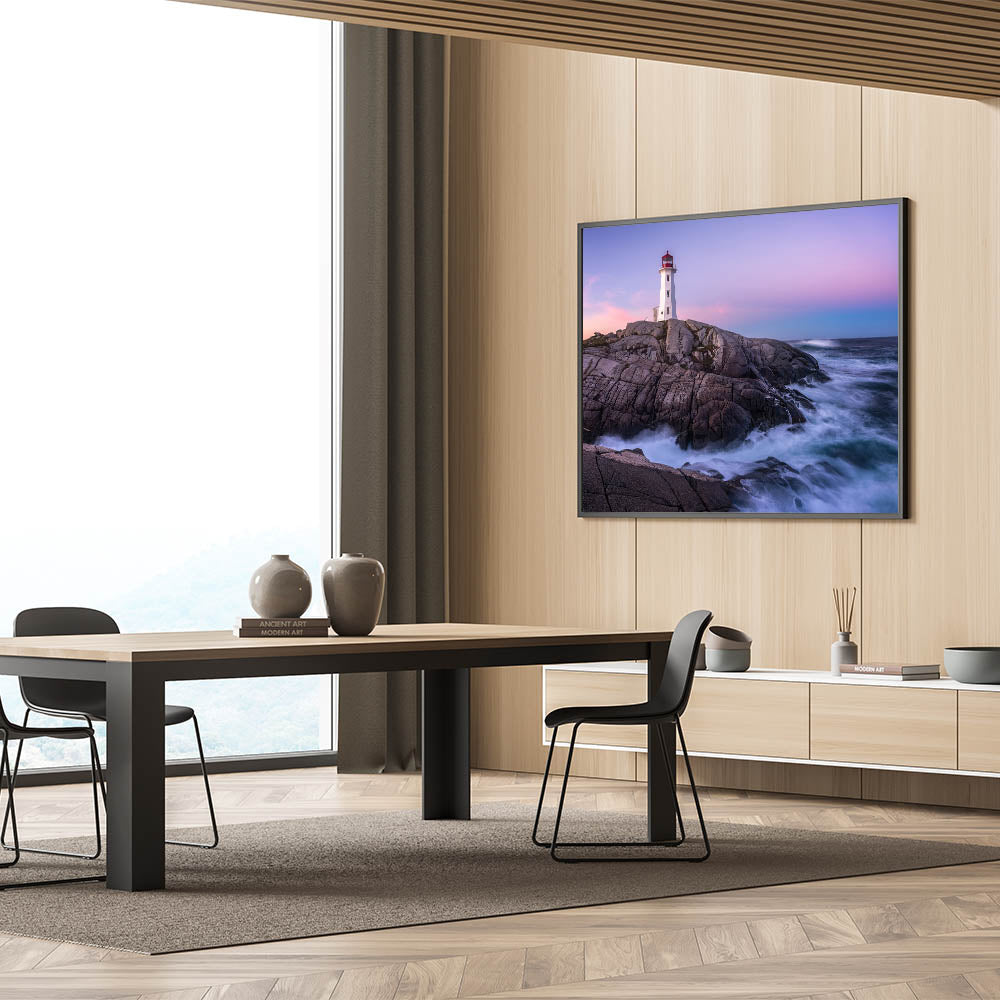 Transport yourself to the rugged beauty of Nova Scotia’s coast with this serene lighthouse wall art. Set against the backdrop of a calm evening sky, the lighthouse stands proudly on the rocky cliffs, watching over the gentle waves crashing below. This piece perfectly captures the tranquility and power of the Atlantic coast, creating a calming yet striking visual that’s perfect for any space. The soft hues of pink and blue in the sky contrast beautifully with the sturdy white lighthouse and the deep blues of the ocean.