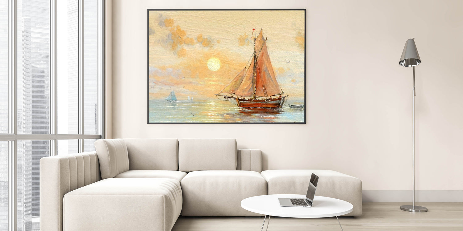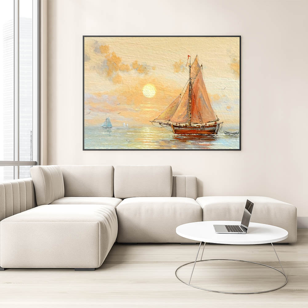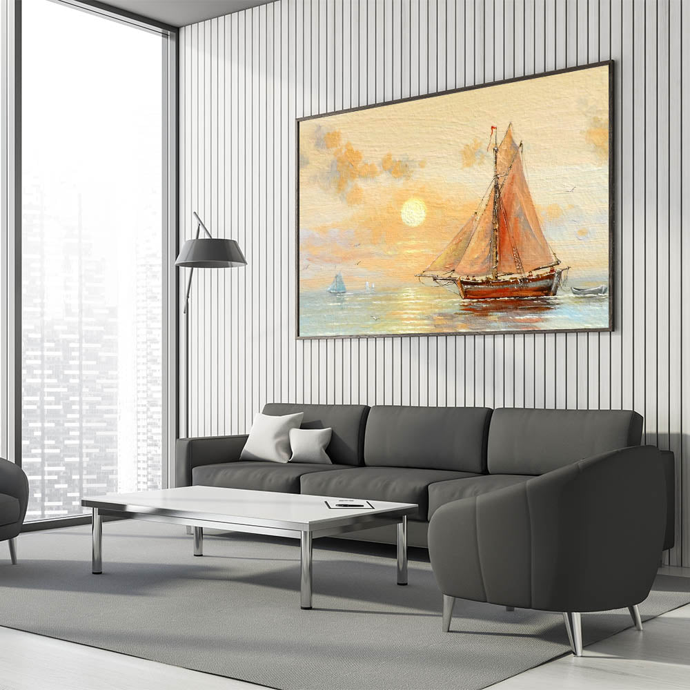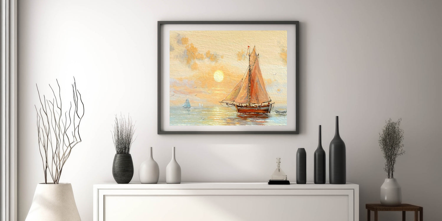 Bring the tranquility of the ocean into your home with this stunning rowboat wall art. Featuring a peaceful sunset scene, this artwork captures the gentle sway of a rowboat as it drifts on calm waters. The warm, golden hues of the setting sun blend seamlessly with the soft blues of the ocean, creating a harmonious coastal vibe. Perfect for beach homes or anyone looking to add a touch of nautical charm to their space, this handcrafted boat art is available in a variety of high-quality materials, including Stretched Canvas, Framed Canvas, Acrylic Glass, Framed Acrylic Glass, Framed Print, Rolled Canvas, and Rolled Print.
