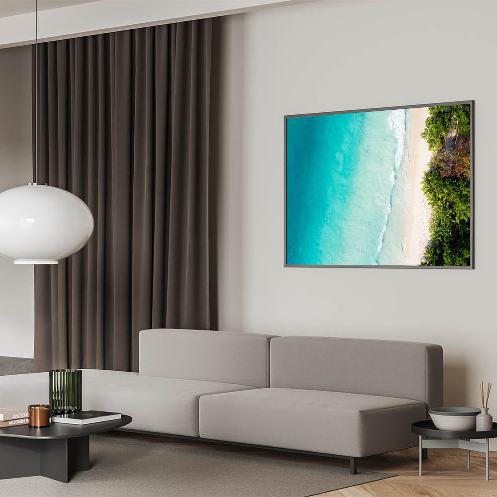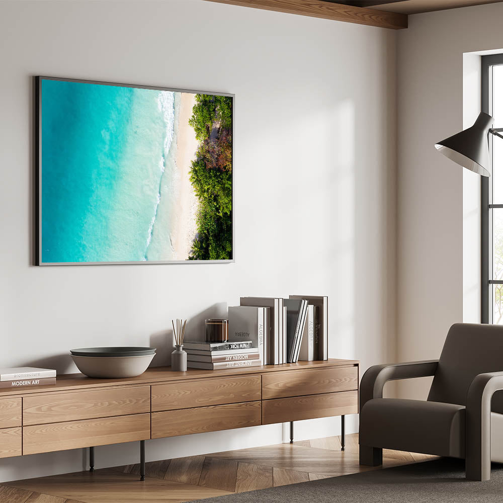 Bring the stunning beauty of Seychelles' coastline into your home with this breathtaking aerial beach wall art. This serene view of turquoise waters gently meeting the sandy shore from above is perfect for anyone who loves tropical island decor and wants to add a touch of calm to their living space.