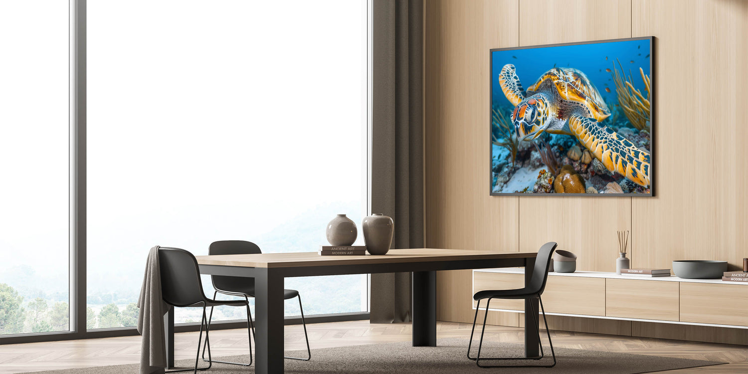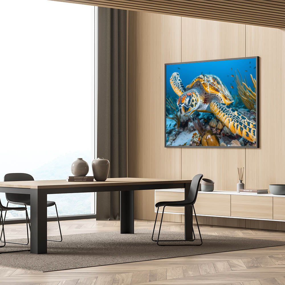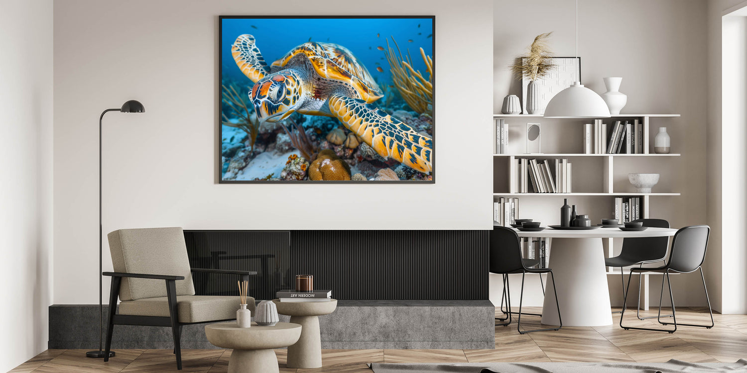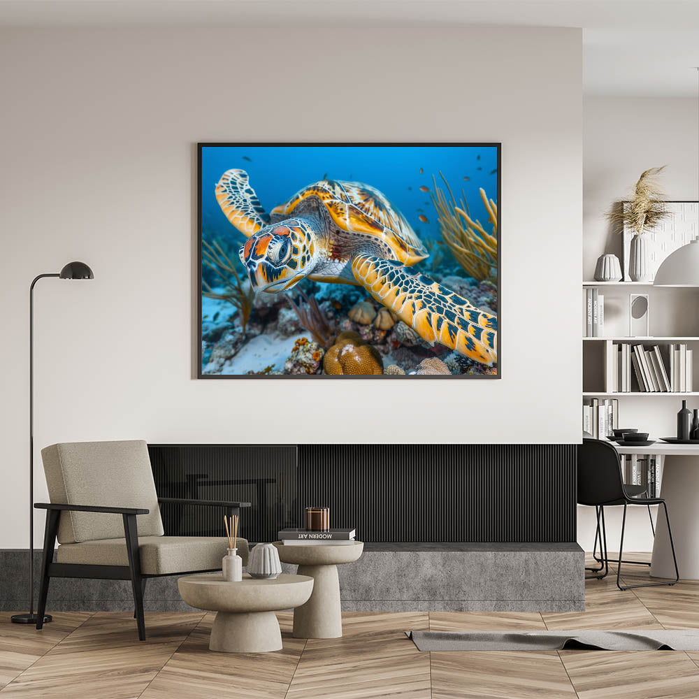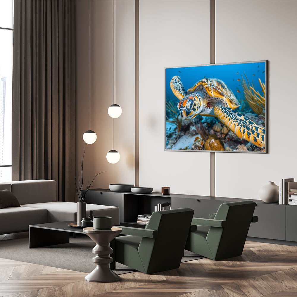 Dive into the mesmerizing underwater world of Seychelles with this captivating Seychelles wall art featuring a beautifully detailed sea turtle. This artwork captures the essence of marine life, showcasing the turtle gliding through vibrant coral reefs. The rich blues of the ocean contrast perfectly with the intricate patterns of the turtle’s shell, making this artwork a striking addition to any room.