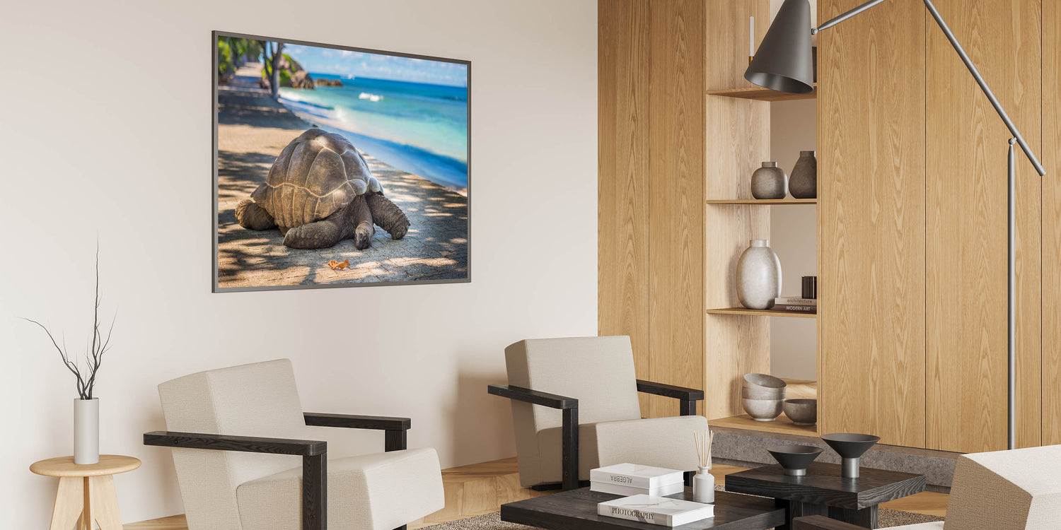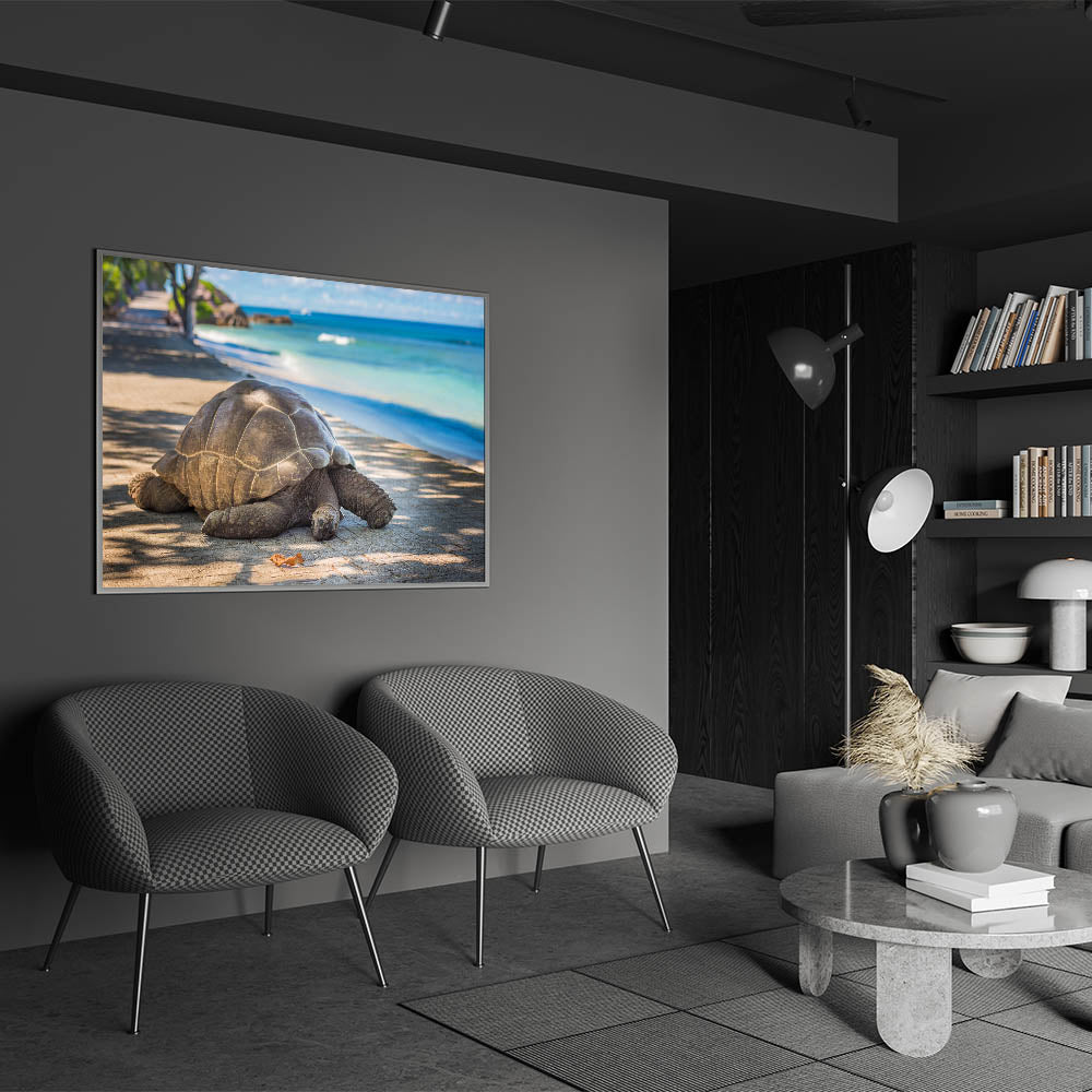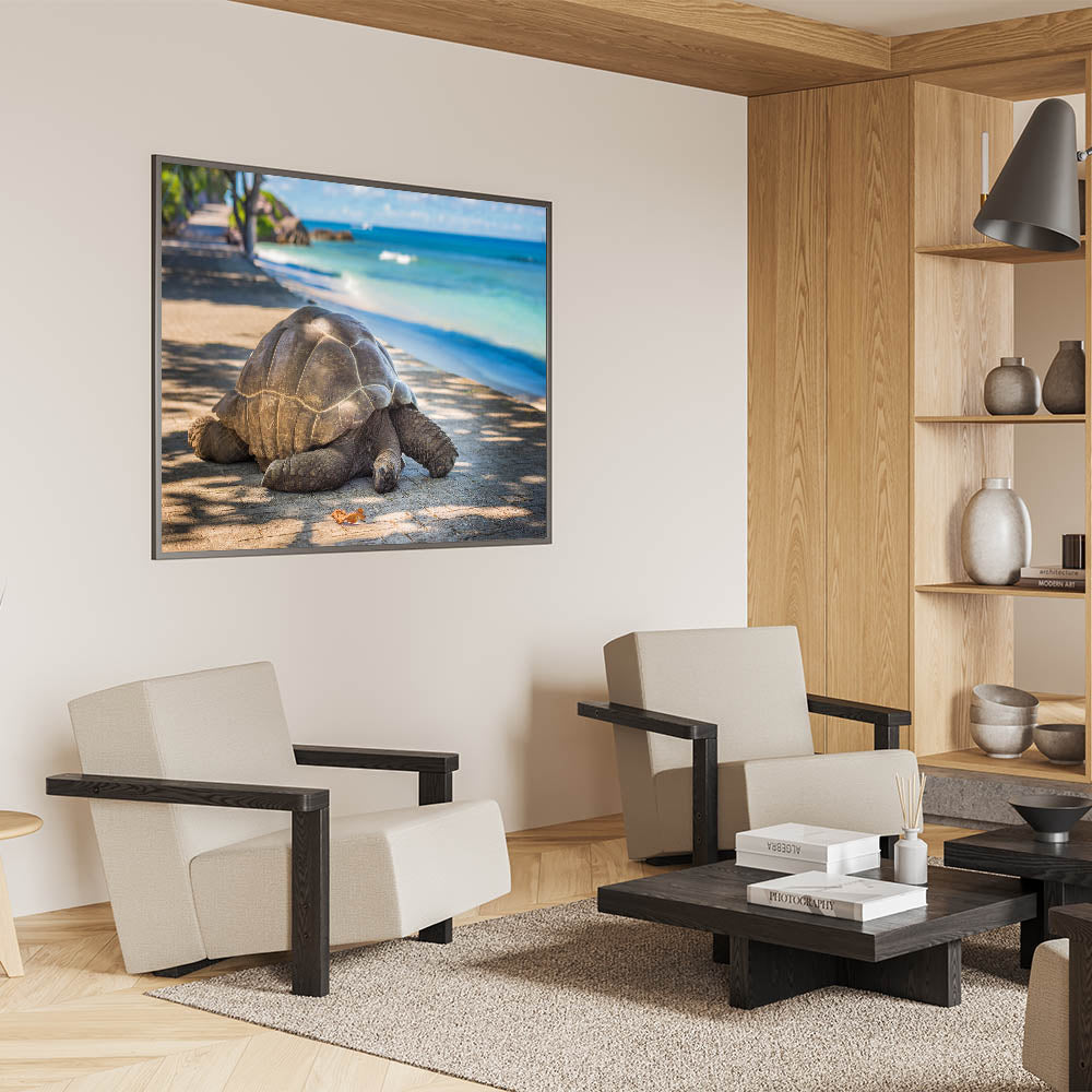 Bring a piece of Seychelles' natural wildlife into your home with this elegant tortoise photography print. Perfect for lovers of nature and tropical island decor, this wall art adds a calming and peaceful touch to your living space.