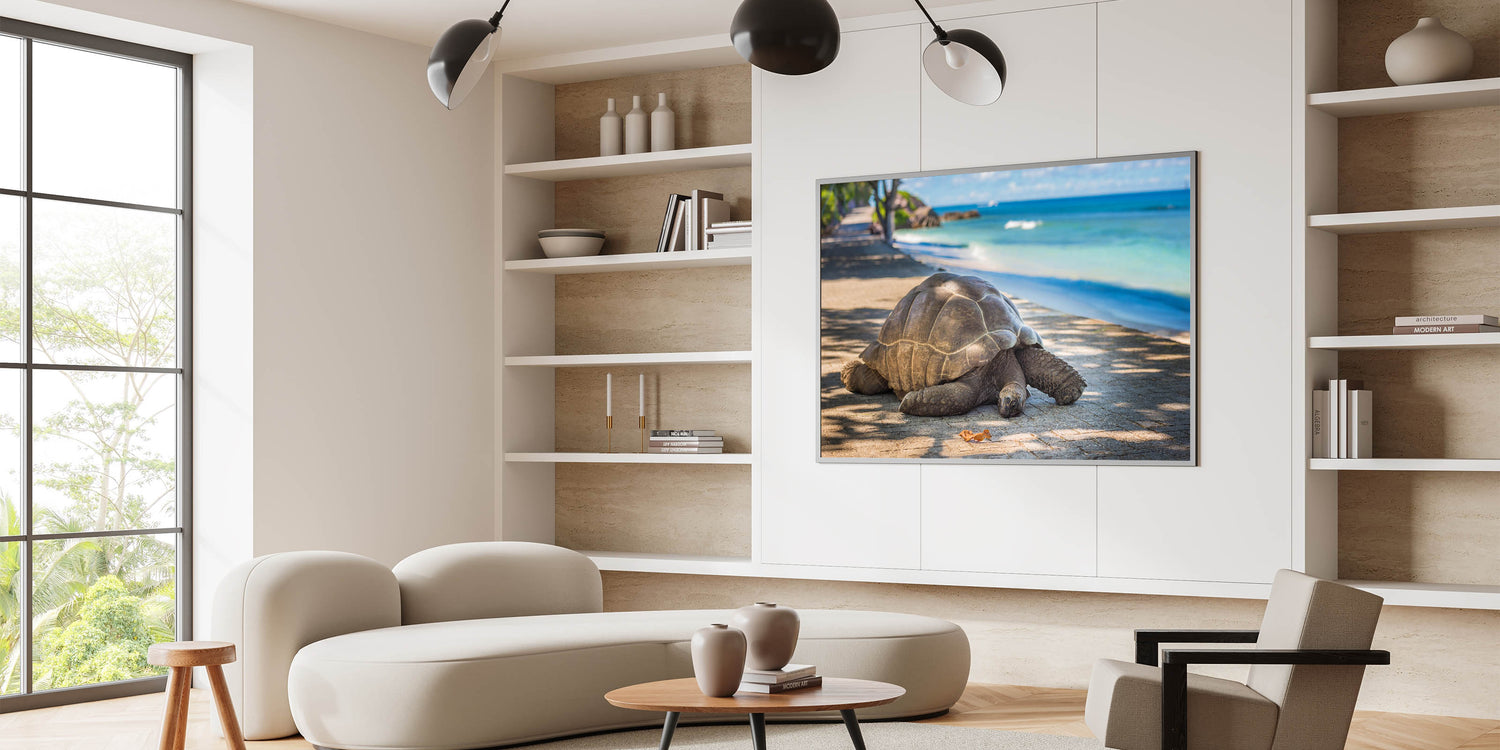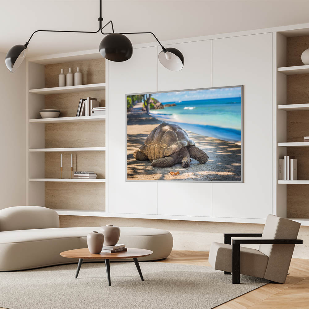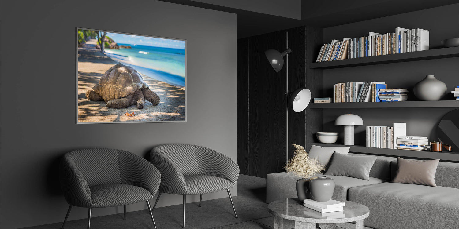 Bring a piece of Seychelles' natural wildlife into your home with this elegant tortoise photography print. Perfect for lovers of nature and tropical island decor, this wall art adds a calming and peaceful touch to your living space.