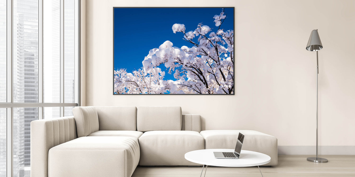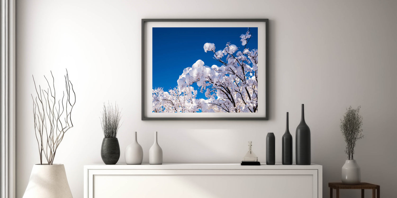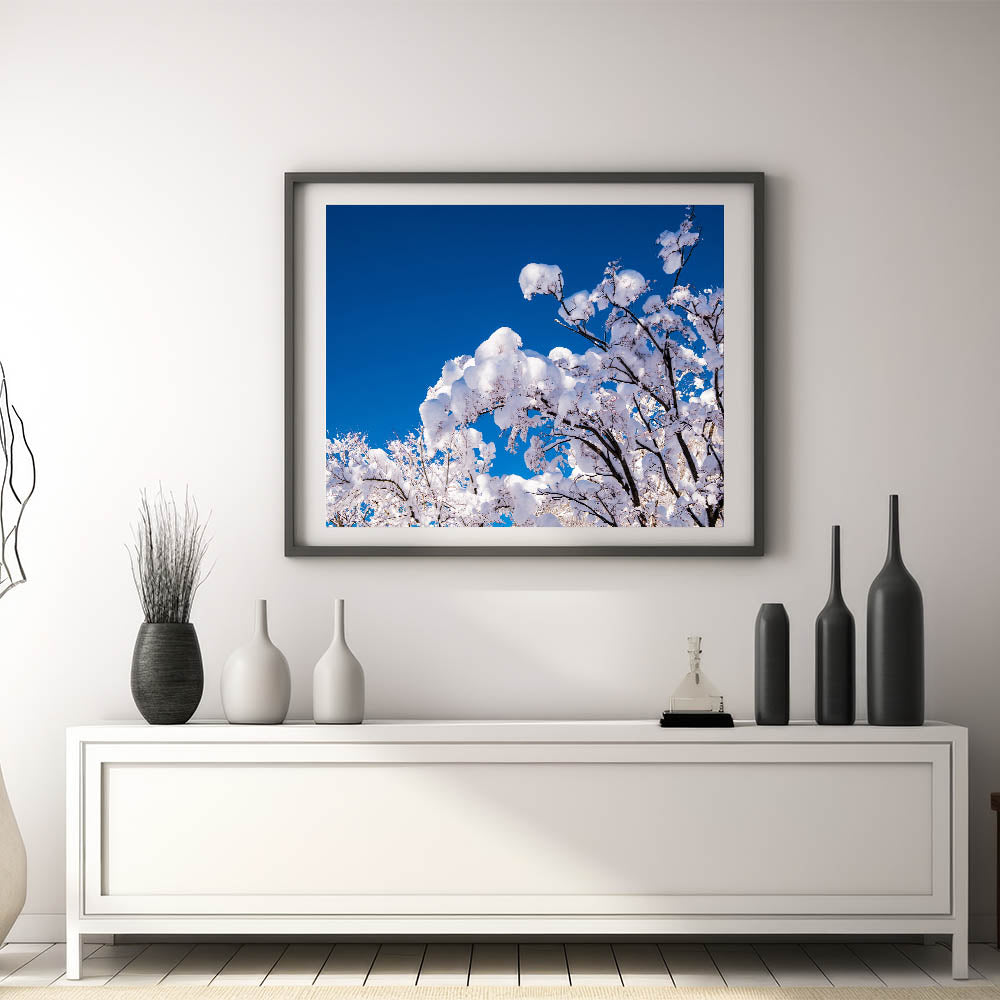 - Features delicate snow-covered branches against a vibrant sky, perfect for enhancing any décor