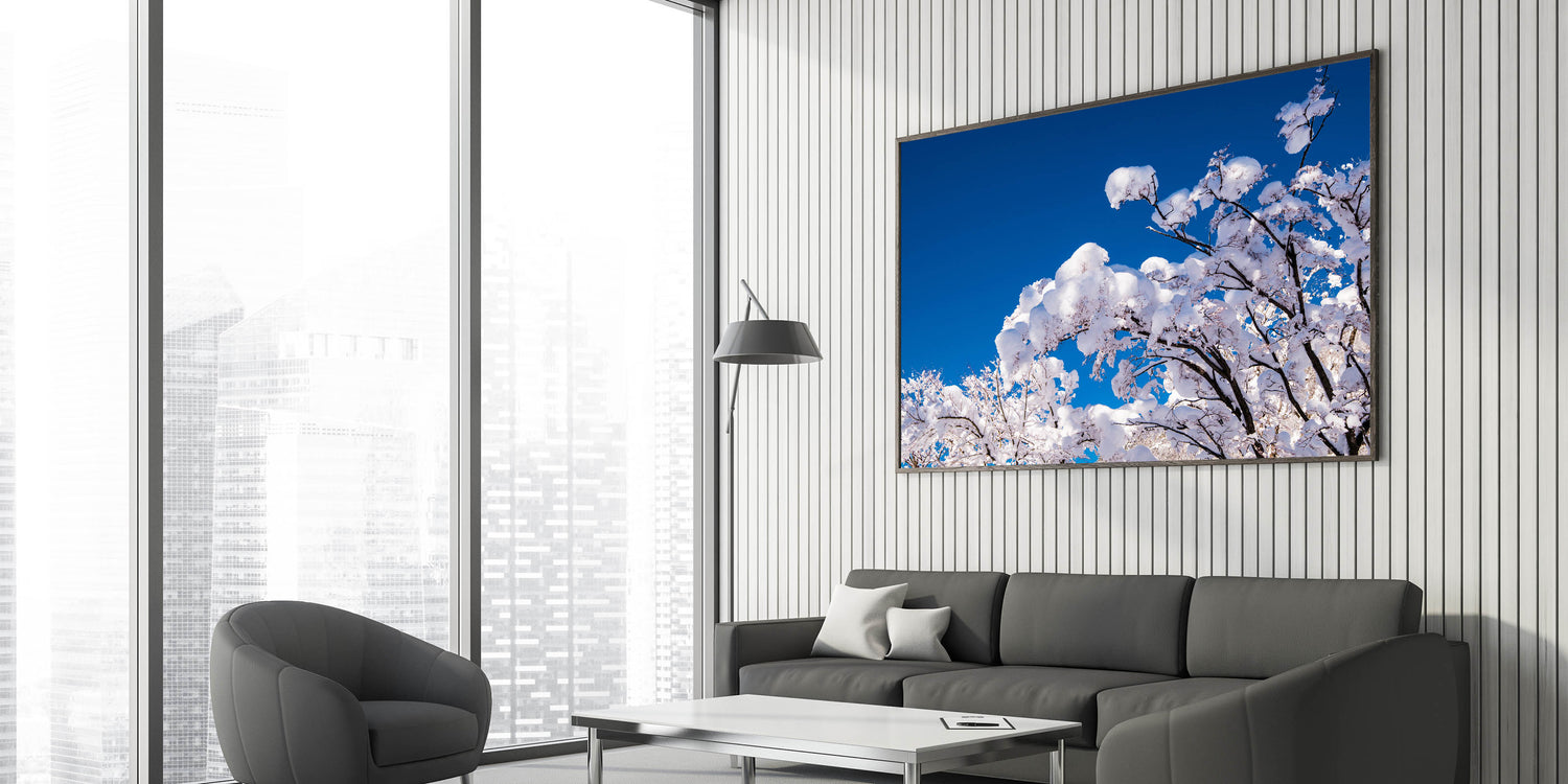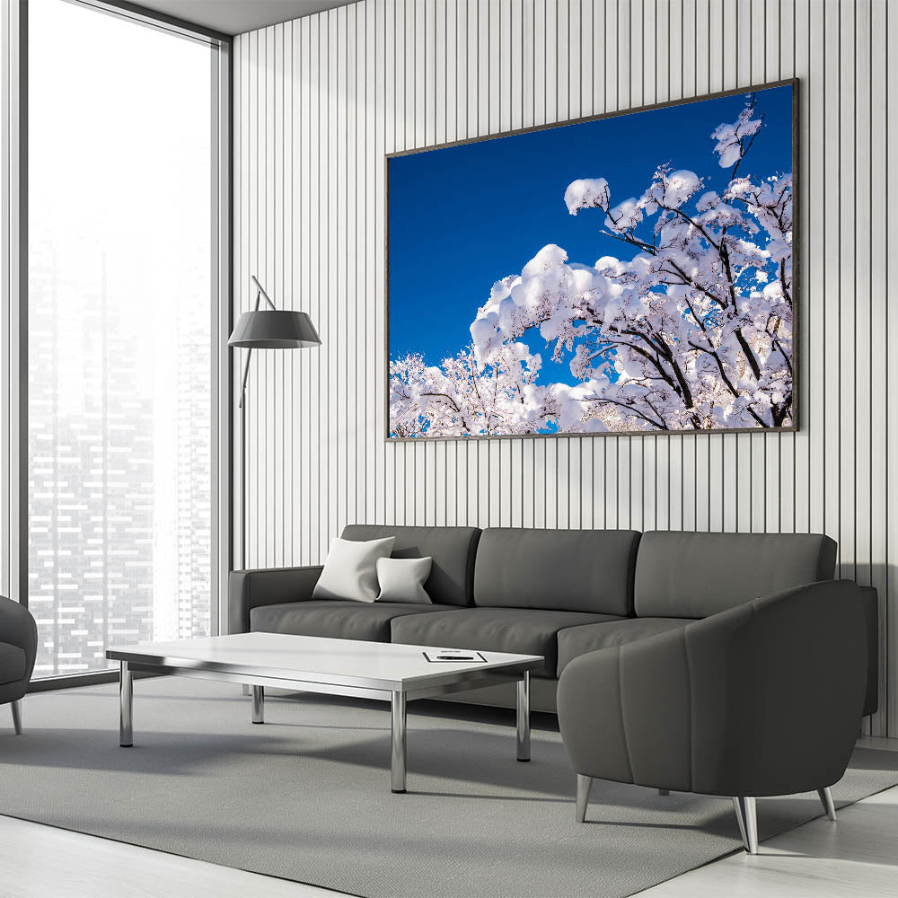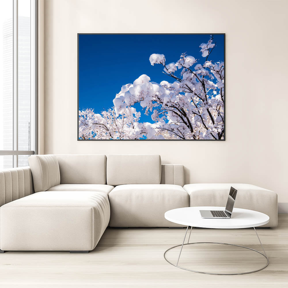 - Features delicate snow-covered branches against a vibrant sky, perfect for enhancing any décor