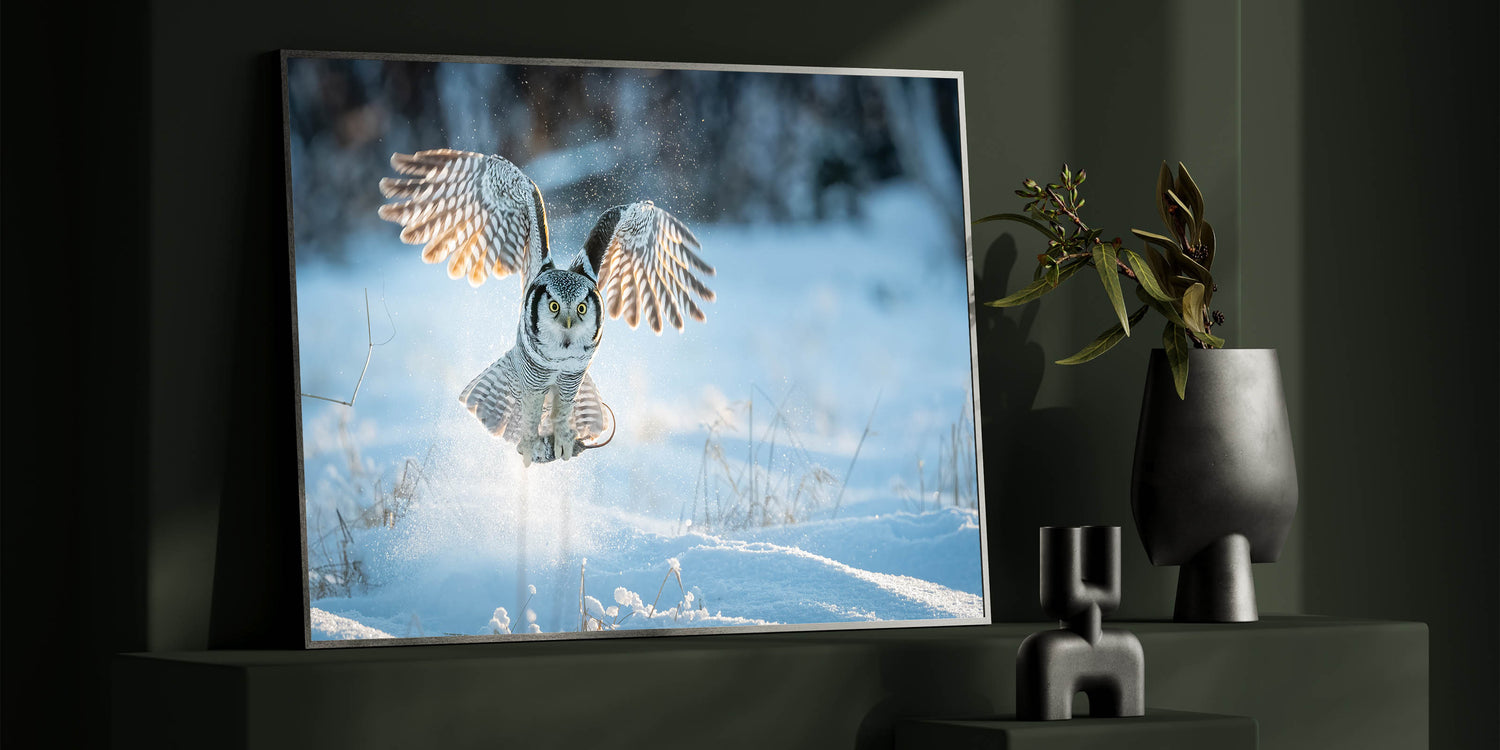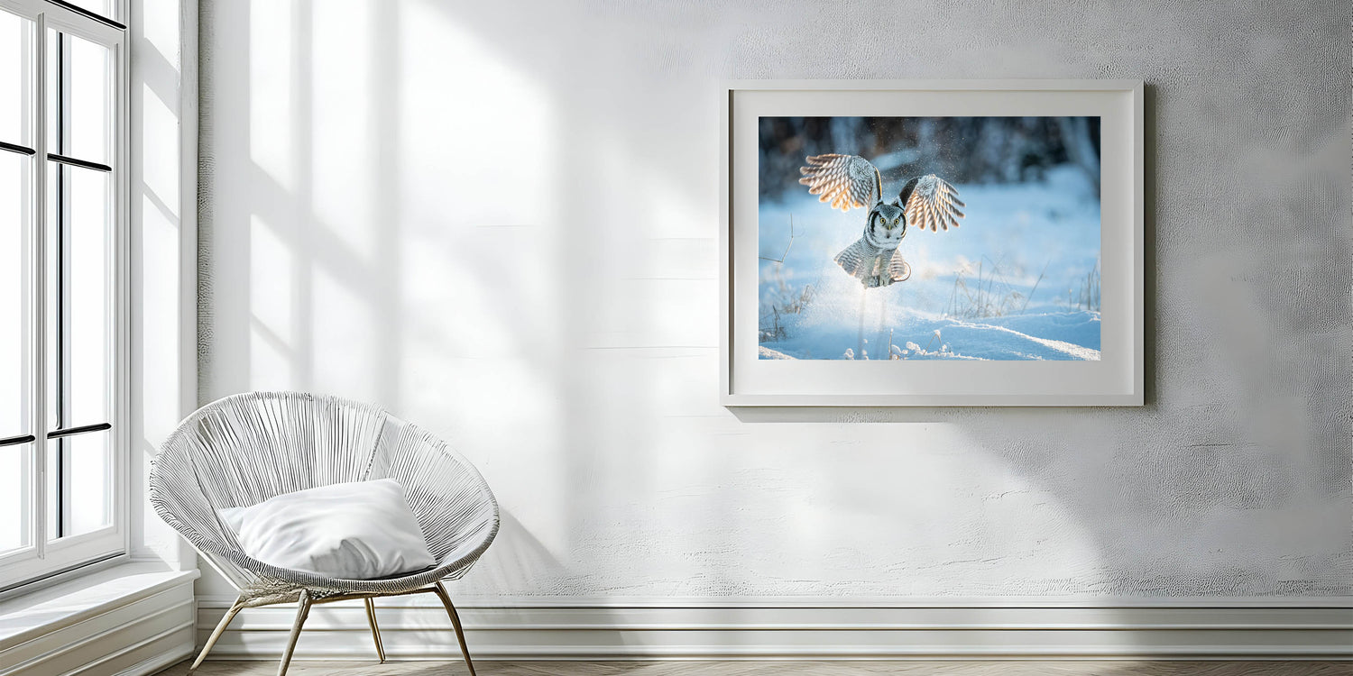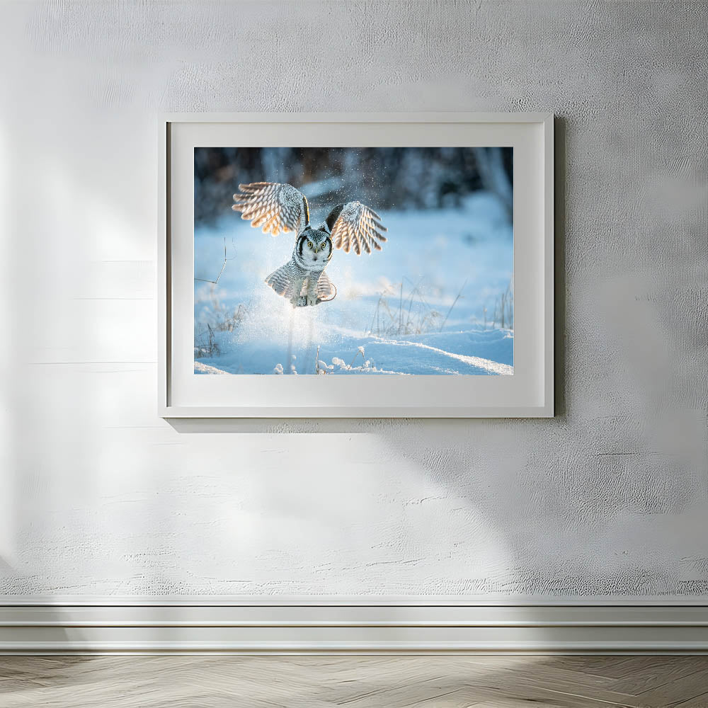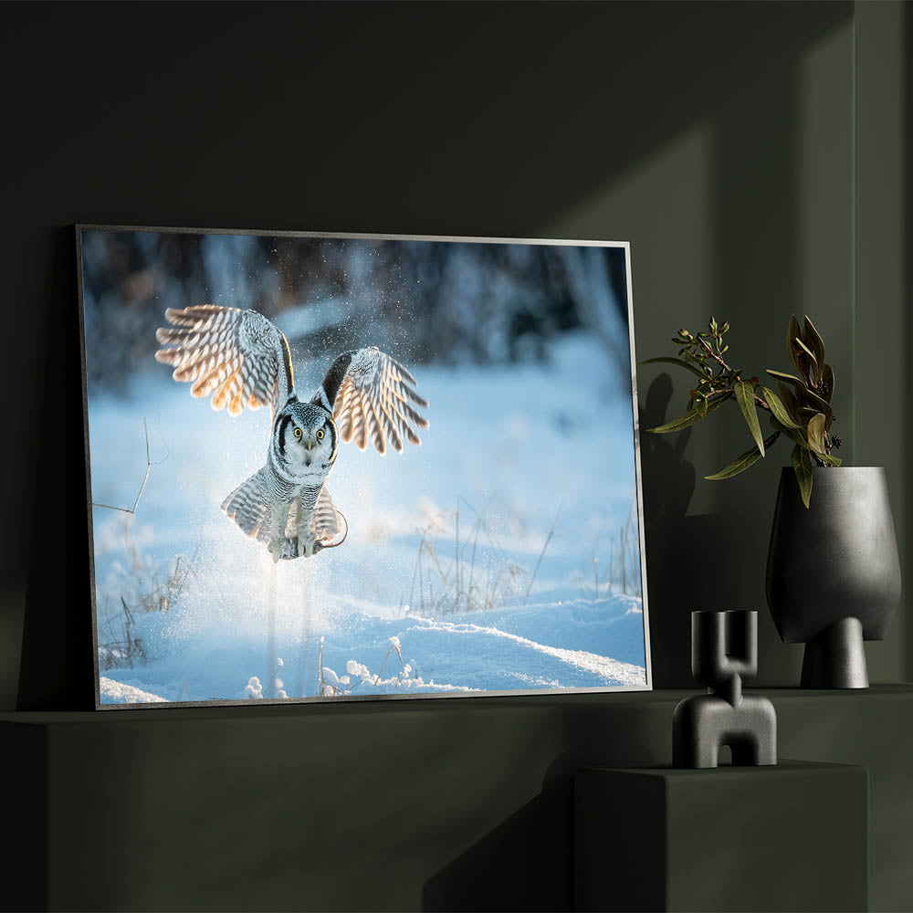 This piece is perfect for nature lovers and those who appreciate the quiet strength of winter landscapes. The contrast between the owl's detailed plumage and the crisp, bright snow creates a visually stunning composition that will add a touch of wilderness and serenity to any room.