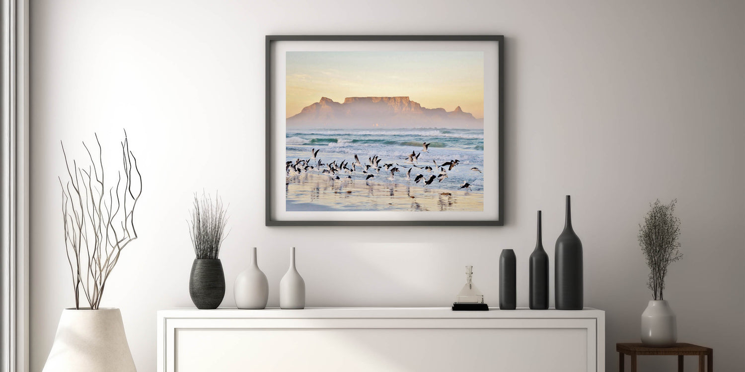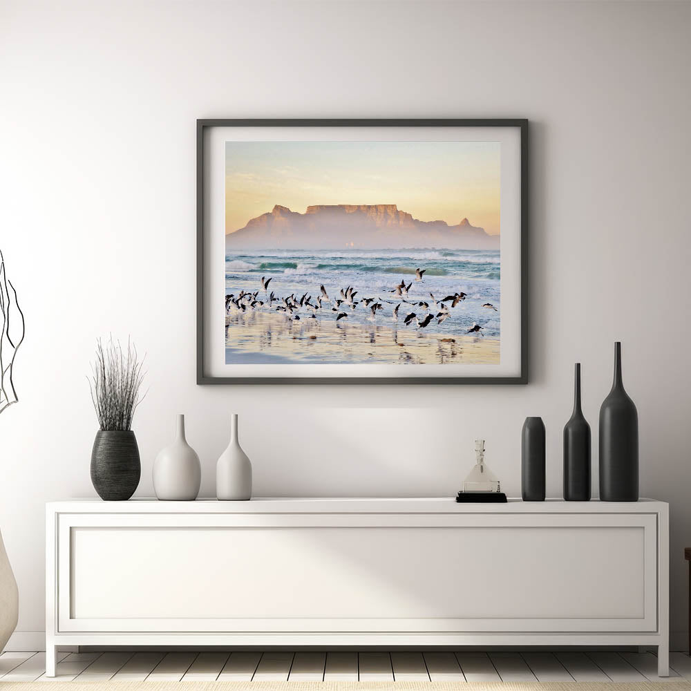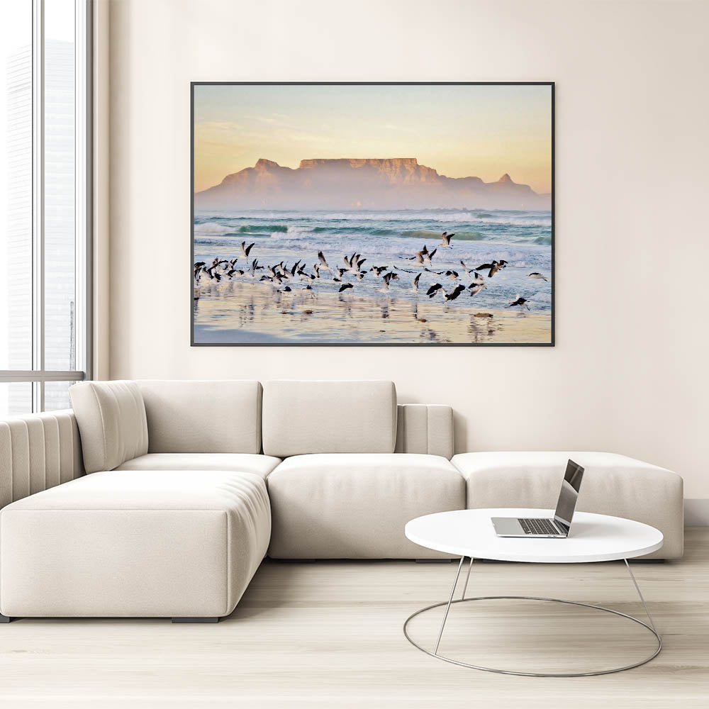 Explore the breathtaking beauty of Cape Town with this stunning wall art showcasing the majestic Table Mountain and the serene beach landscape. Captured during a peaceful morning, the seagulls in flight add a sense of life and movement to this tranquil scene. Perfect for anyone looking to bring a touch of South Africa's natural charm into their home.
