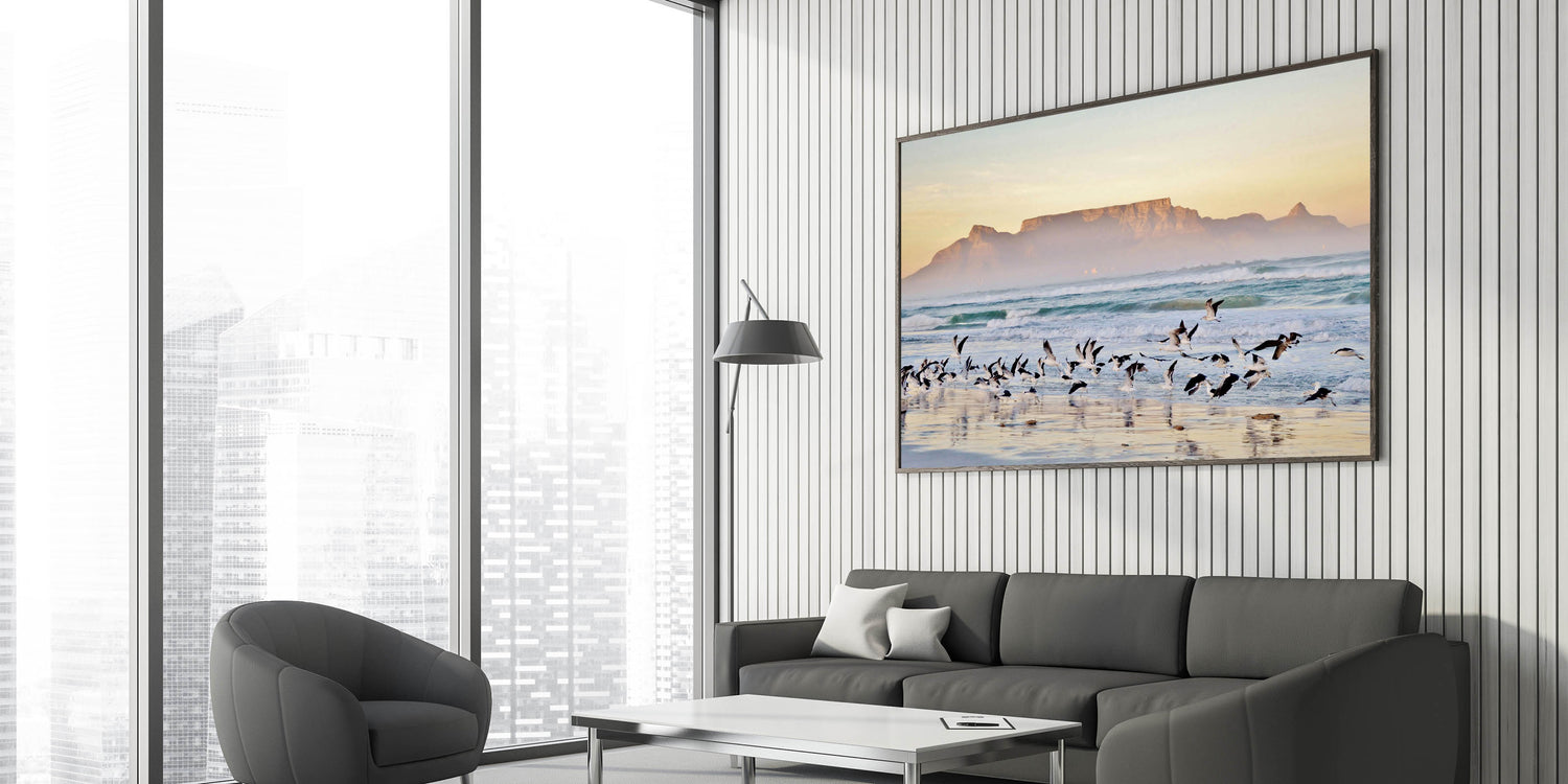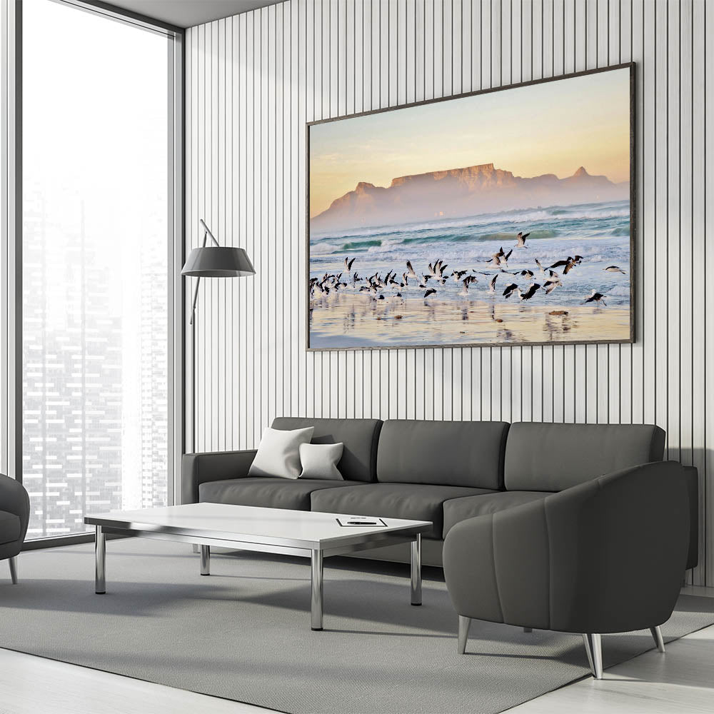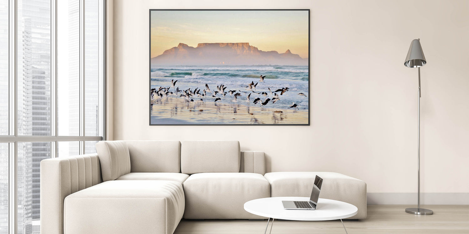 Explore the breathtaking beauty of Cape Town with this stunning wall art showcasing the majestic Table Mountain and the serene beach landscape. Captured during a peaceful morning, the seagulls in flight add a sense of life and movement to this tranquil scene. Perfect for anyone looking to bring a touch of South Africa's natural charm into their home.