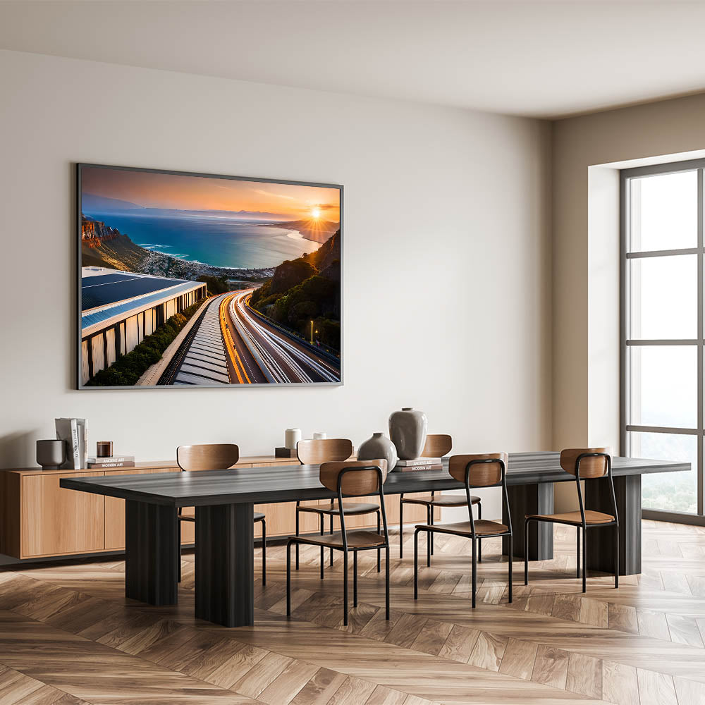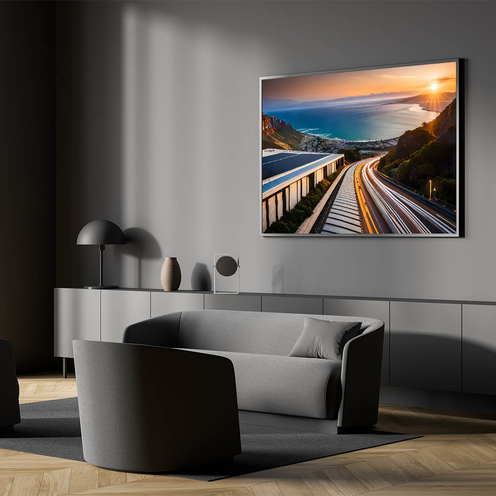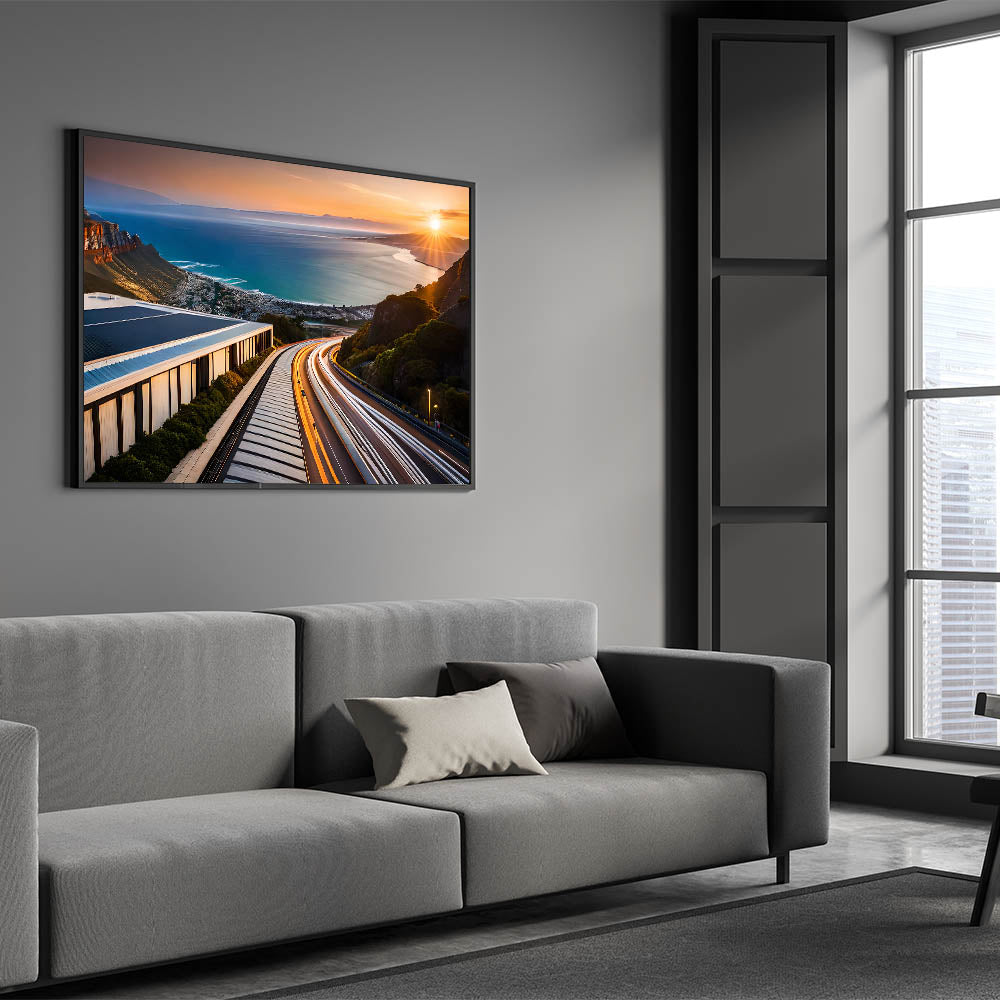 Experience the breathtaking beauty of South Africa’s coastline with this striking wall art featuring a stunning sunset over a winding coastal road. The vibrant streaks of light from the road’s traffic blend seamlessly with the warm colors of the setting sun, while the expansive view of the ocean stretches into the horizon. This artwork captures the dynamic contrast between the tranquility of the ocean and the vibrant energy of the road, making it a perfect piece for lovers of travel, adventure, and scenic beauty.